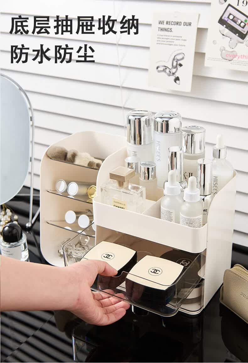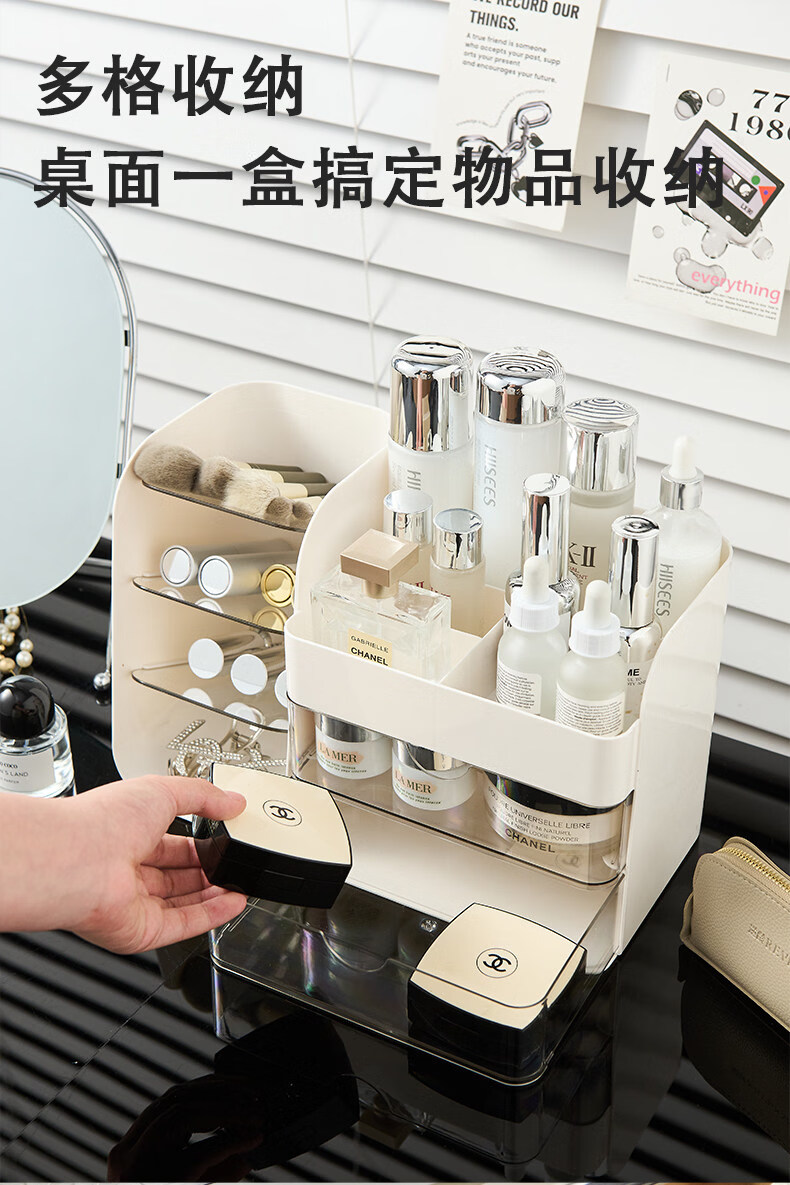 艾仕可(ASCOR)化妆品收纳盒桌面大容量多层防尘透明护肤品置物架高级感梳妆台箱 奶油白-多功能化妆盒【磁吸开合+口红格+化妆刷筒】
