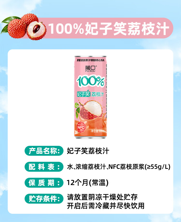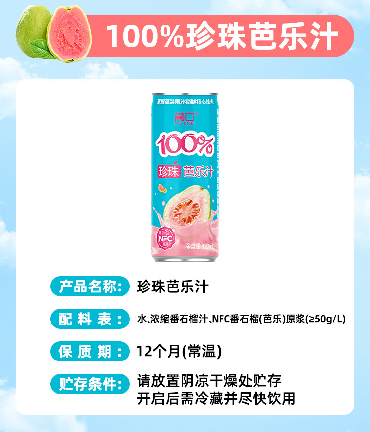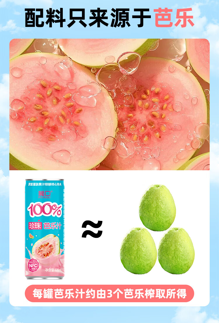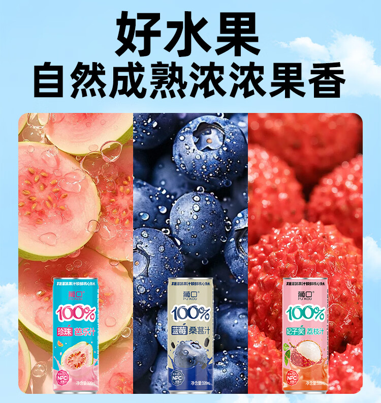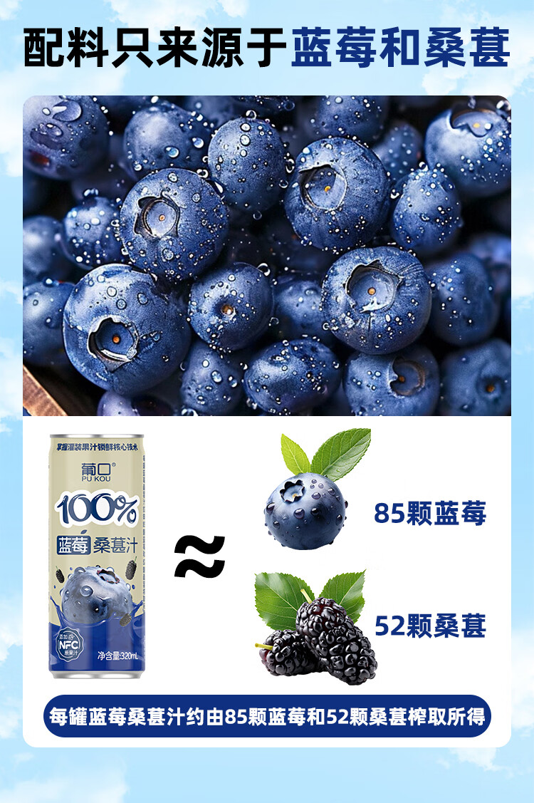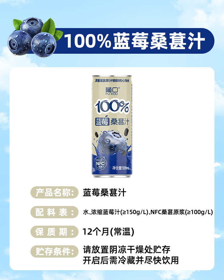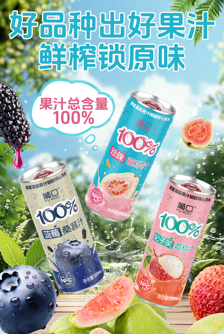葡口100%芭乐汁清甜解腻饮料添加NFC原浆聚餐健康饮品配料干净0脂肪 【蓝莓桑葚汁】320ml*6罐 日期新鲜破损包赔