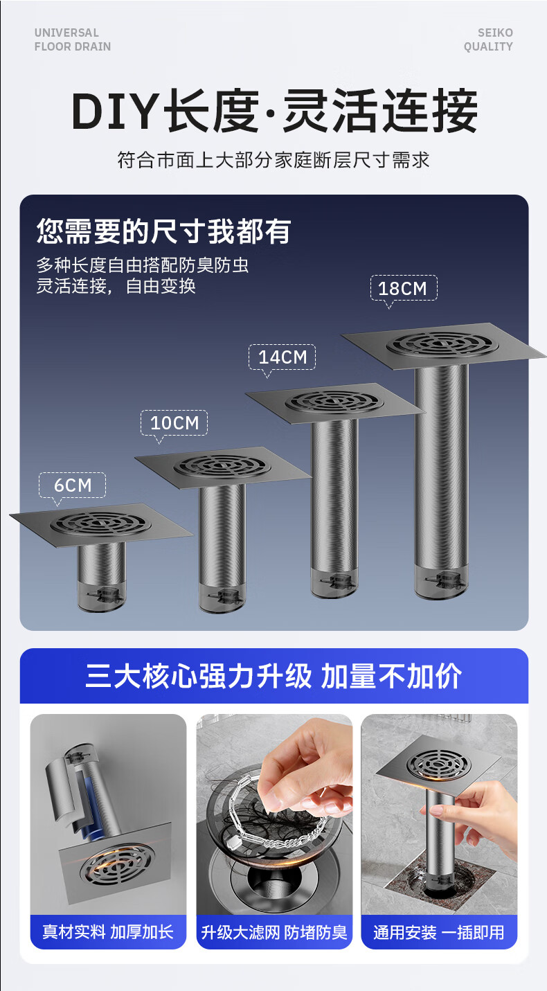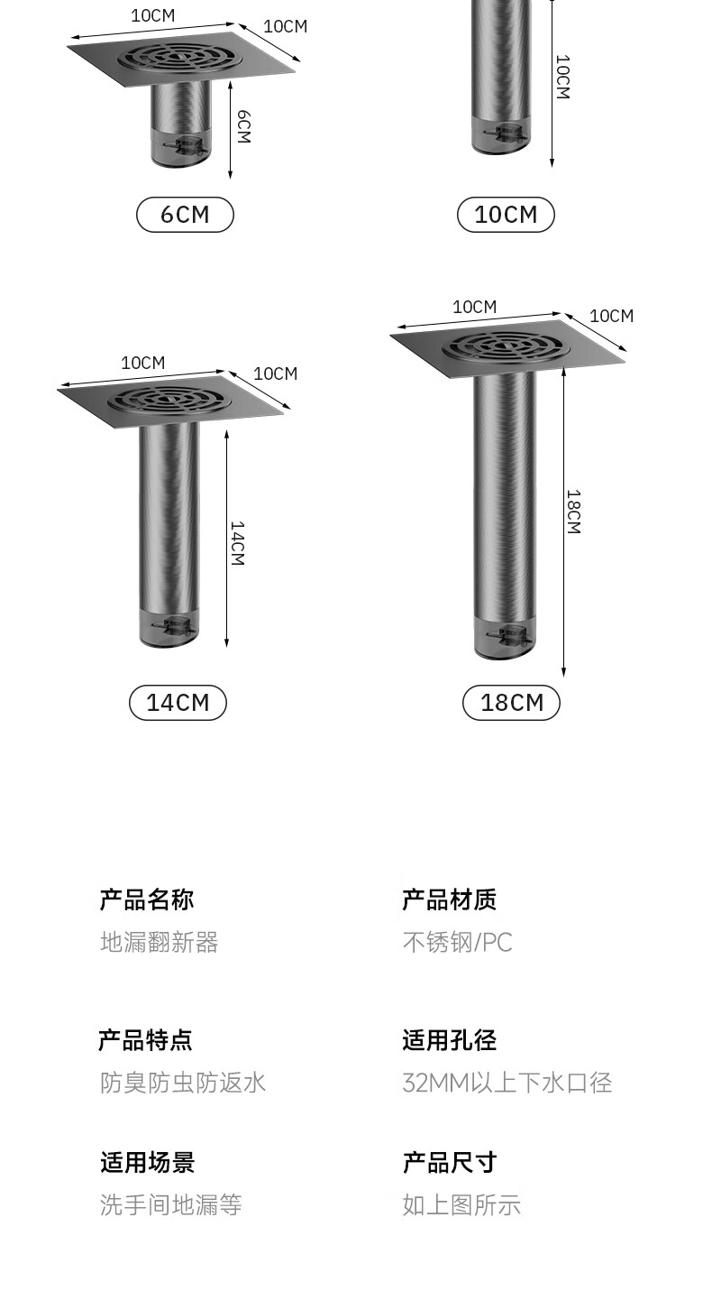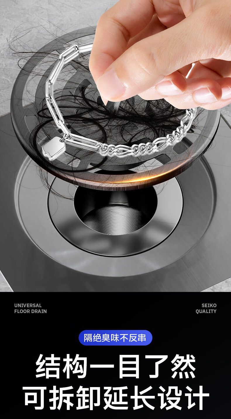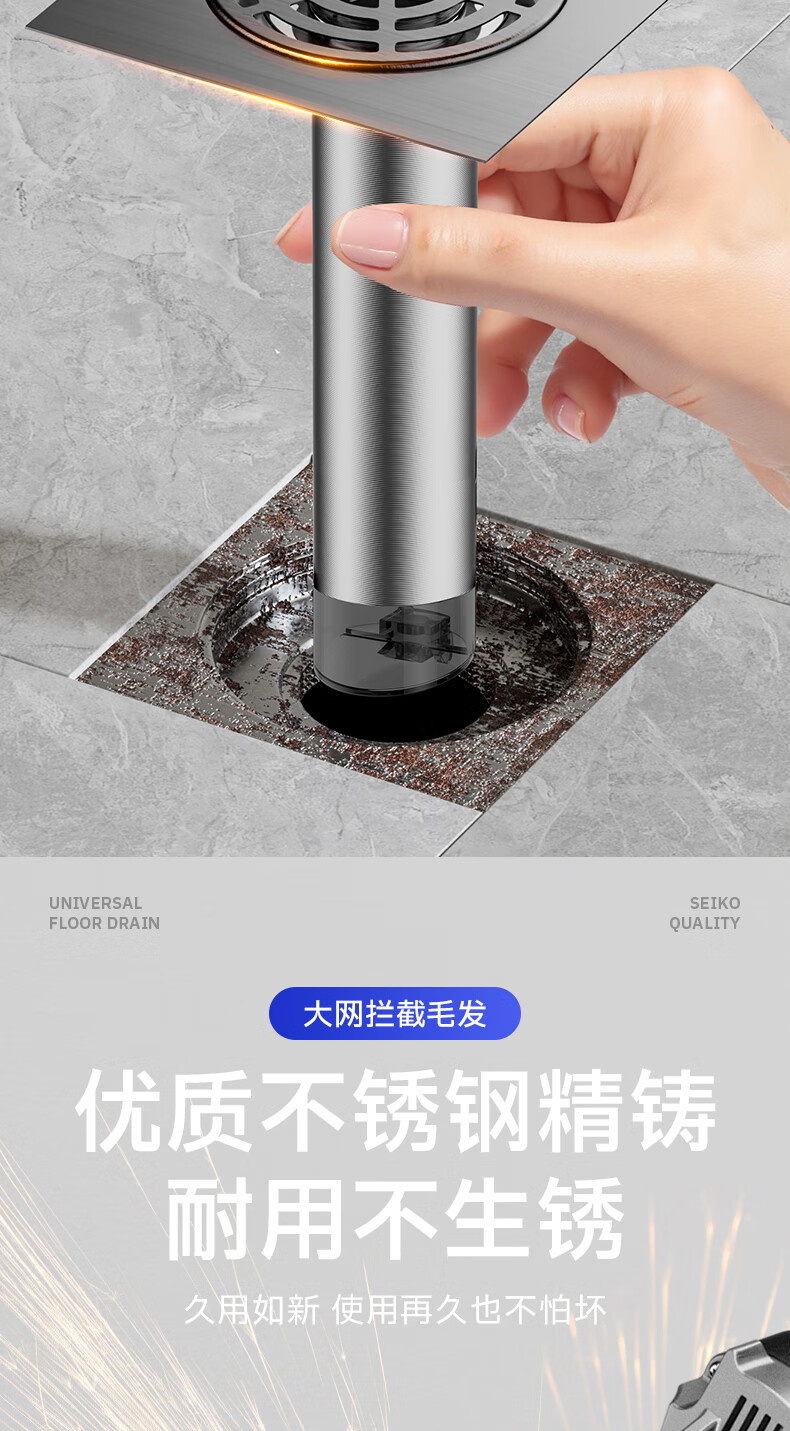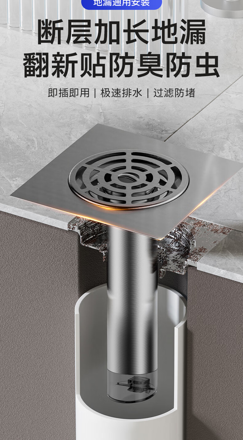 Jeonestan【德国】不锈钢断层地漏翻新器改造卫生间下水道盖板过滤防臭堵塞 【短款】大滤网断层防臭地漏贴