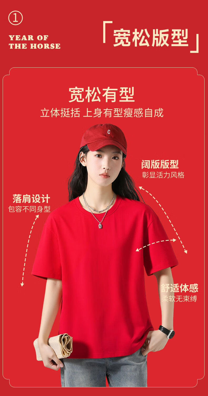 真维斯(Jeanswest)新年红色t恤男2026年新款马年跨年衣服纯棉短袖本命年男士红半袖 红色 金一马当先 L