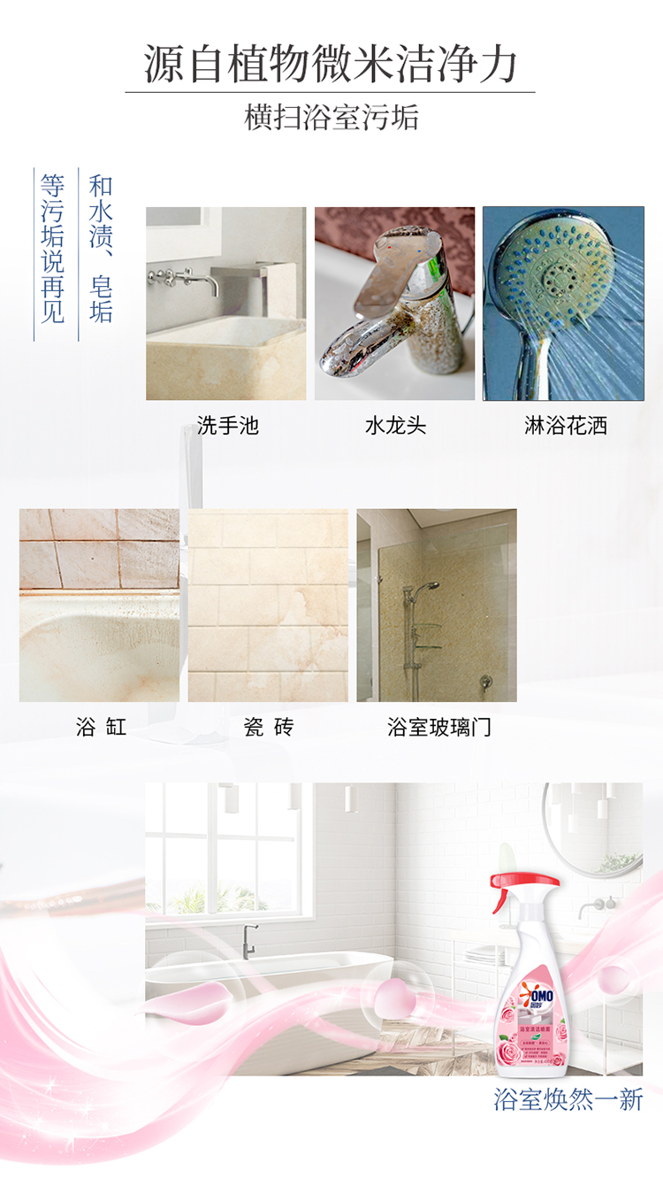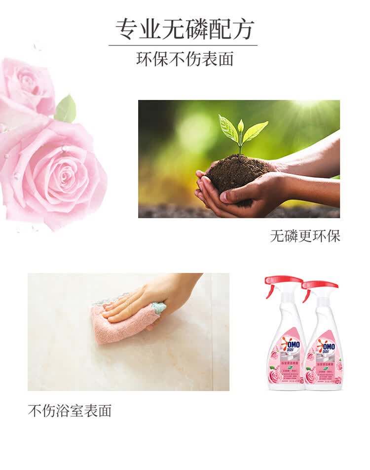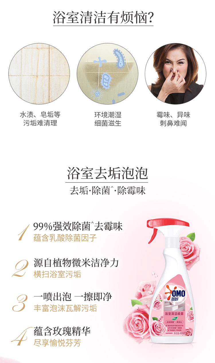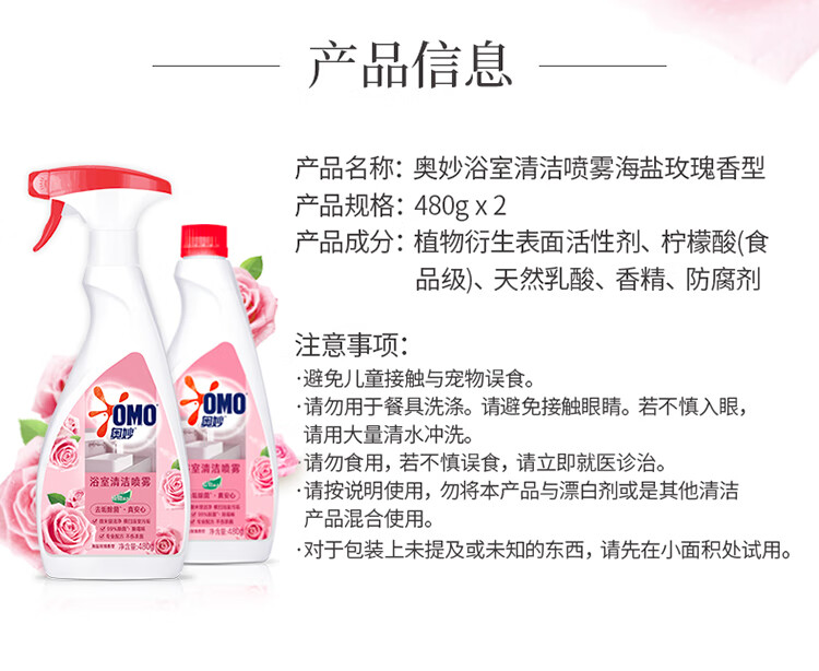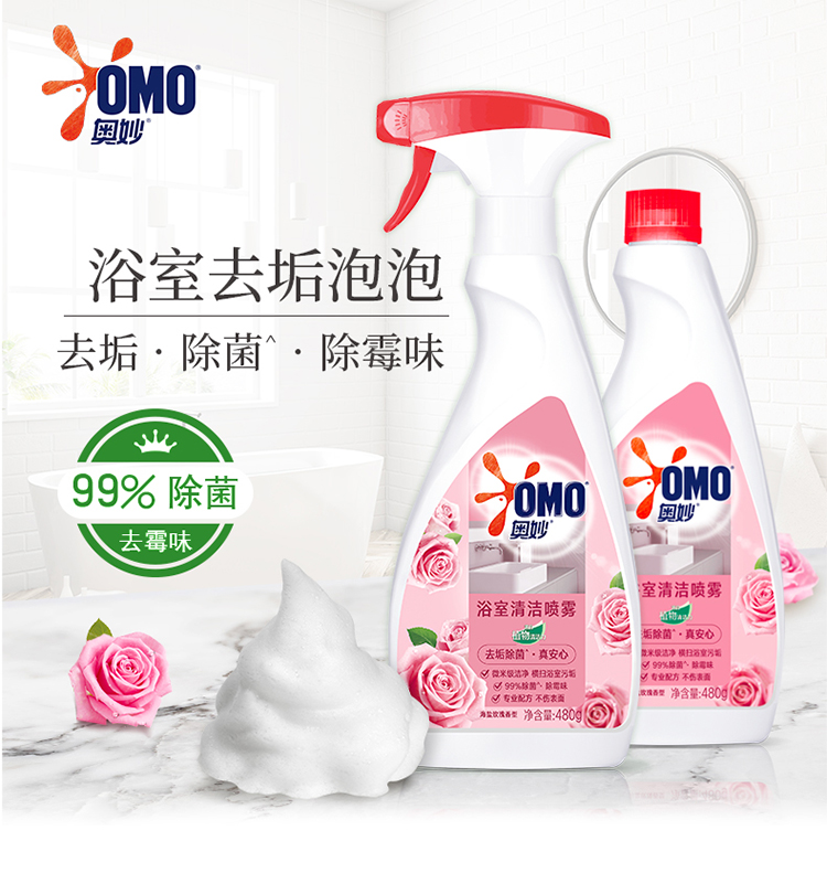 奥妙浴室清洁喷雾双瓶装480g×2 海盐玫瑰泡泡 强效除菌除霉味去污垢