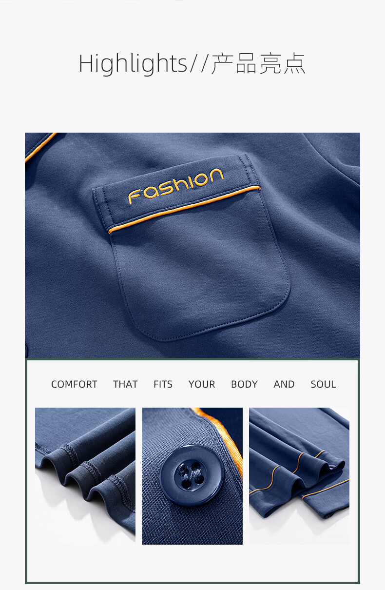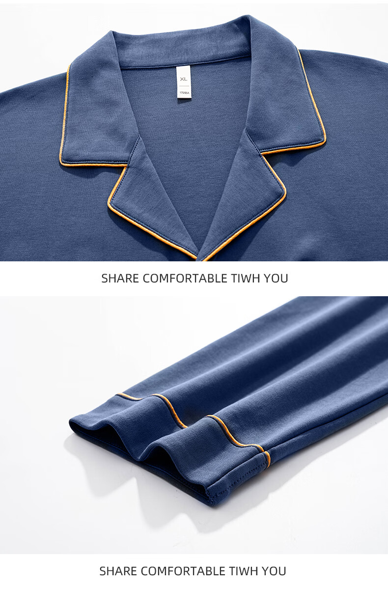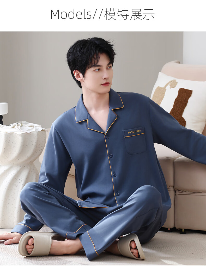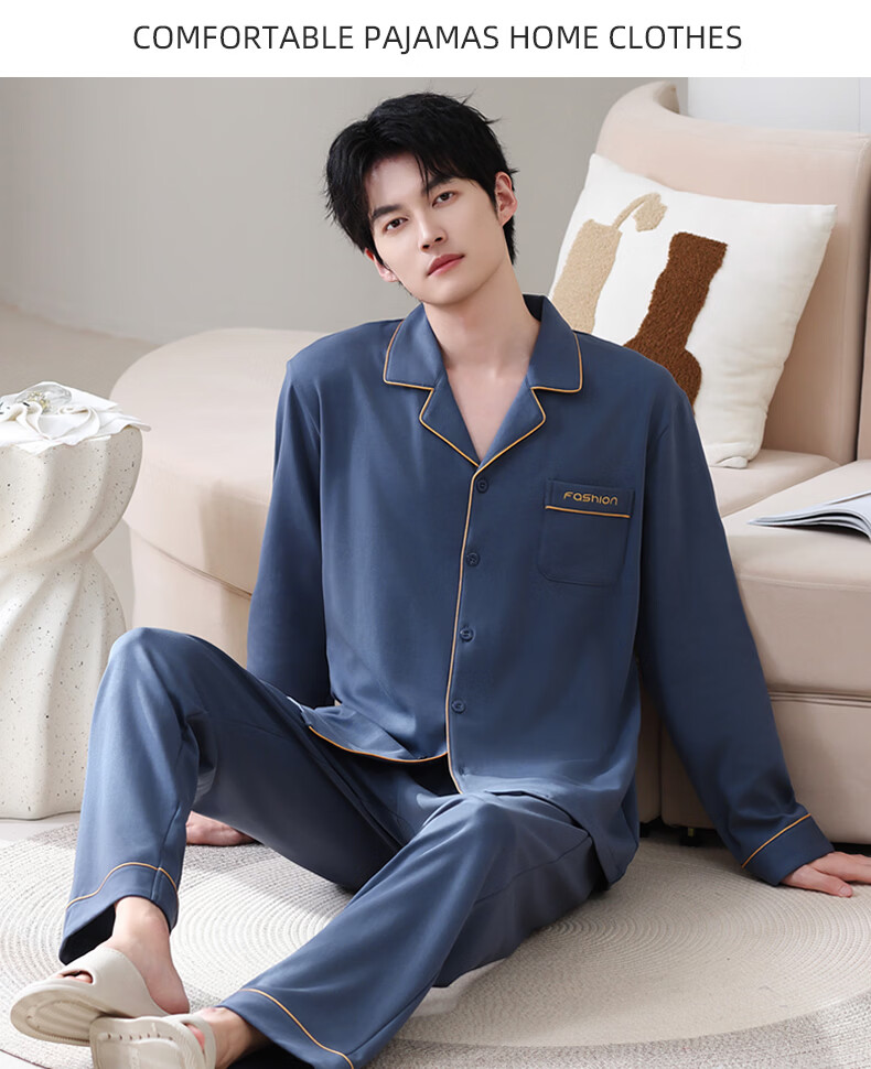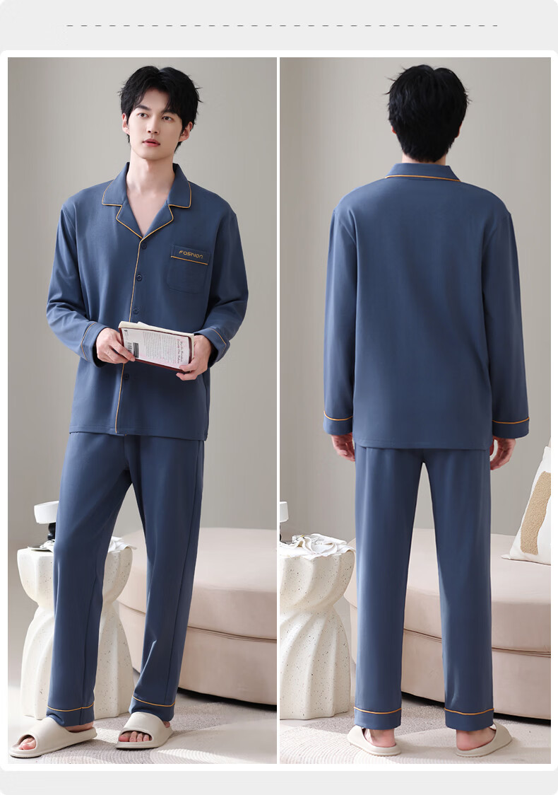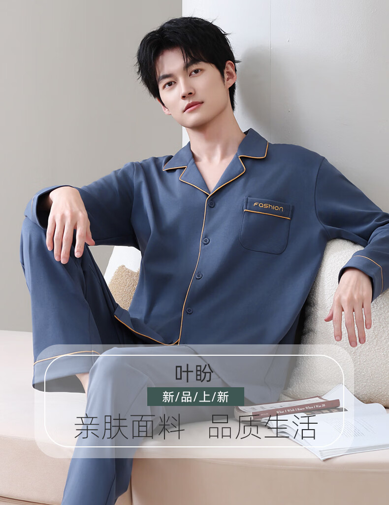 叶盼(yepan)【柔软】莱卡纯棉睡衣男士春秋长袖宽松大码高级感男款家居服套装 8701-蓝灰 L (170) :建议100-135斤穿着