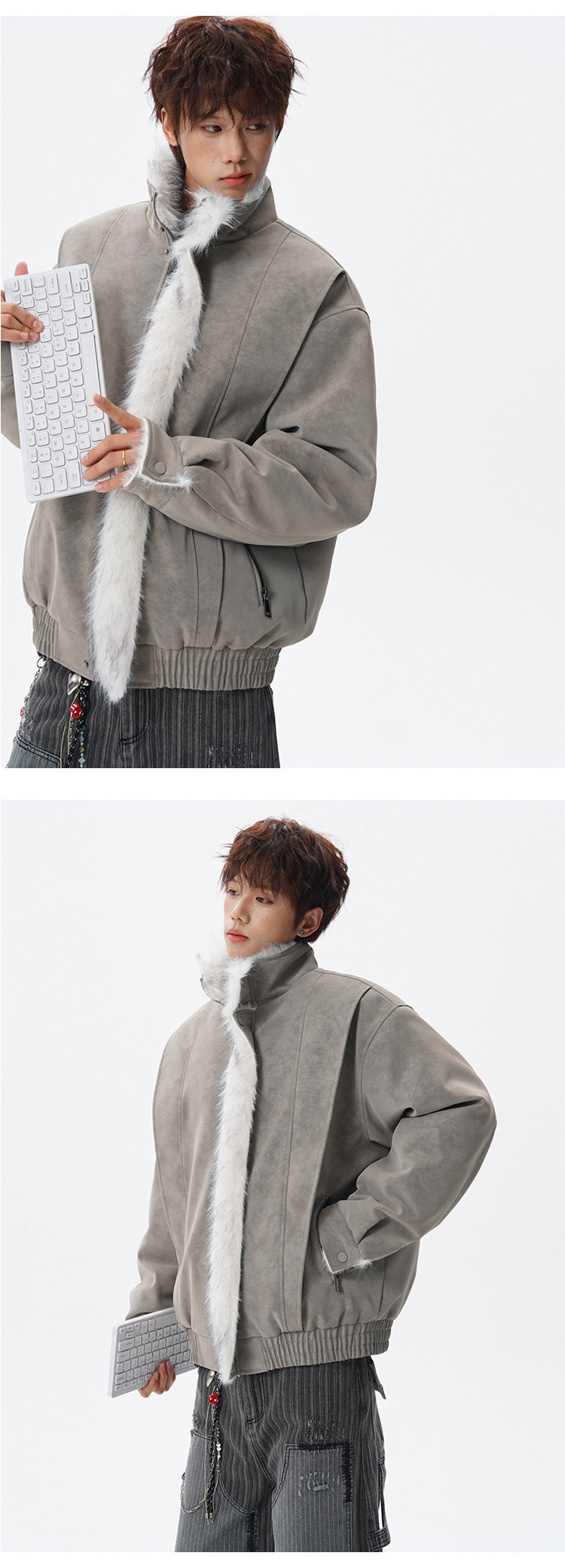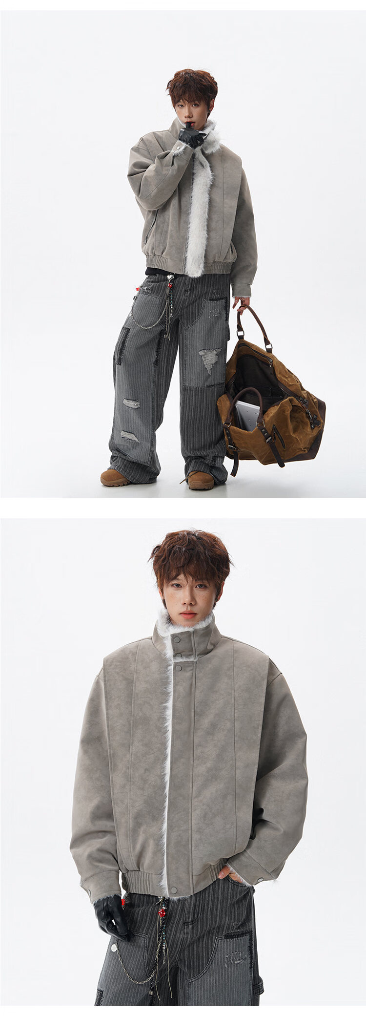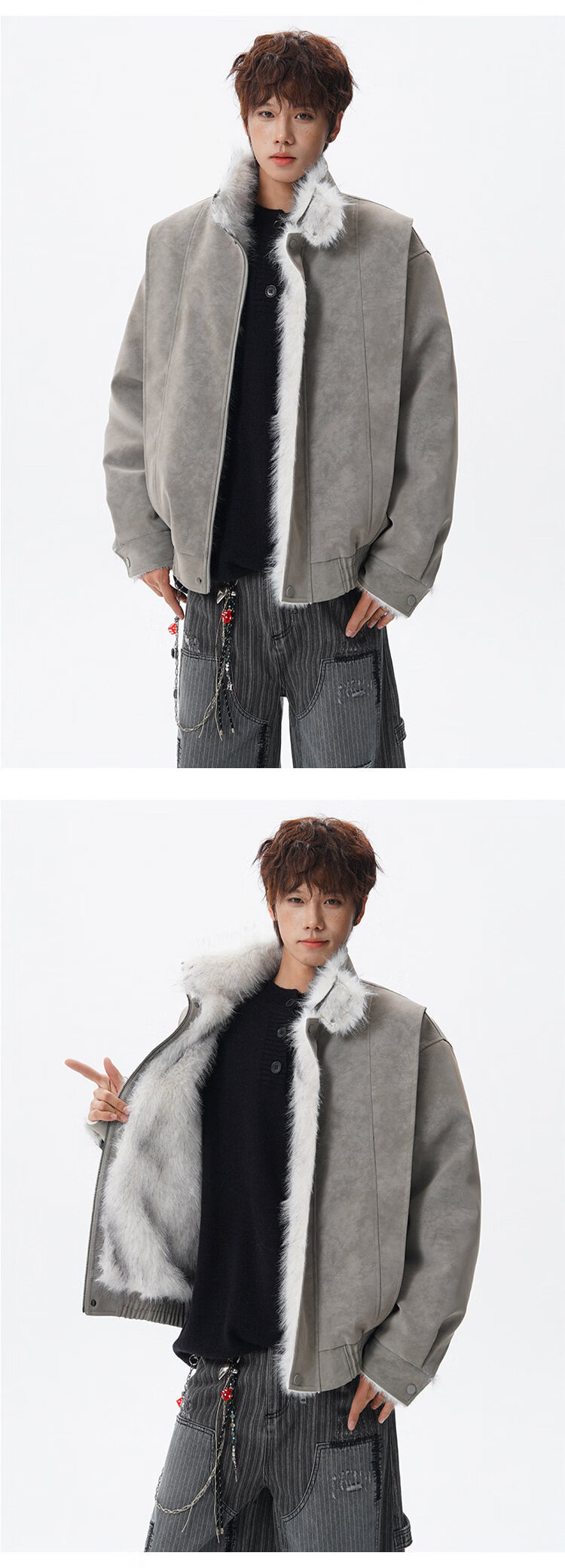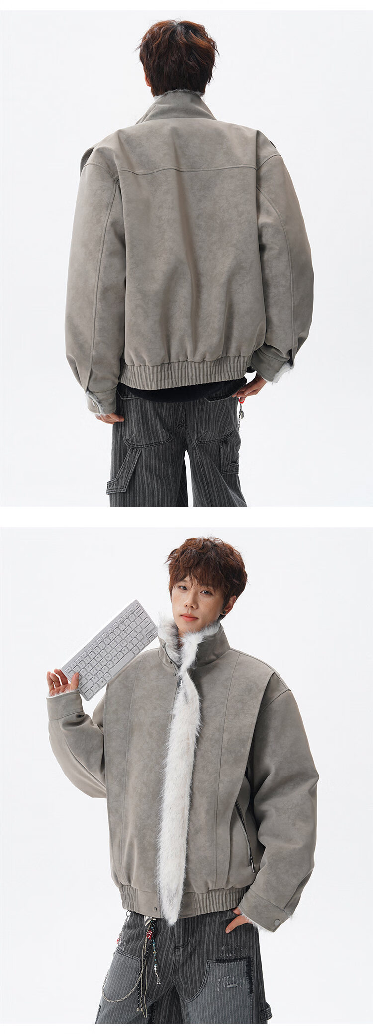 NEW OR MODE美式加绒加厚毛领座山雕棉服男冬季新款保暖宽松潮牌PU皮棉衣外套 灰色 M 【建议90-110斤】