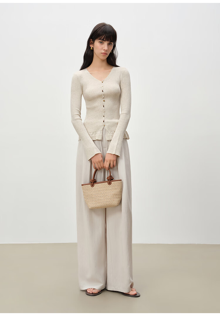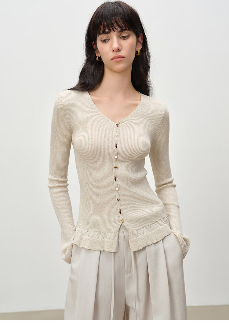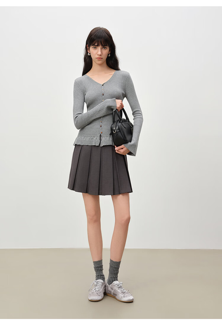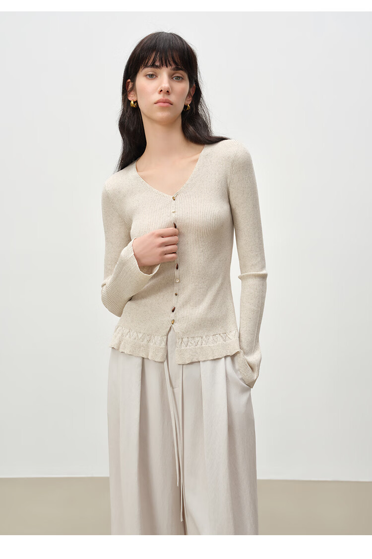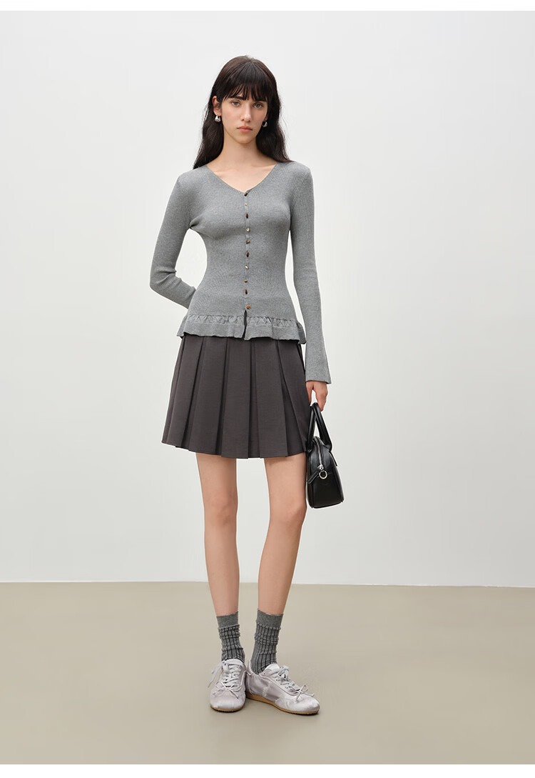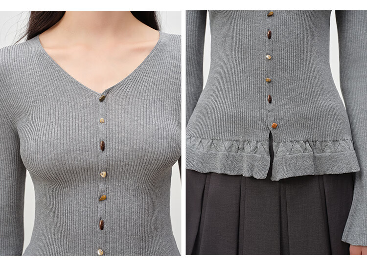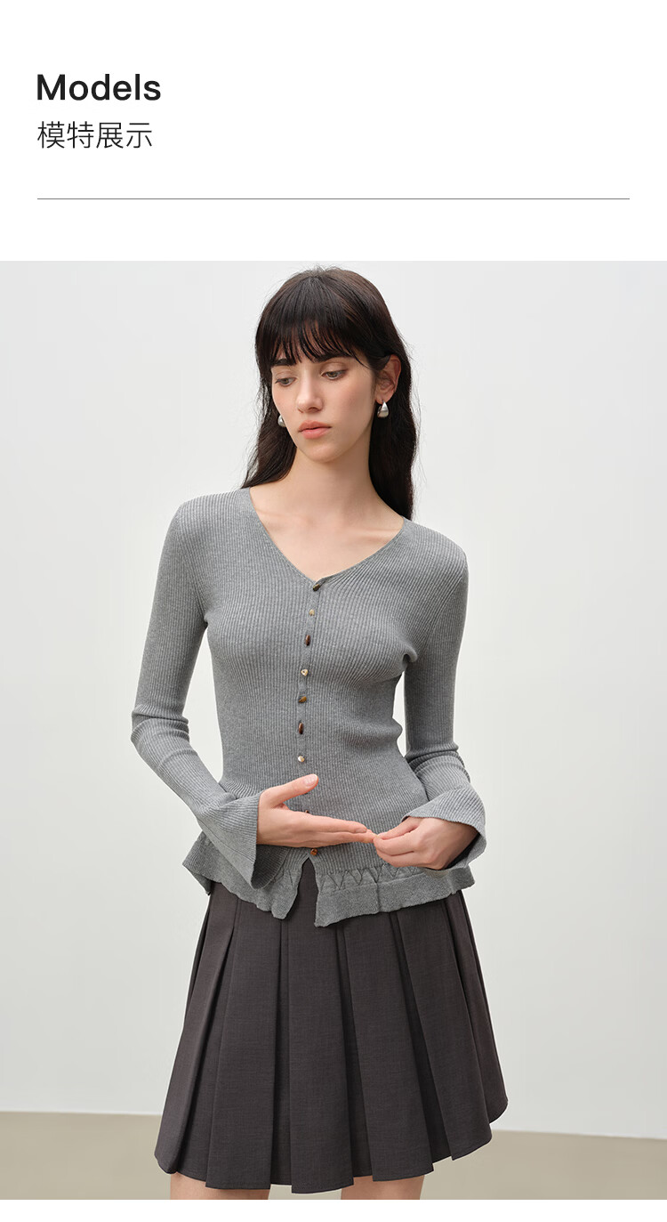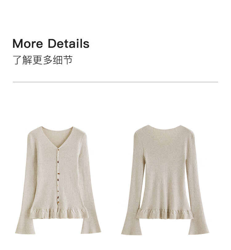 自巧小个子浪漫荷叶边修身v领正肩针织衫女喇叭袖2026年春季新品 燕麦灰 S (尺码:3)