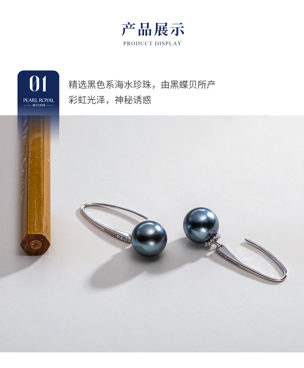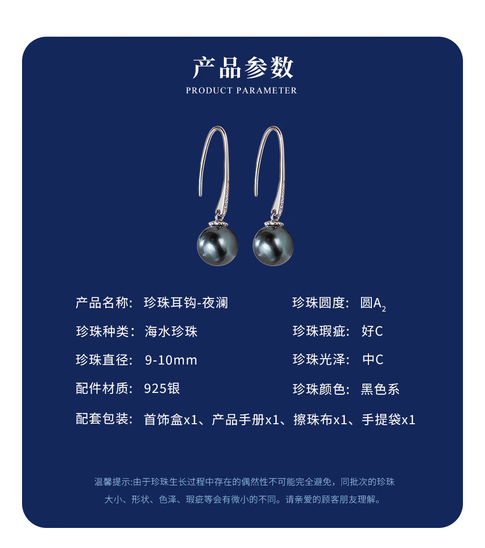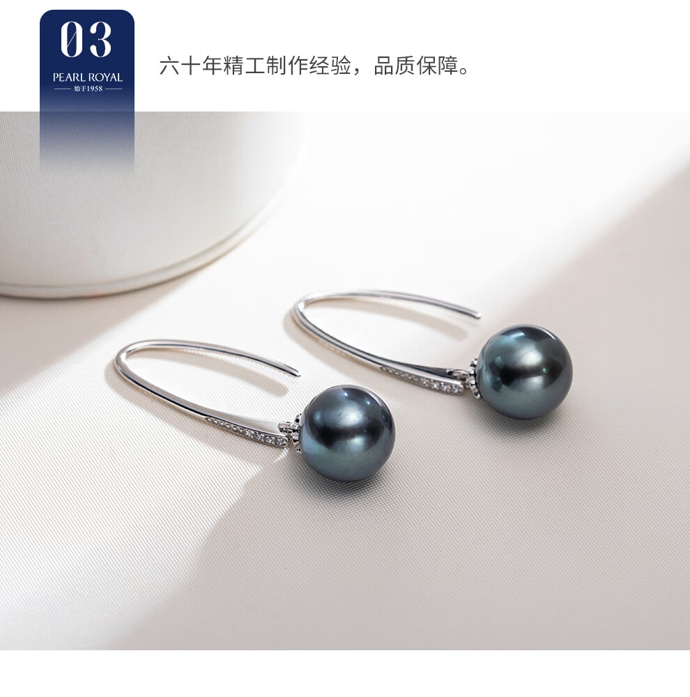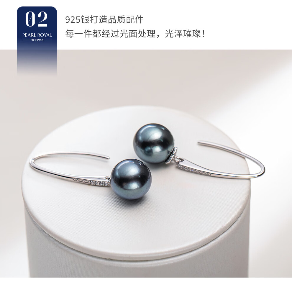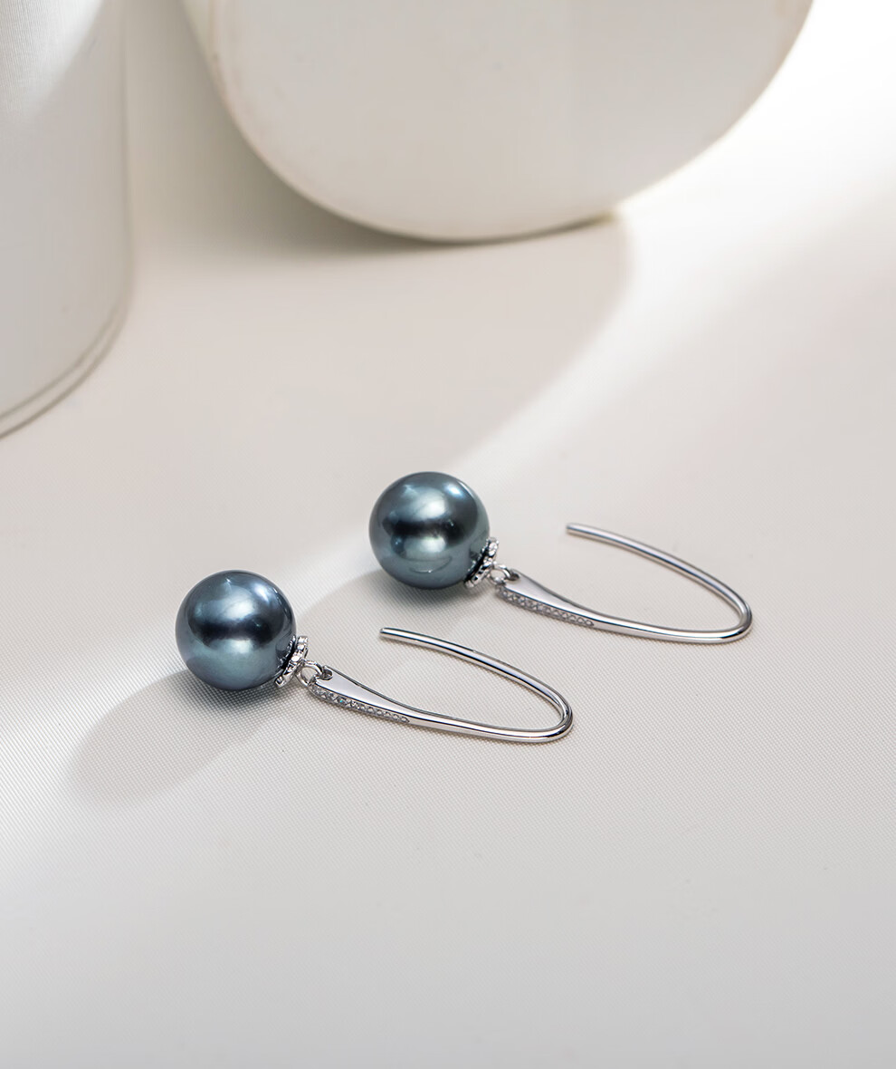 南珠宫夜澜925银海水珍珠耳环大溪地黑珍珠耳钉强光圆形生日礼物送妈妈 9.0-10.0mm 925银海水珍珠耳环