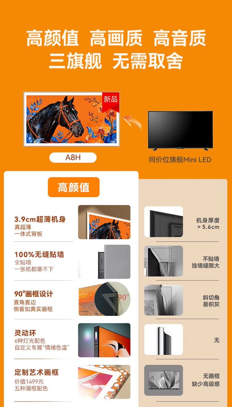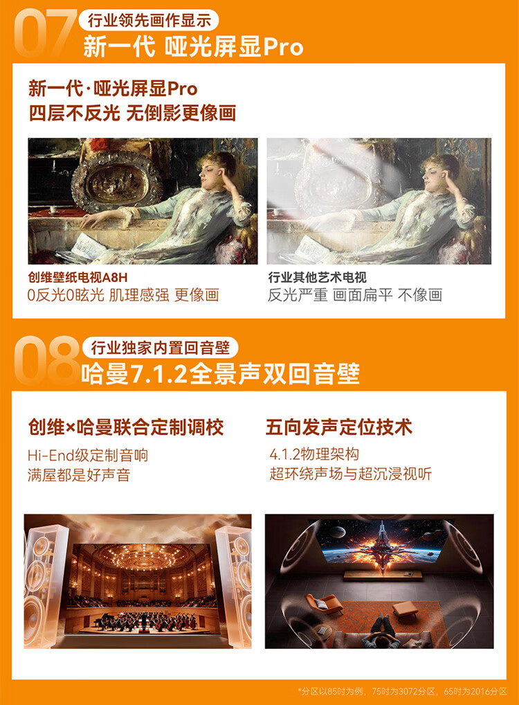 创维壁纸电视85英寸 85A8H 艺术电视 SQD-Mini LED 不反光电视 无缝贴墙 85吋平板电视高清液晶智慧屏 85英寸 【质保两年+免费安装】