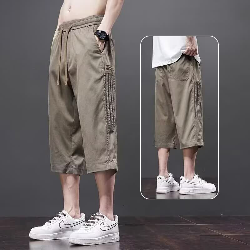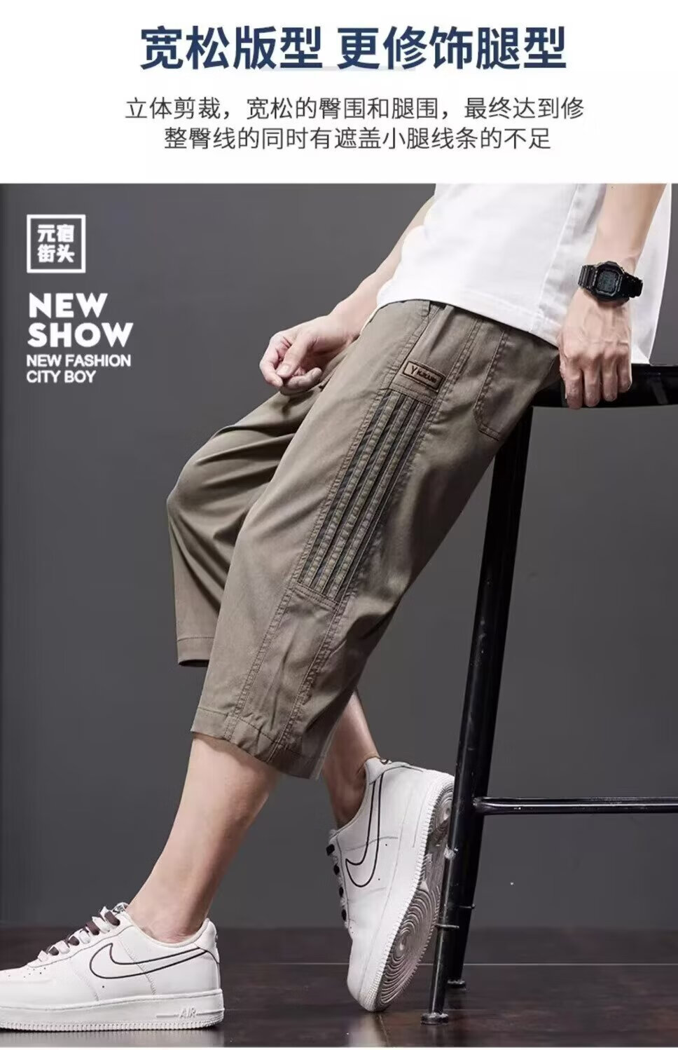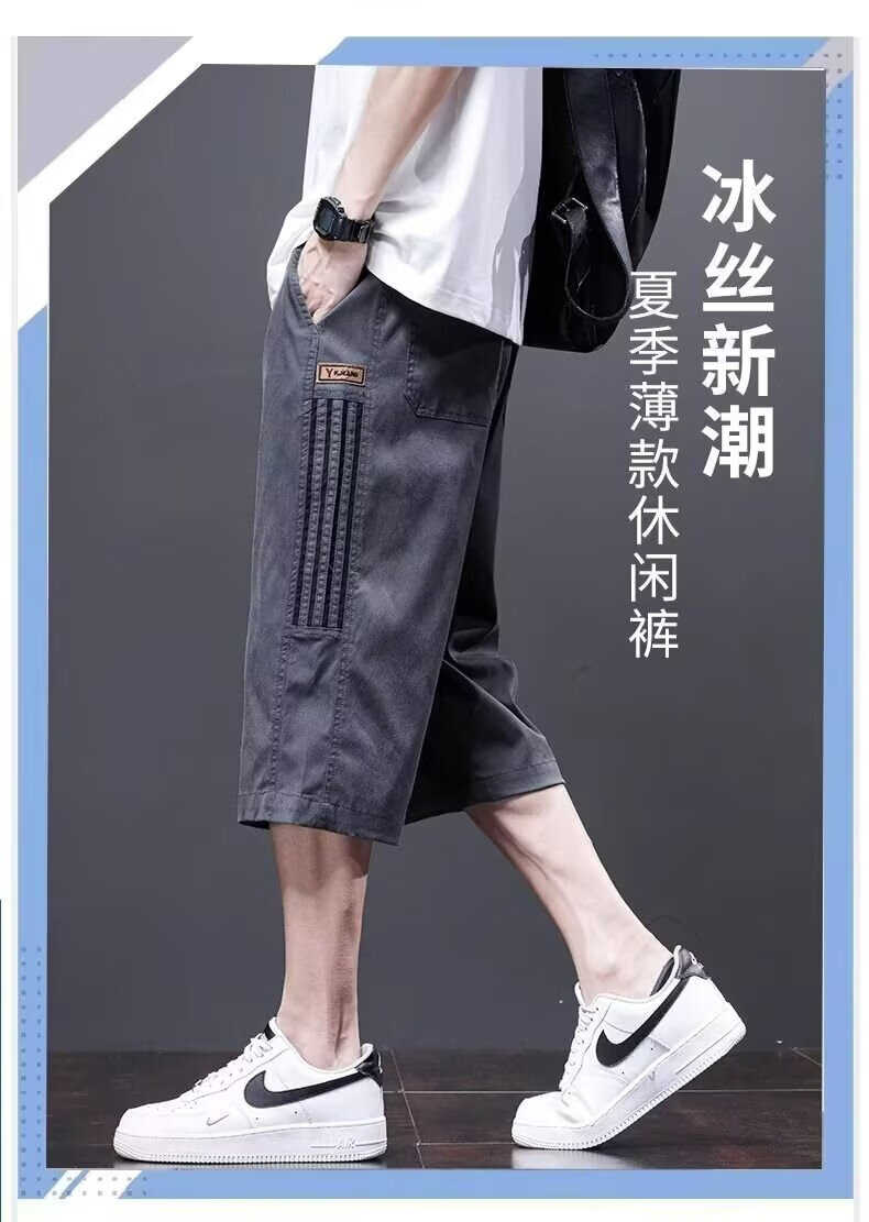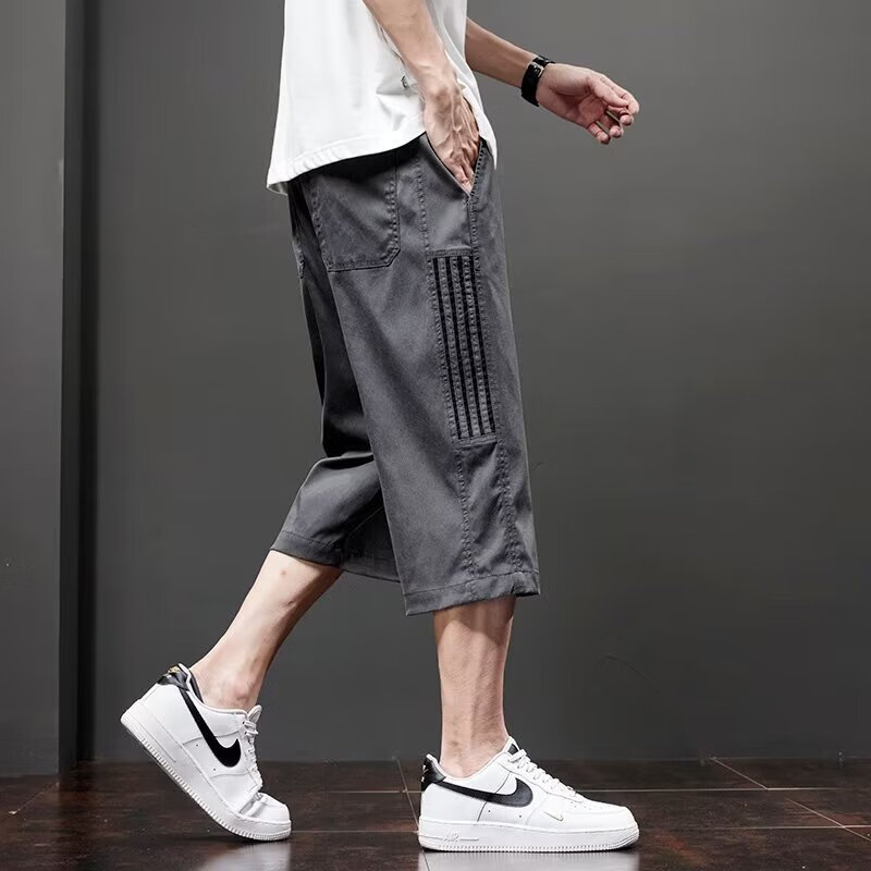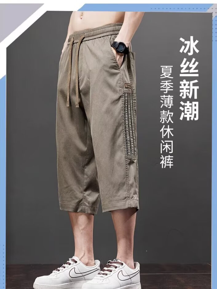 锐图森秋季冰丝休闲短裤时尚宽松透气七分薄款中裤美式条纹宽松直筒短裤 卡其 M (建议80-95斤)