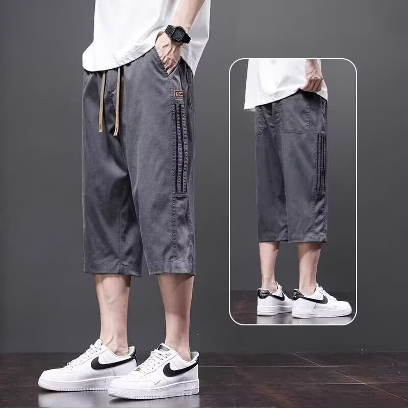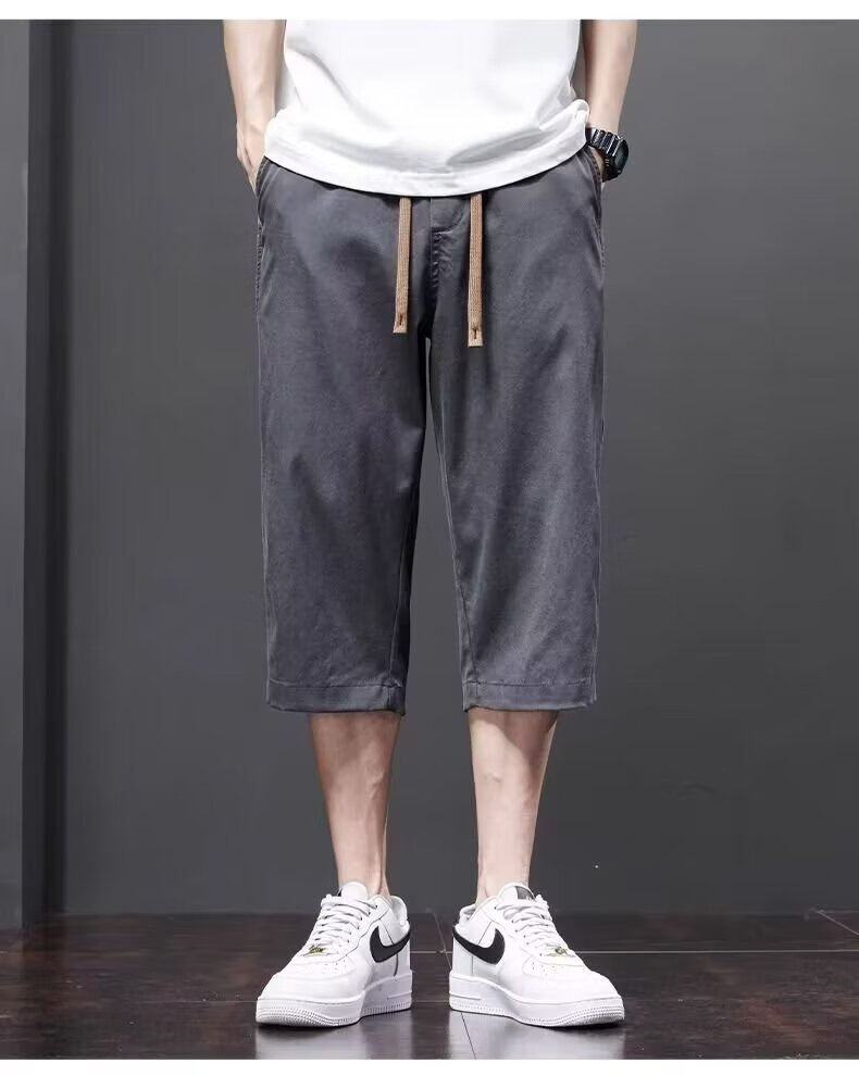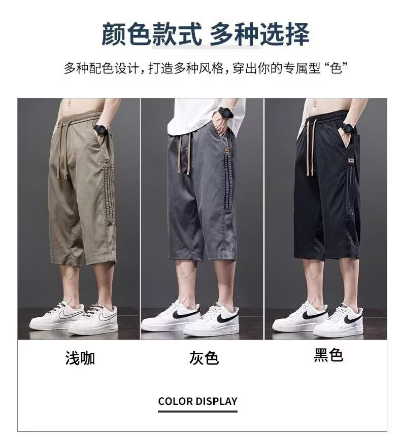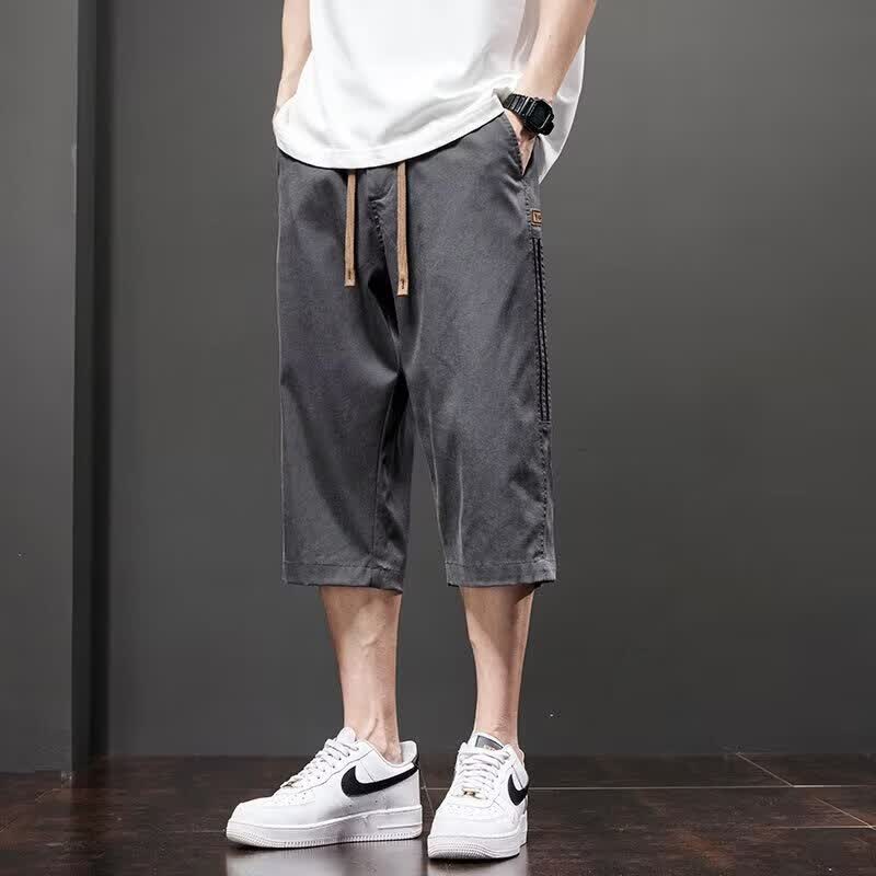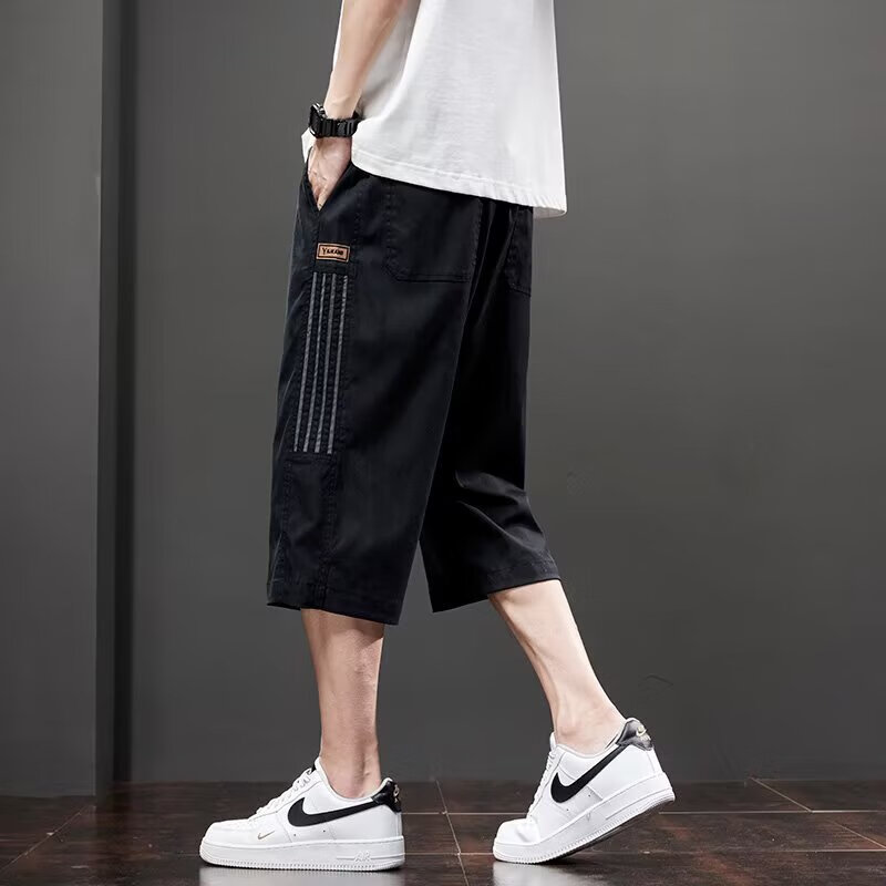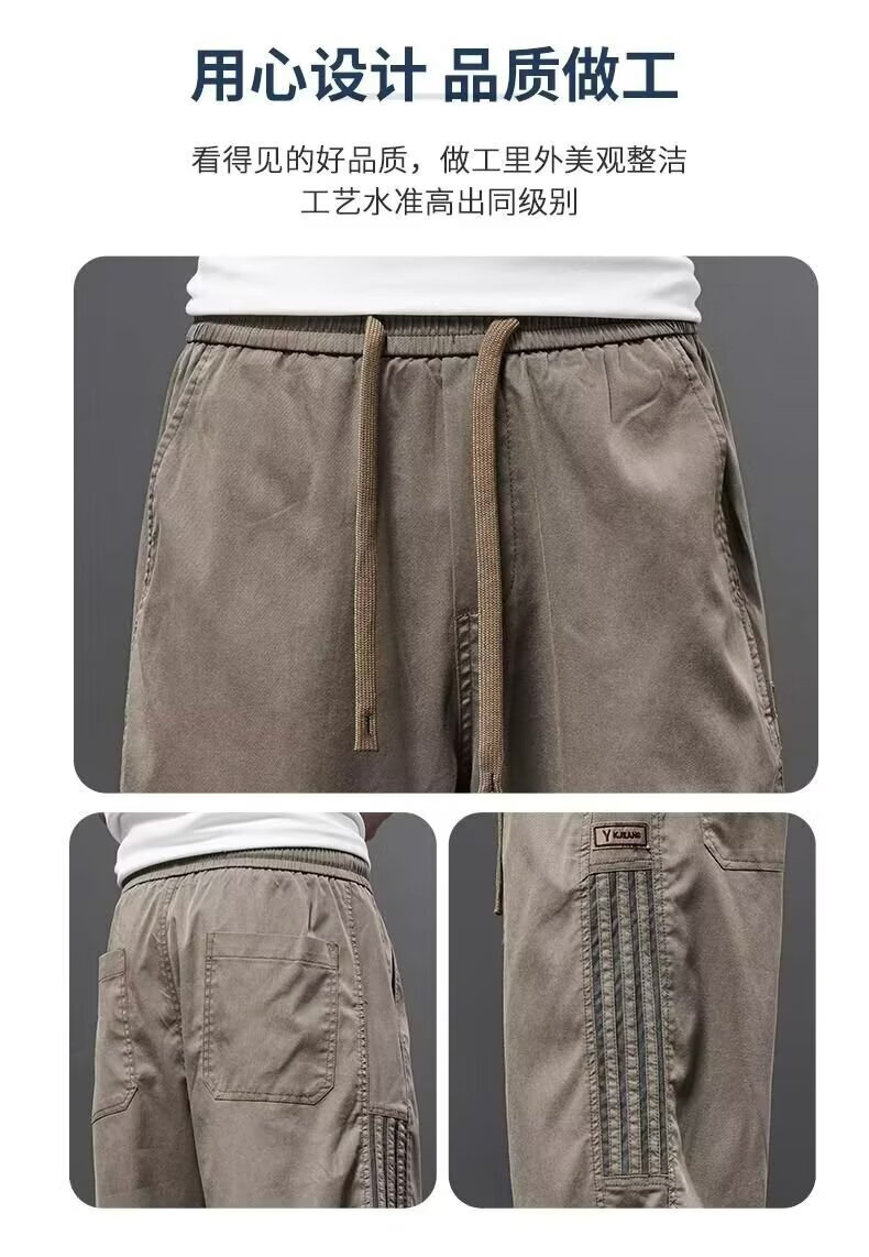 锐图森秋季冰丝休闲短裤时尚宽松透气七分薄款中裤美式条纹宽松直筒短裤 卡其 M (建议80-95斤)