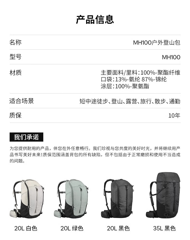 迪卡侬登山包户外双肩包徒步背包轻量化旅行运动MH100米白色20L 4335958