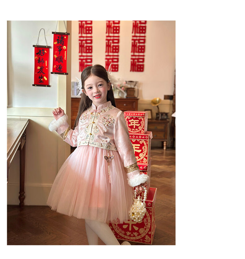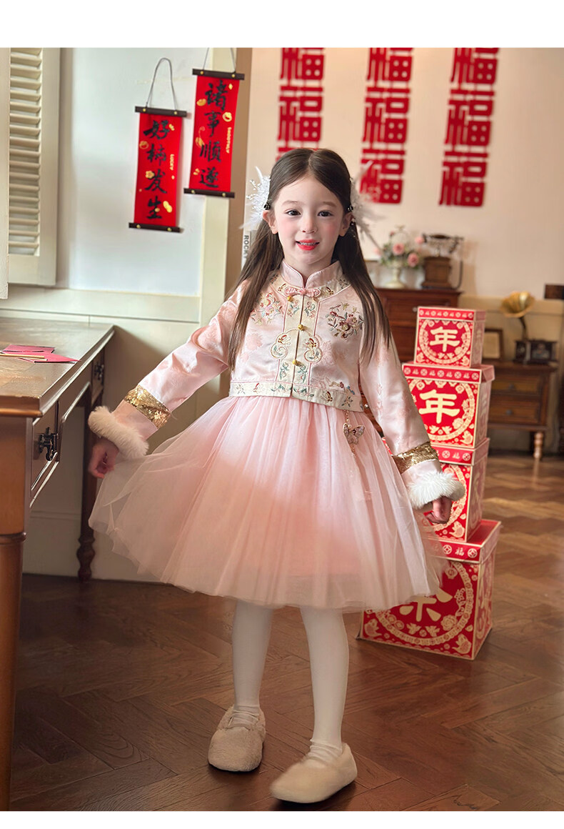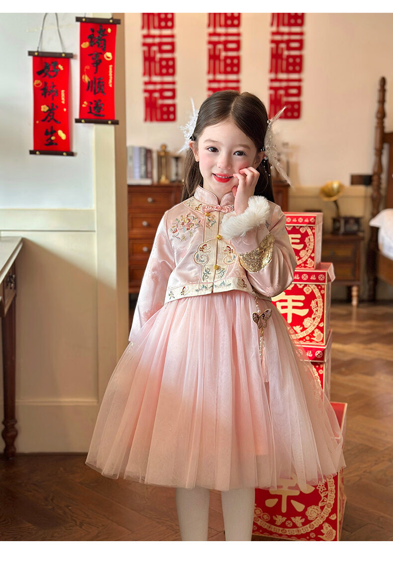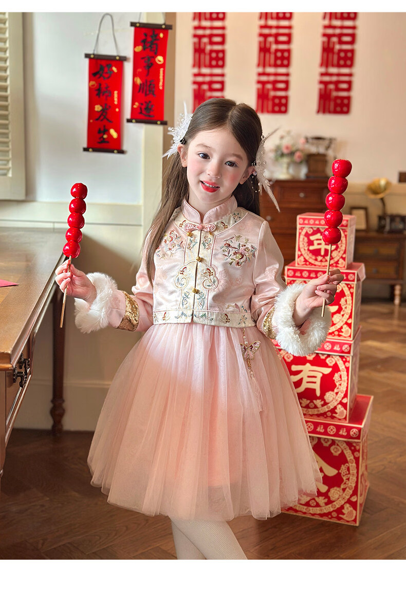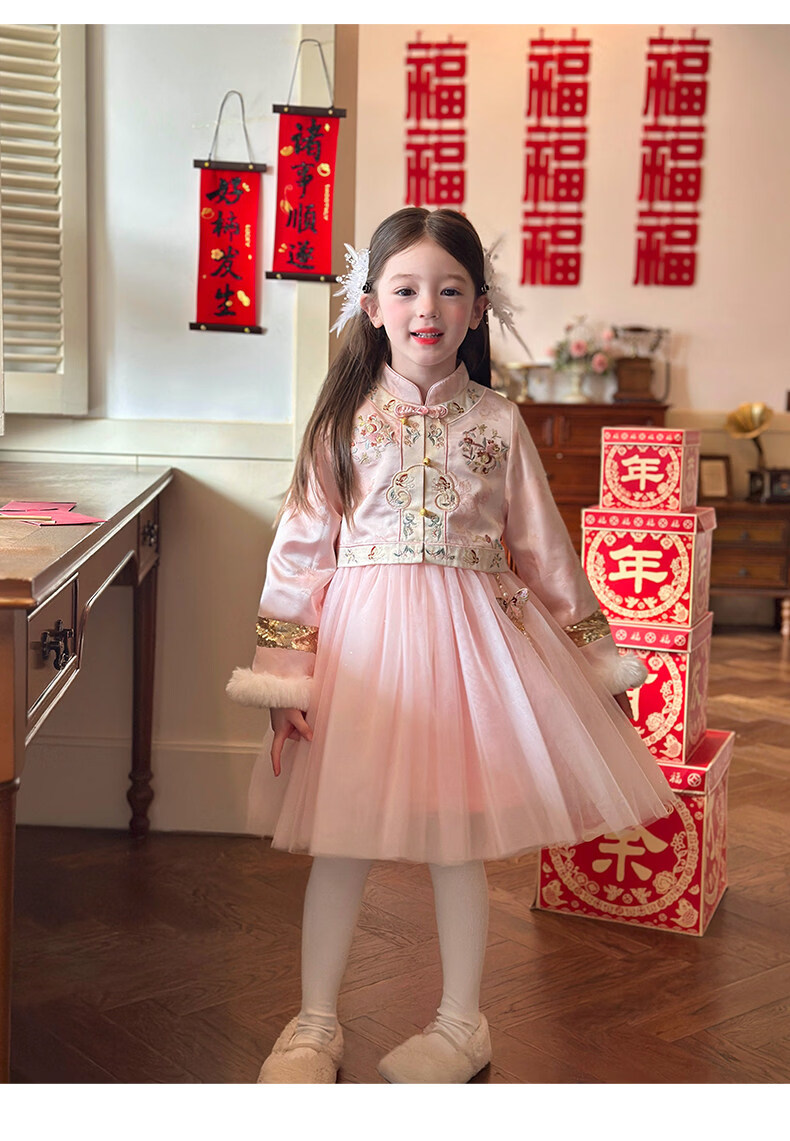 栀了成长记童装女童国风旗袍网纱裙2025冬季儿童新中式加绒连衣裙 粉色 连衣裙 100 cm