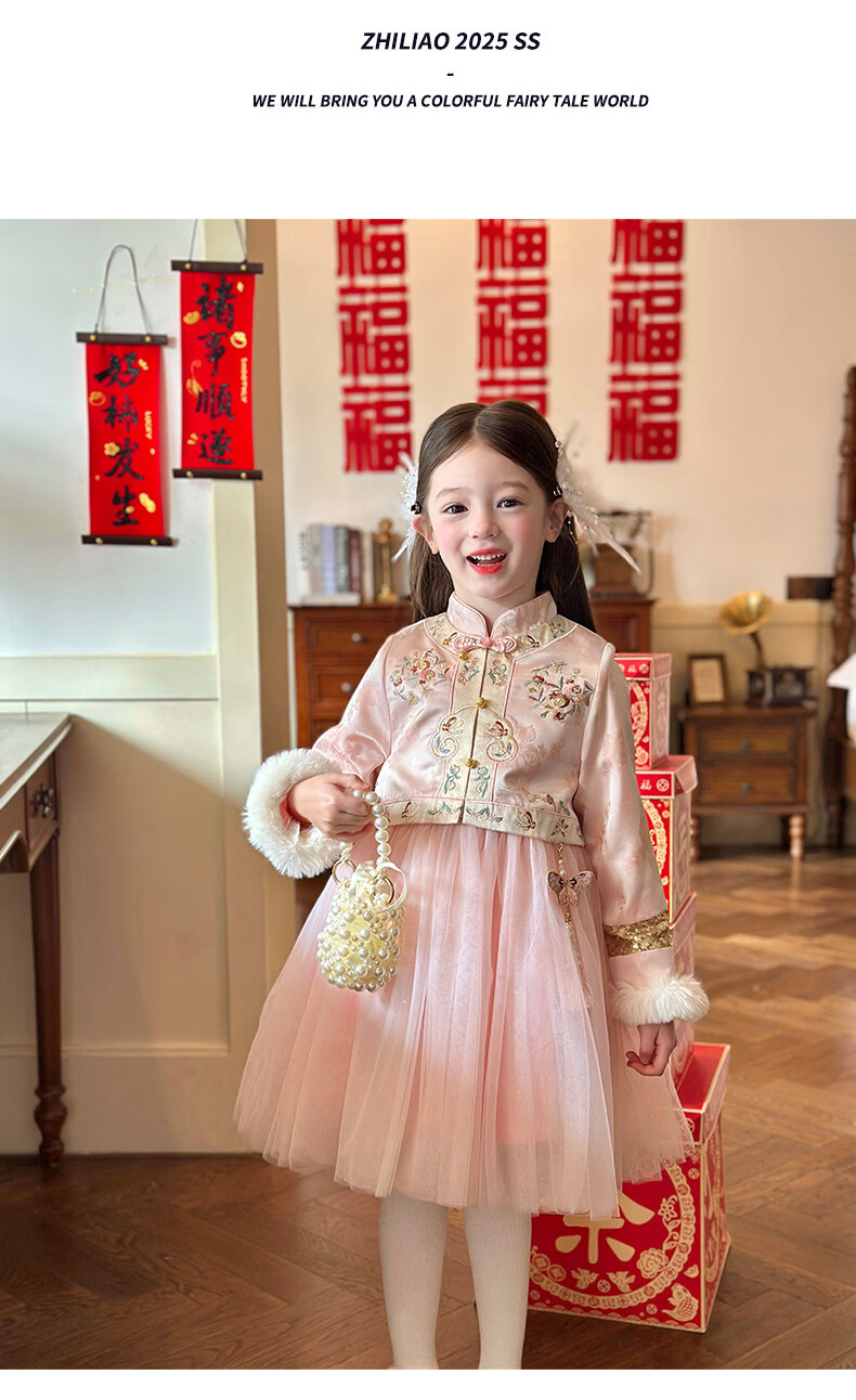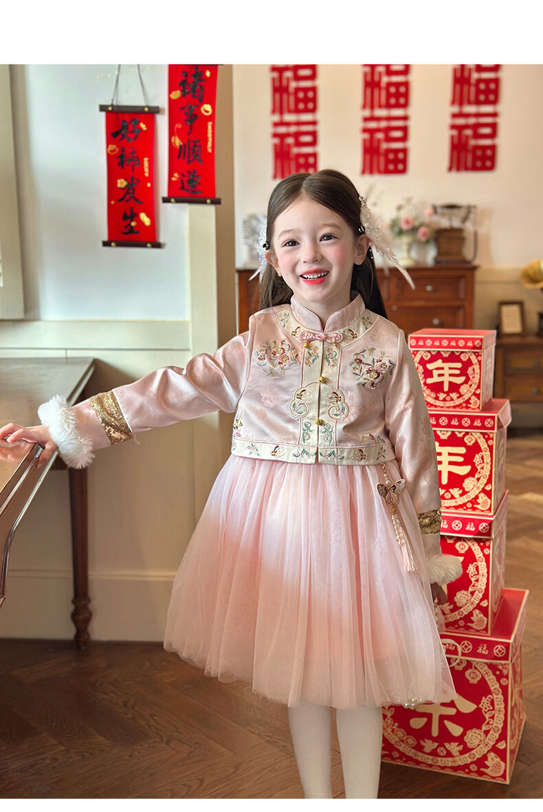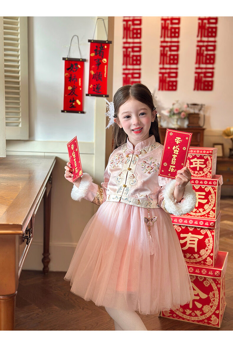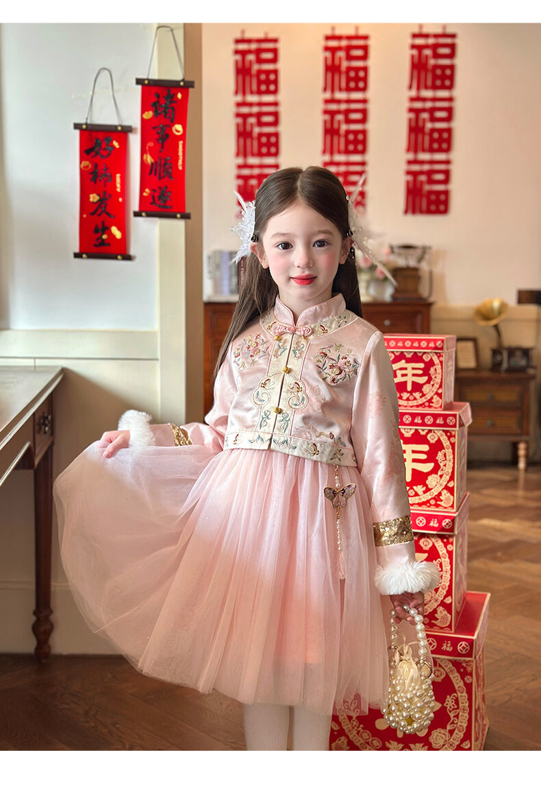 栀了成长记童装女童国风旗袍网纱裙2025冬季儿童新中式加绒连衣裙 粉色 连衣裙 100 cm
