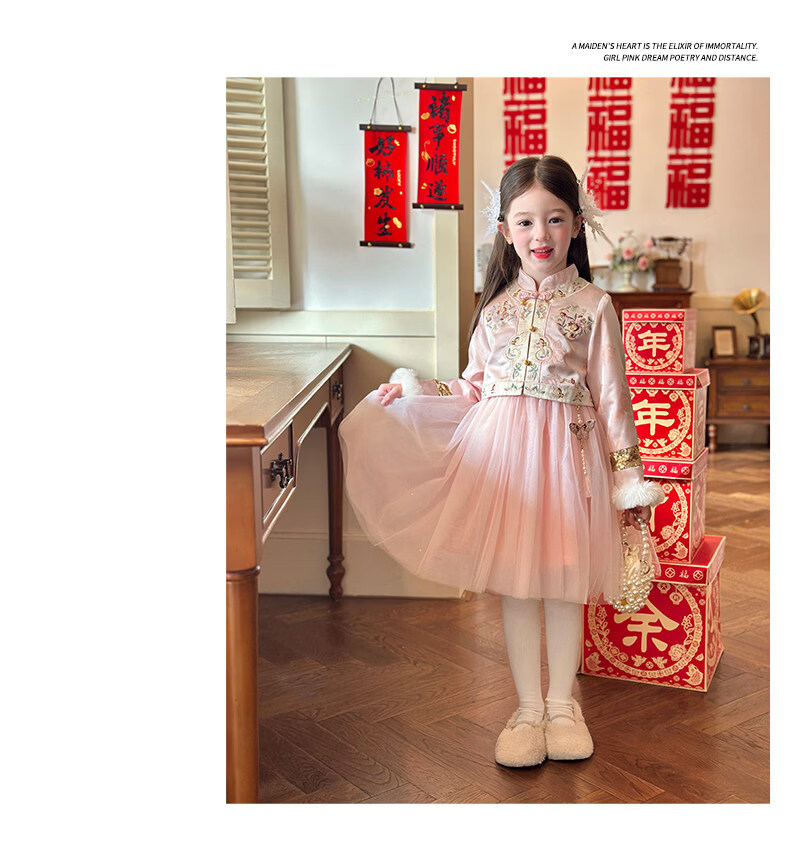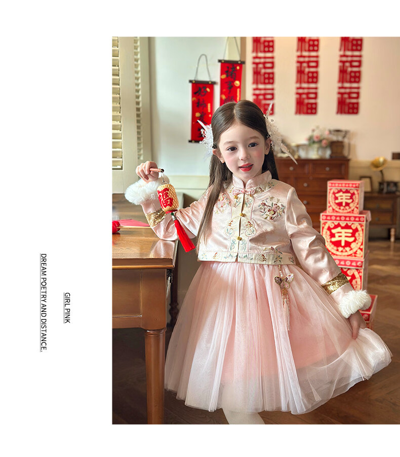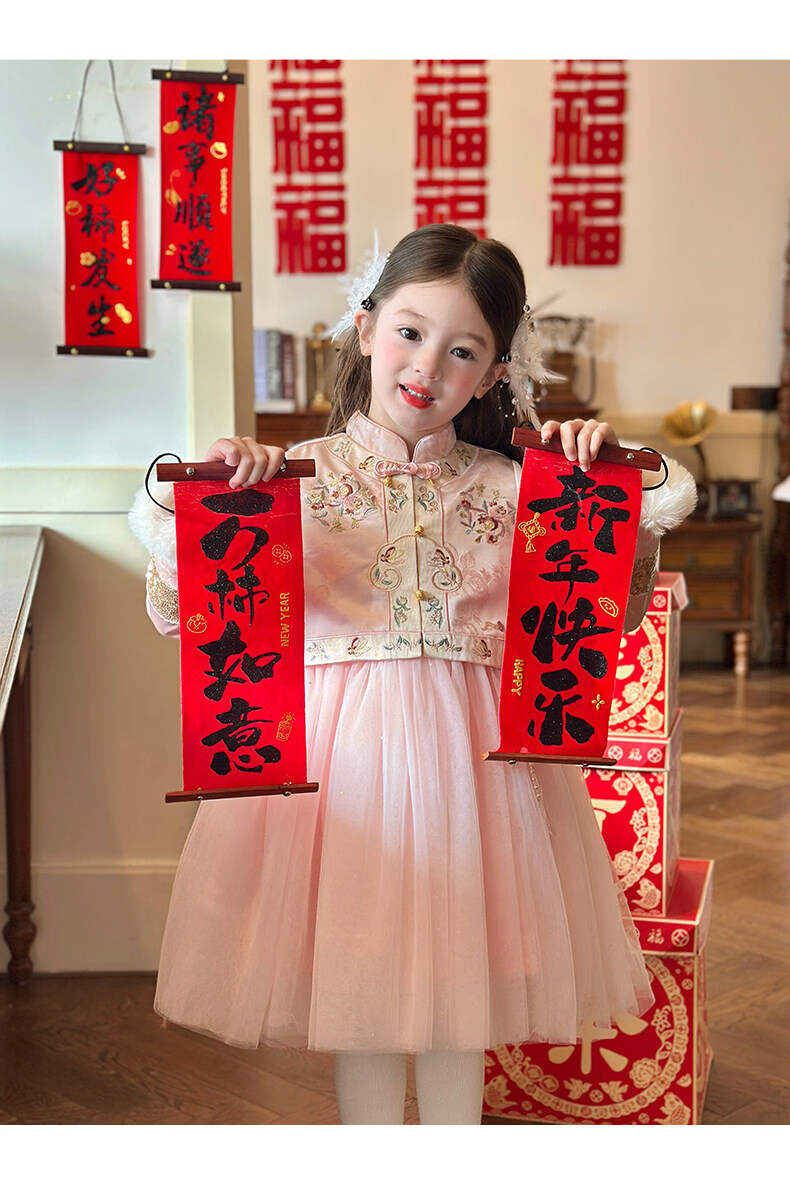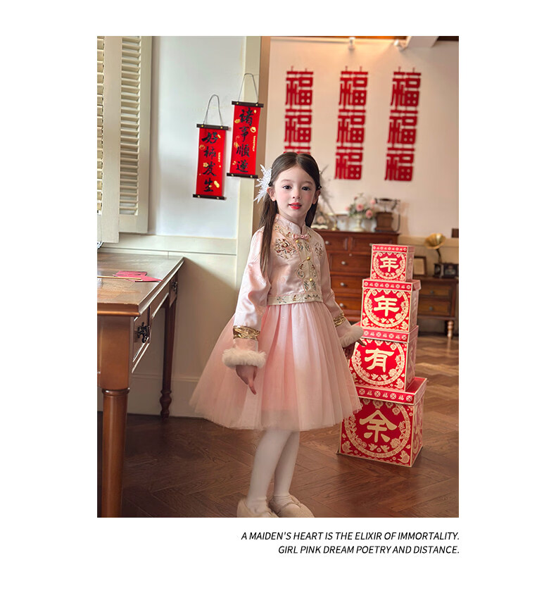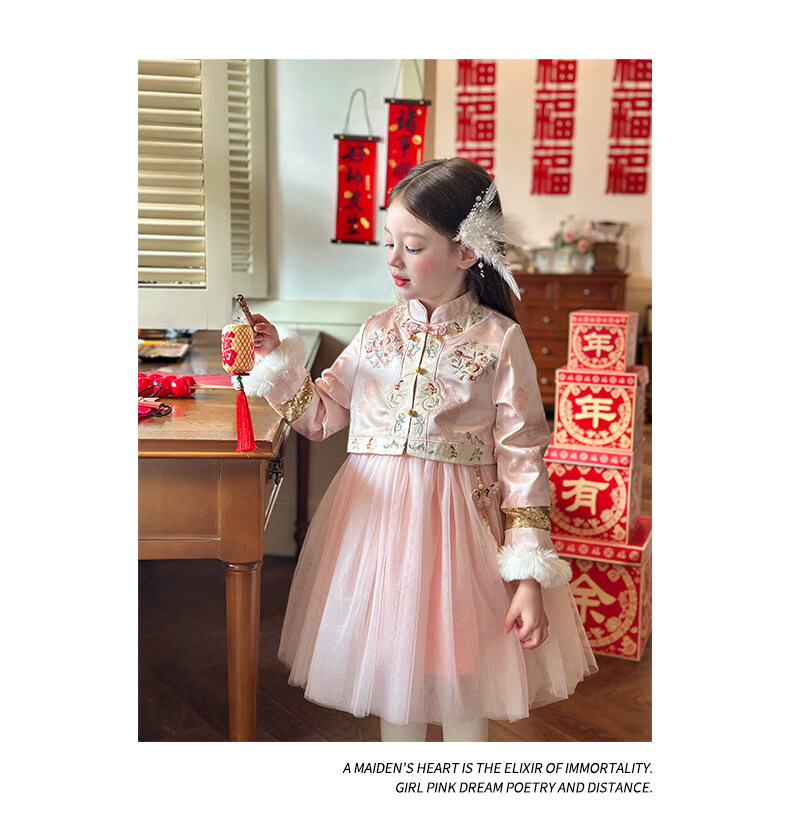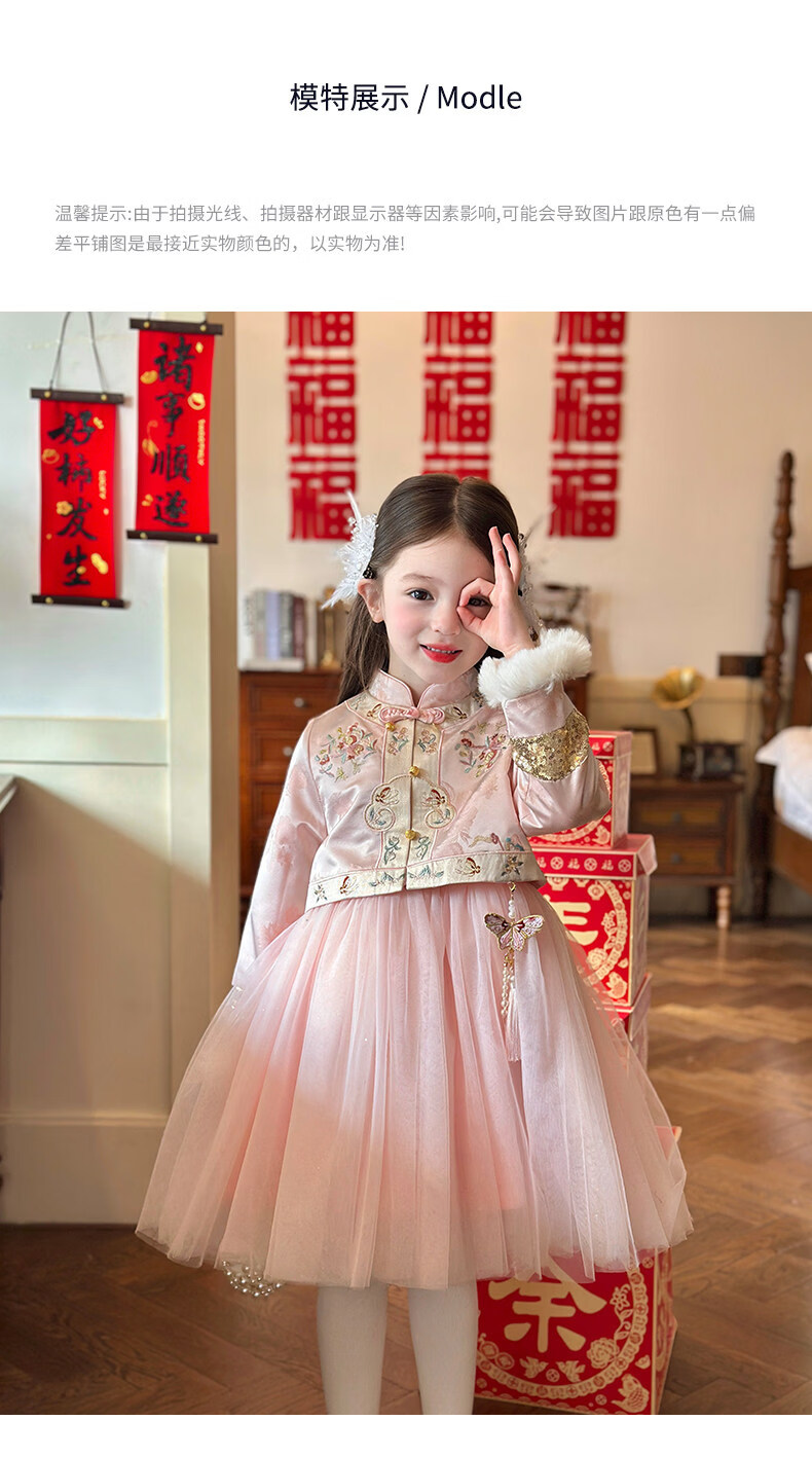 栀了成长记童装女童国风旗袍网纱裙2025冬季儿童新中式加绒连衣裙 粉色 连衣裙 100 cm