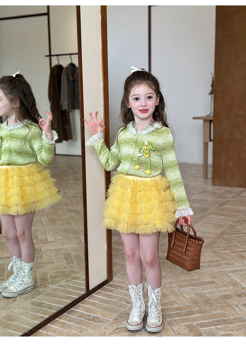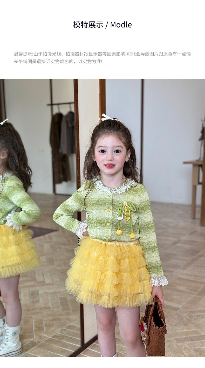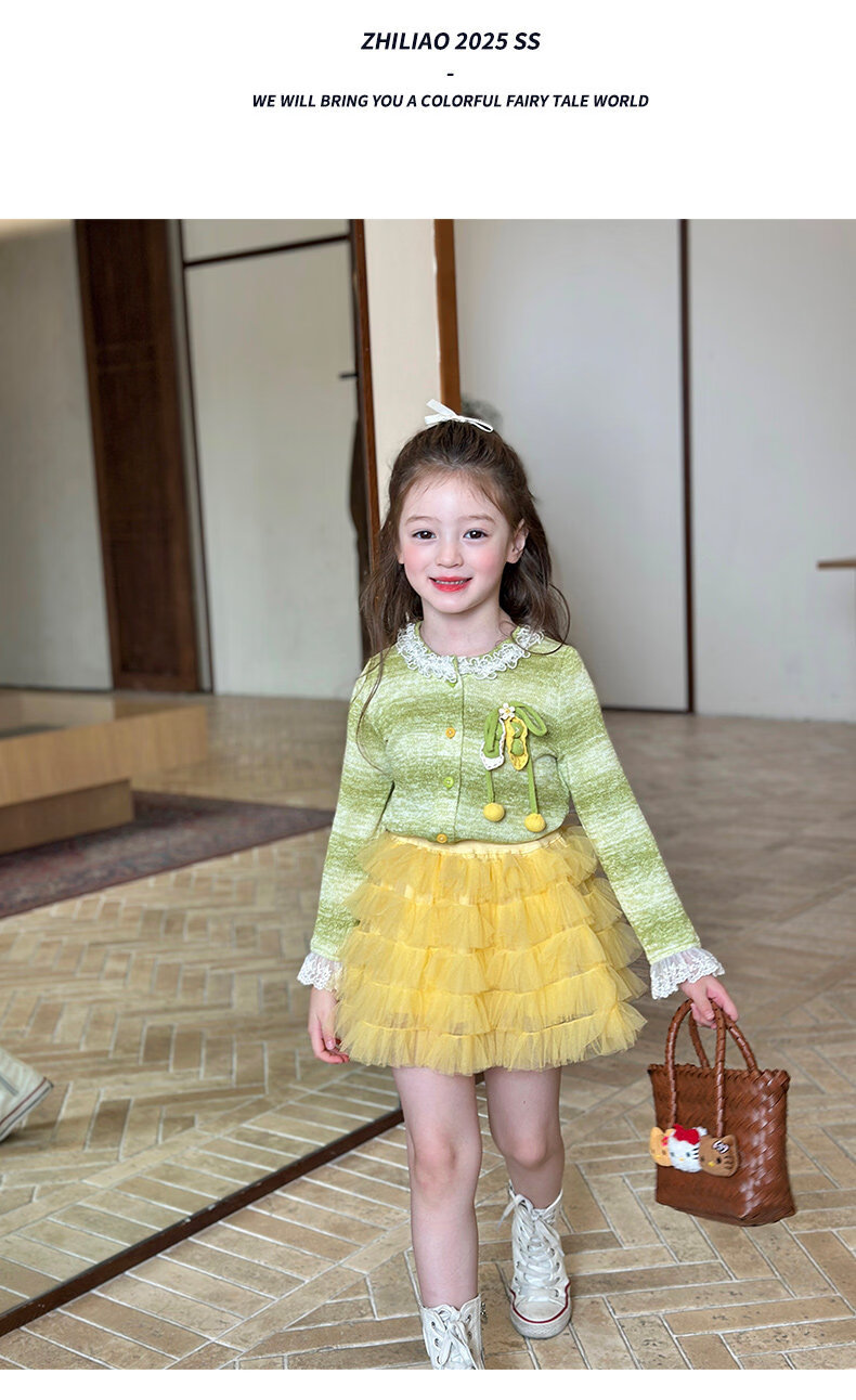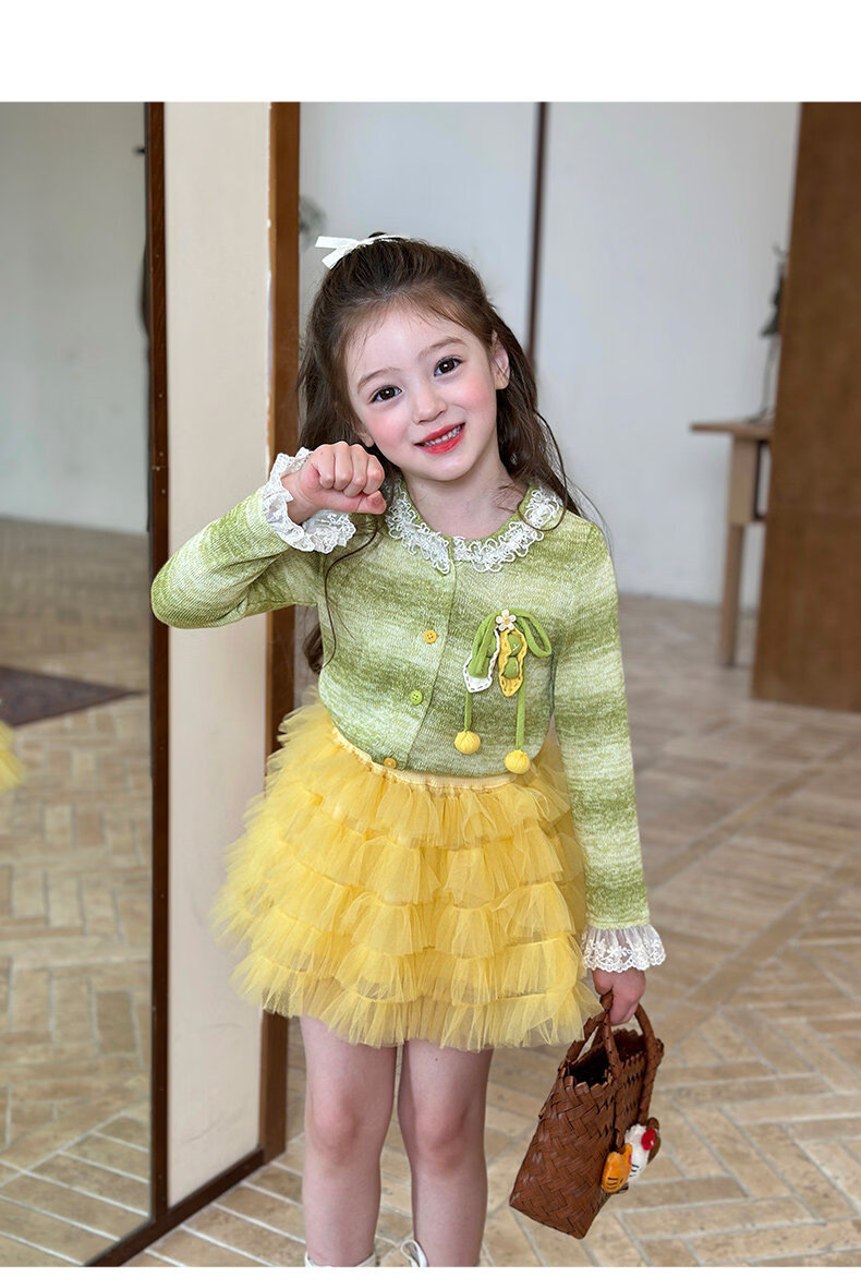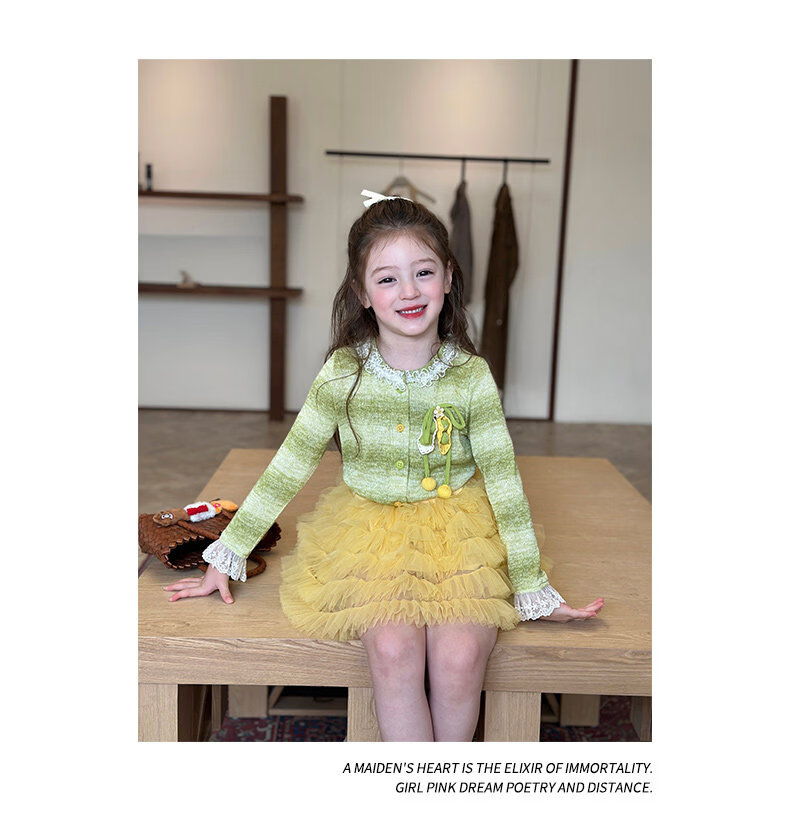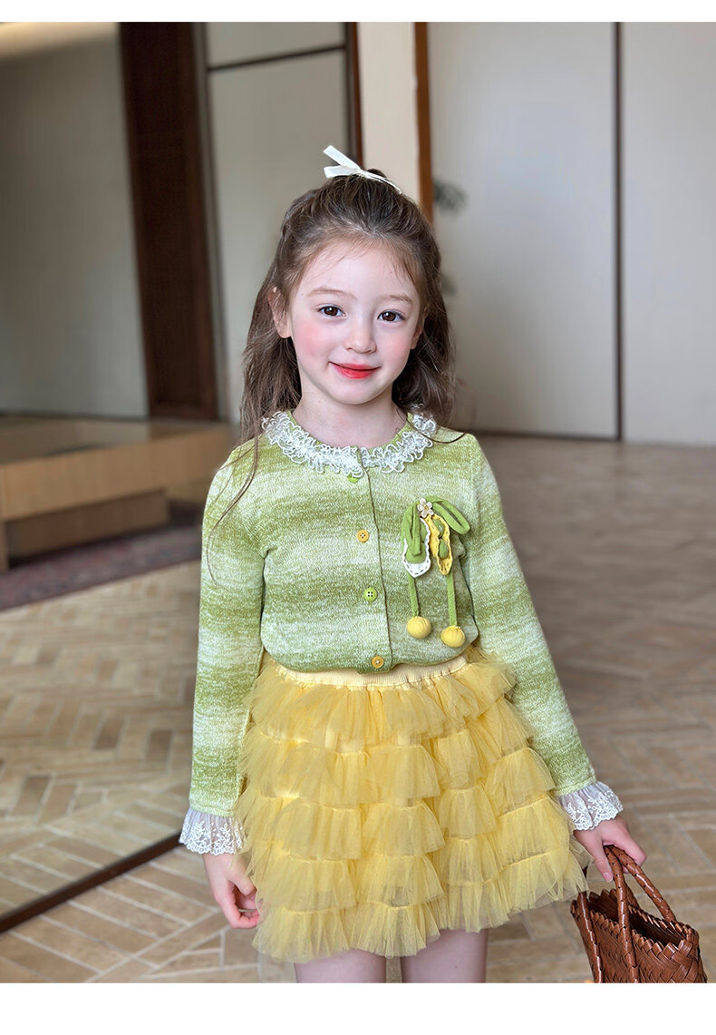 栀了成长记女童装韩版清新条纹上衣2026春季儿童百搭花边针织开衫 绿色 上衣 100 cm