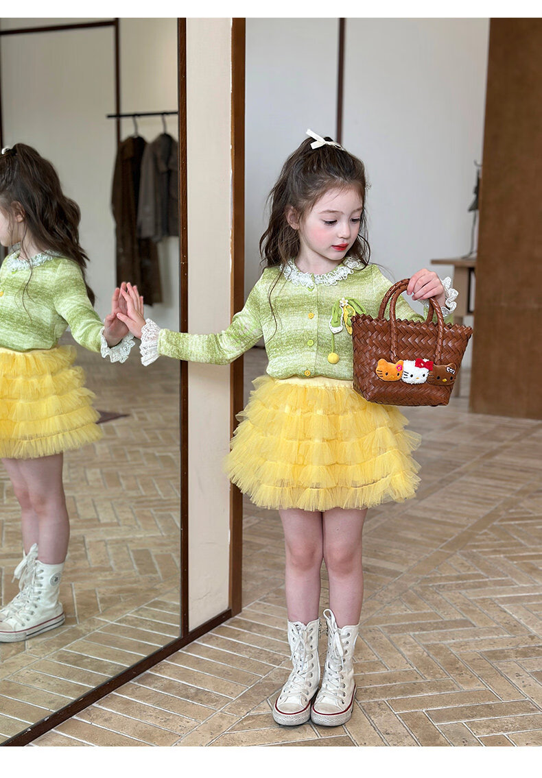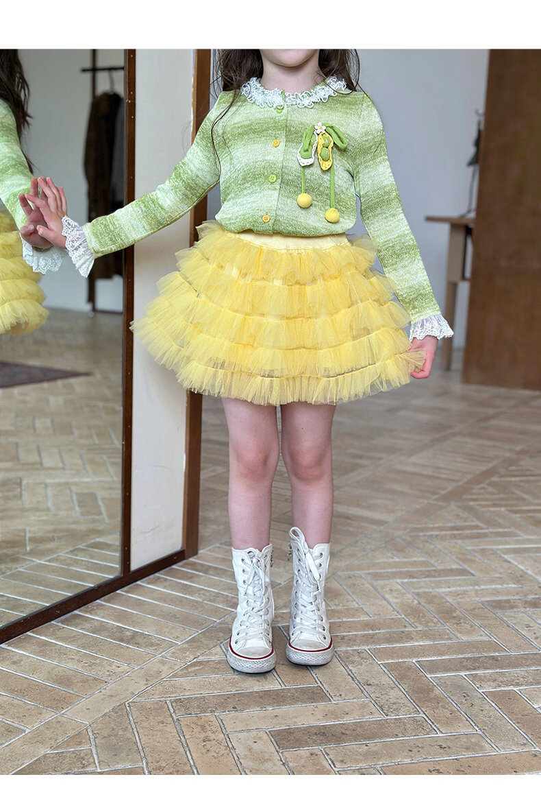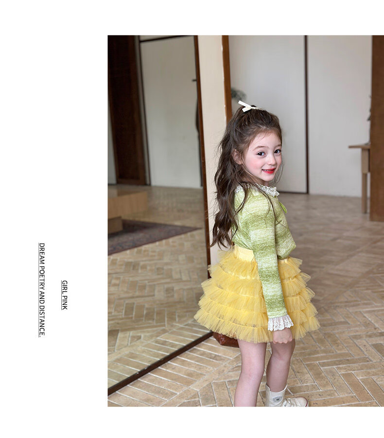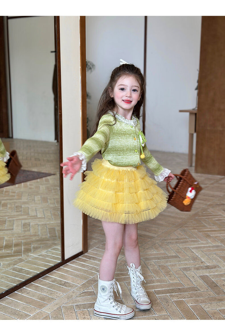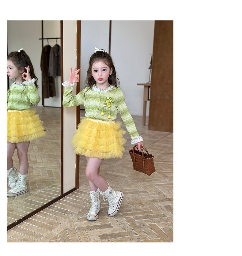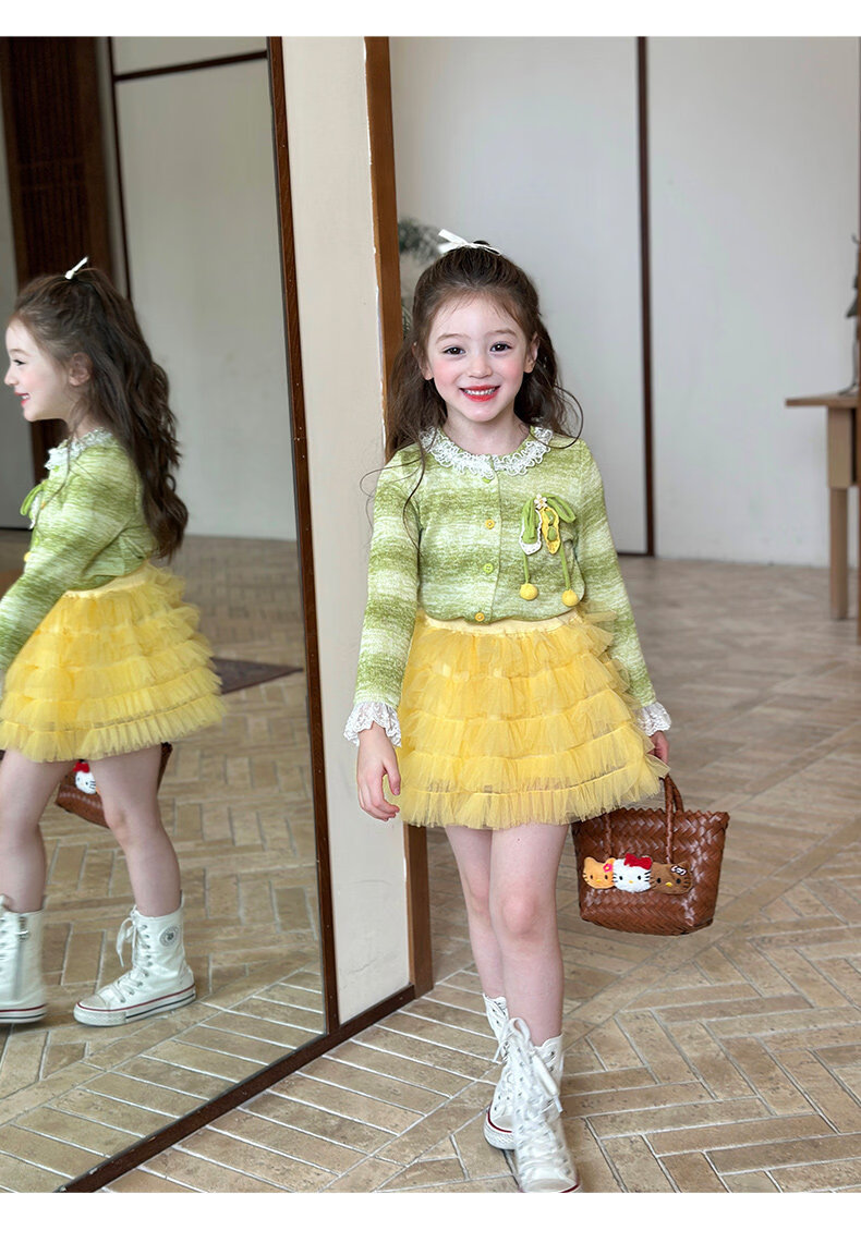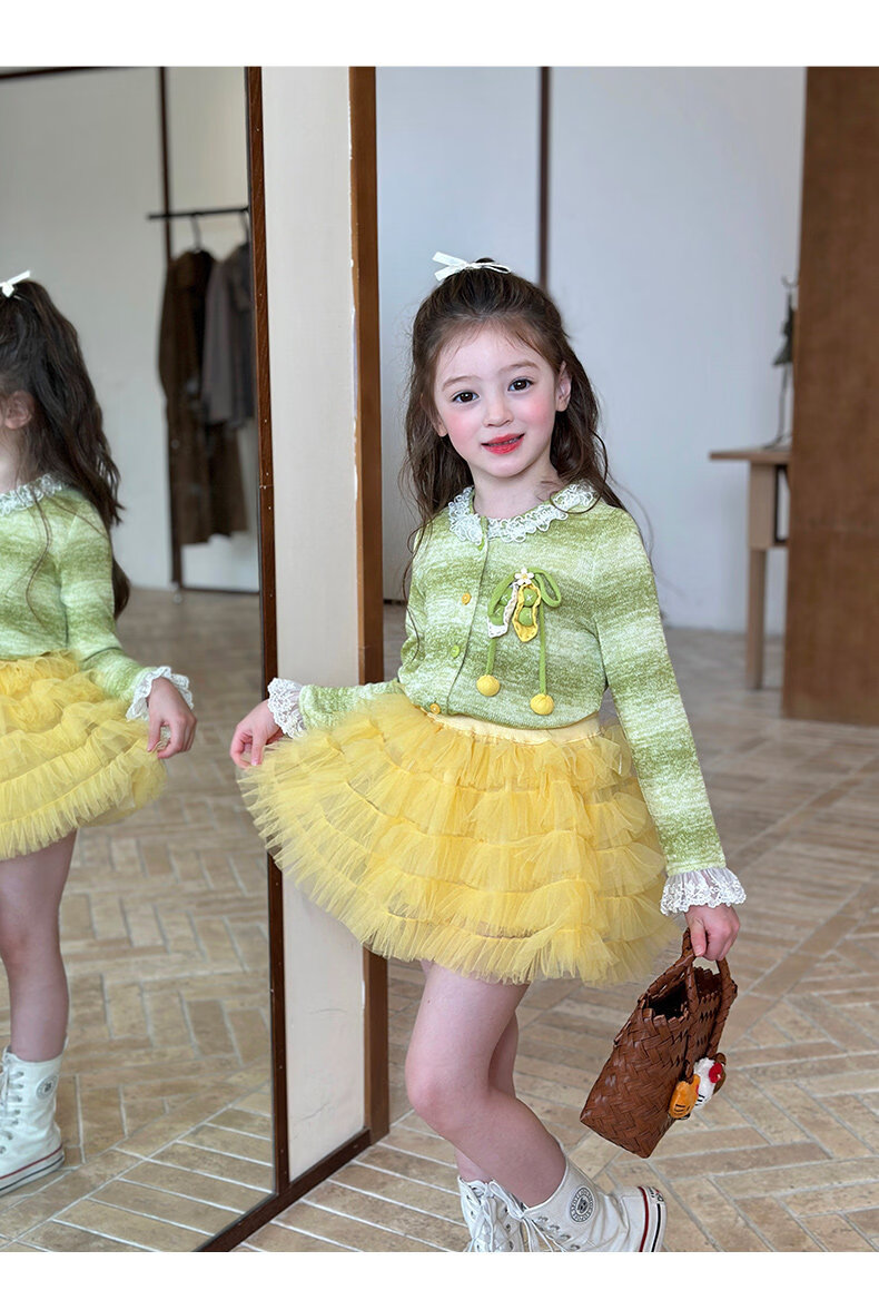 栀了成长记女童装韩版清新条纹上衣2026春季儿童百搭花边针织开衫 绿色 上衣 100 cm