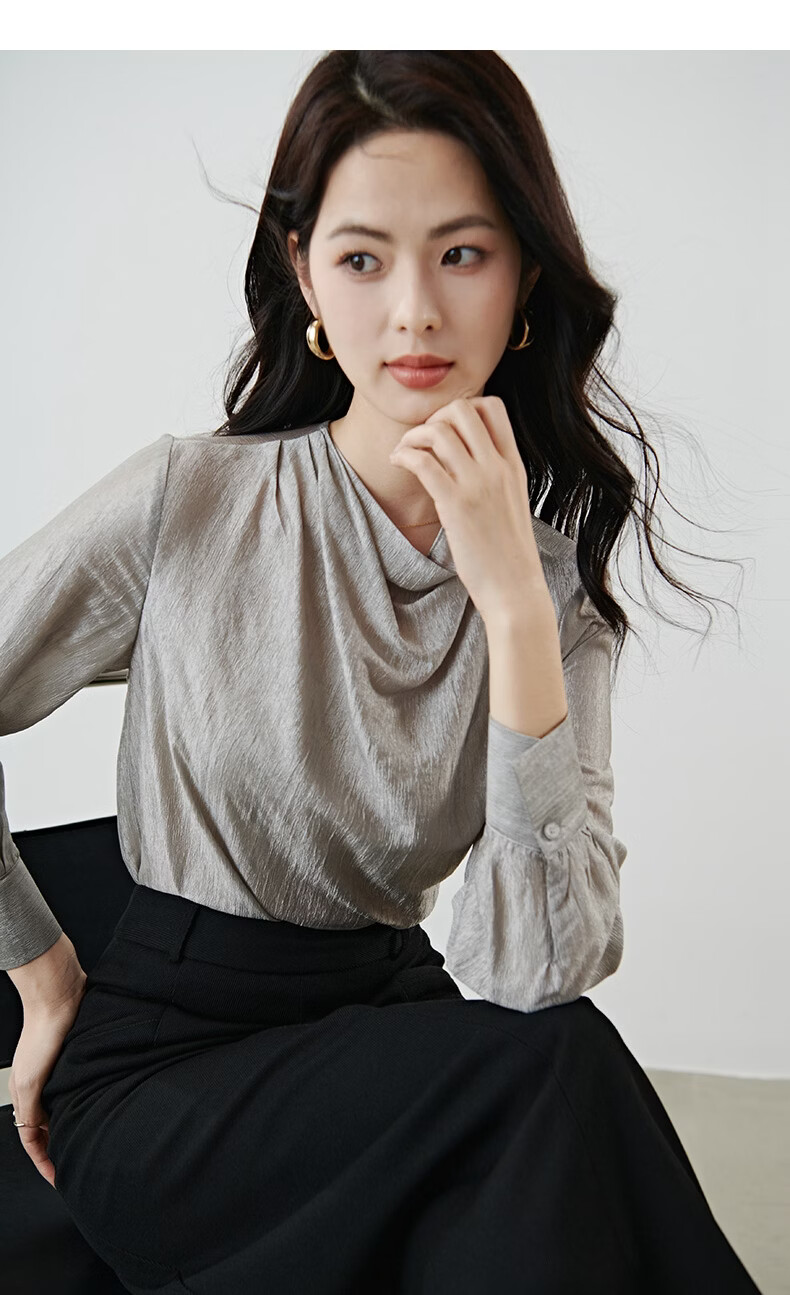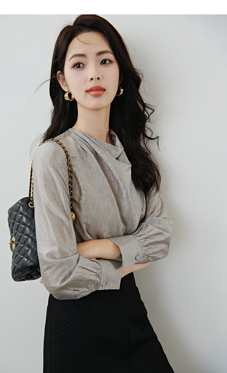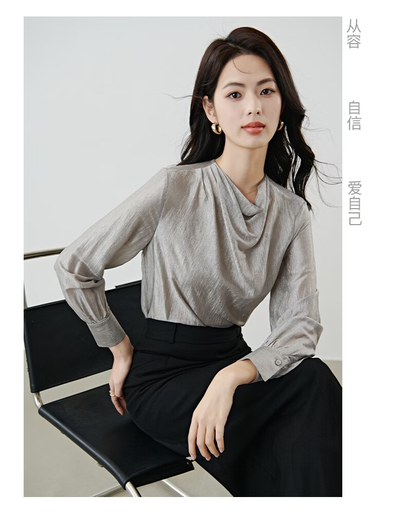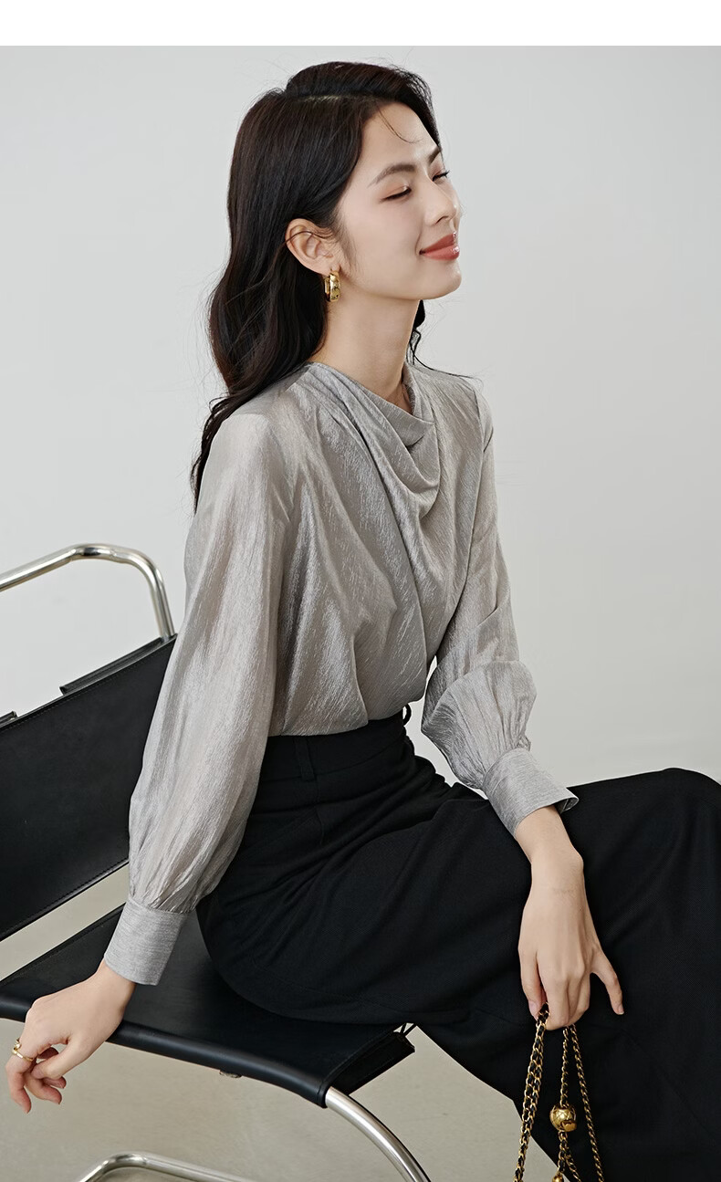 晚白【律政佳人】2026春千金风荡领醋酸光泽感格雷系上衣高级感衬衫女 银灰色 L