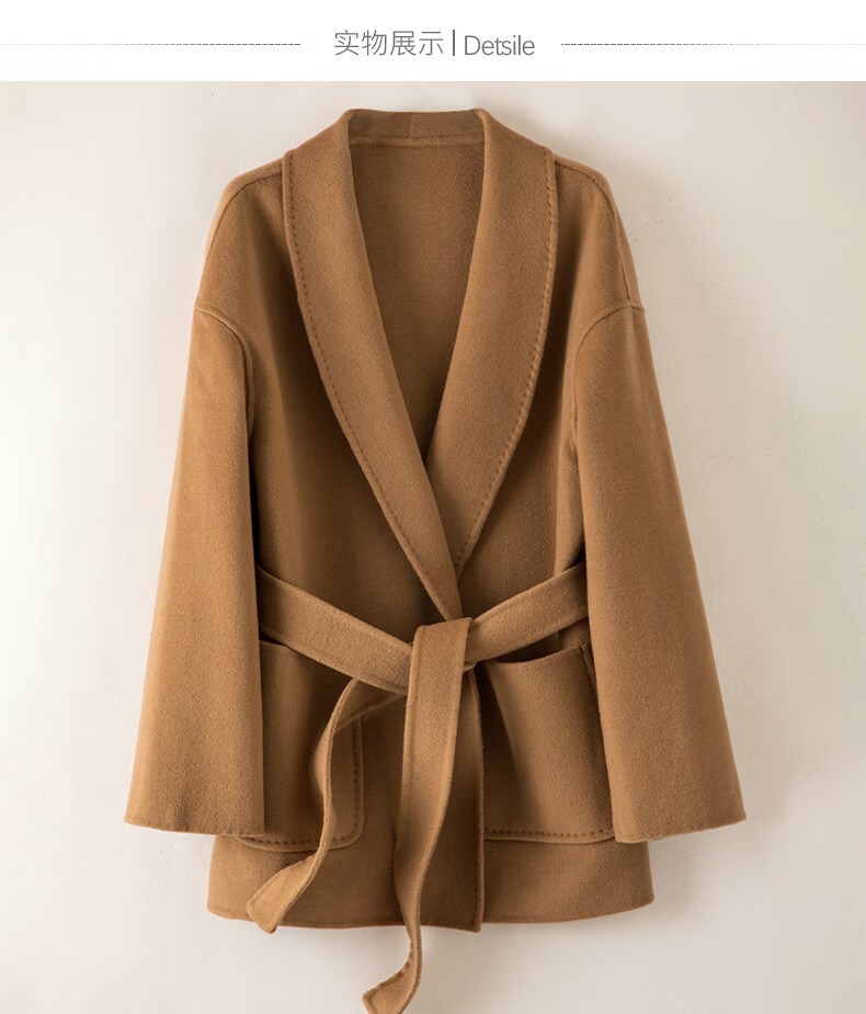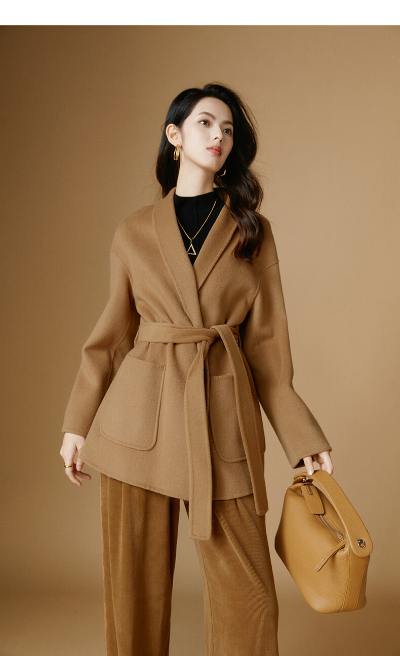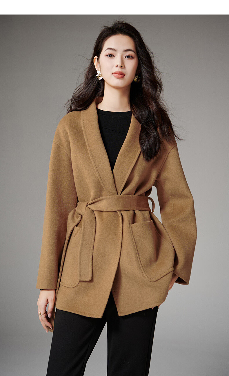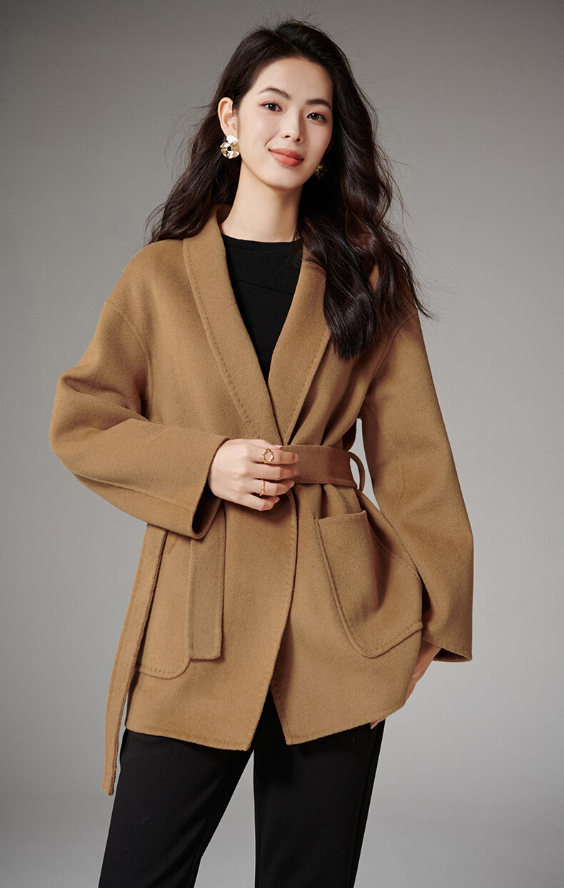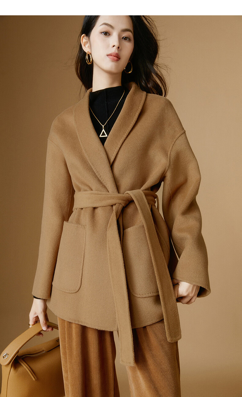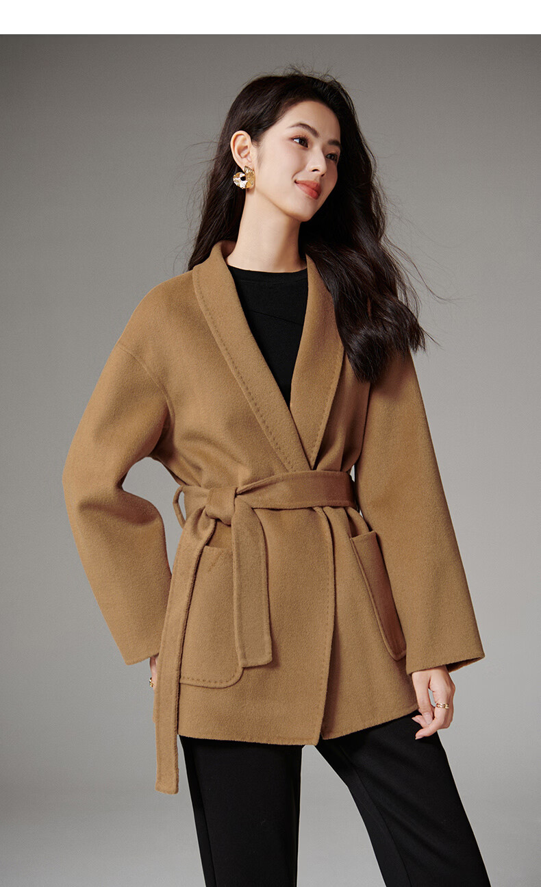 晚白【断码清仓】冬洋气小个子高级感收腰系带法式短款双面呢羊毛大衣 卡其色 XL