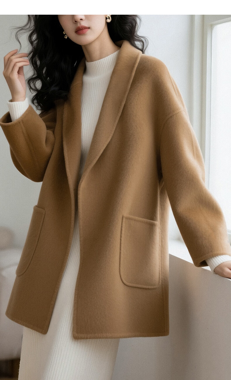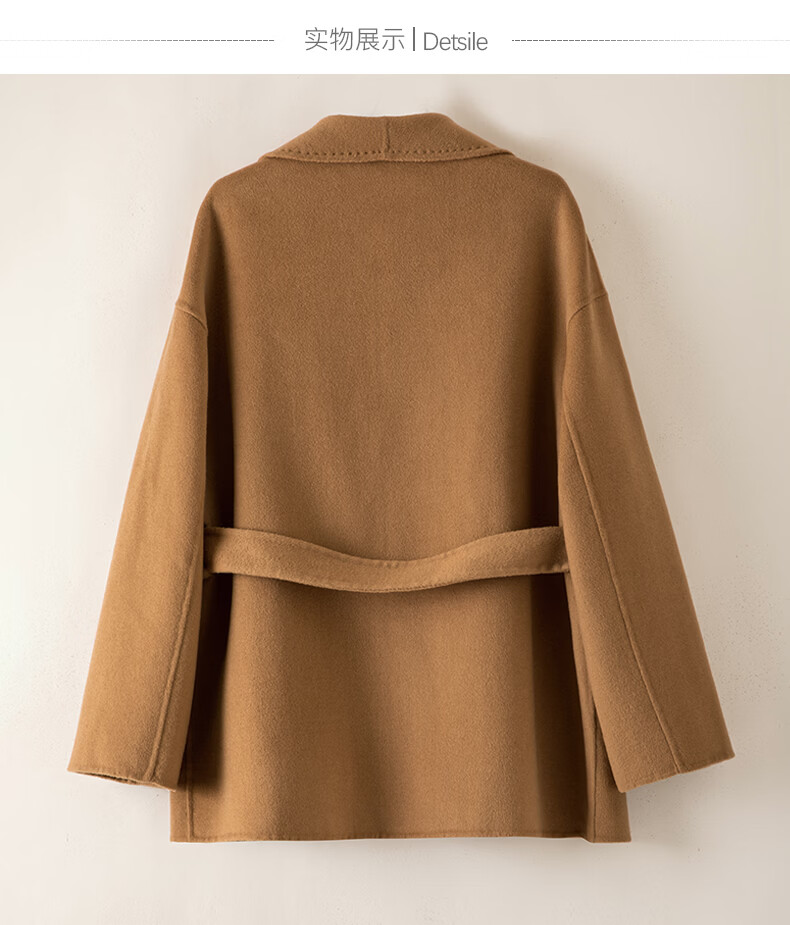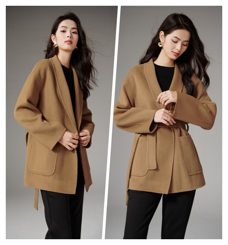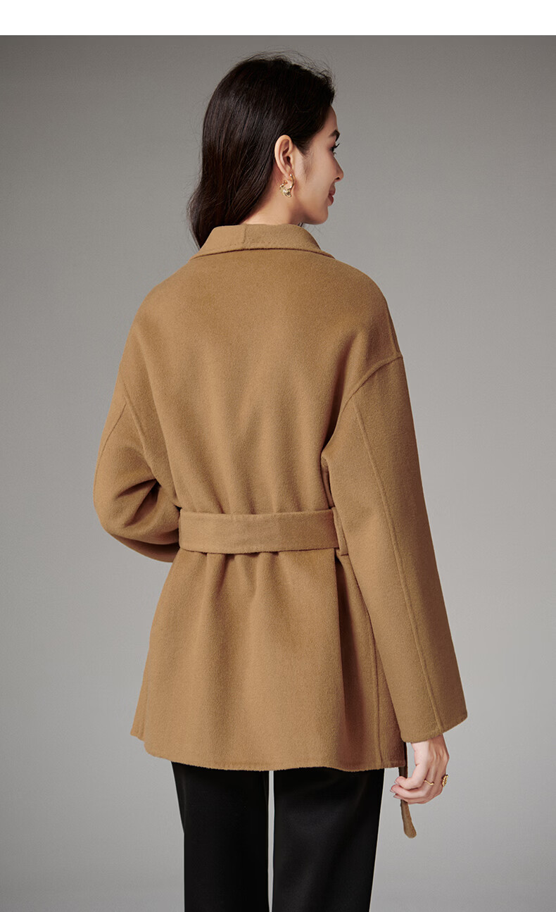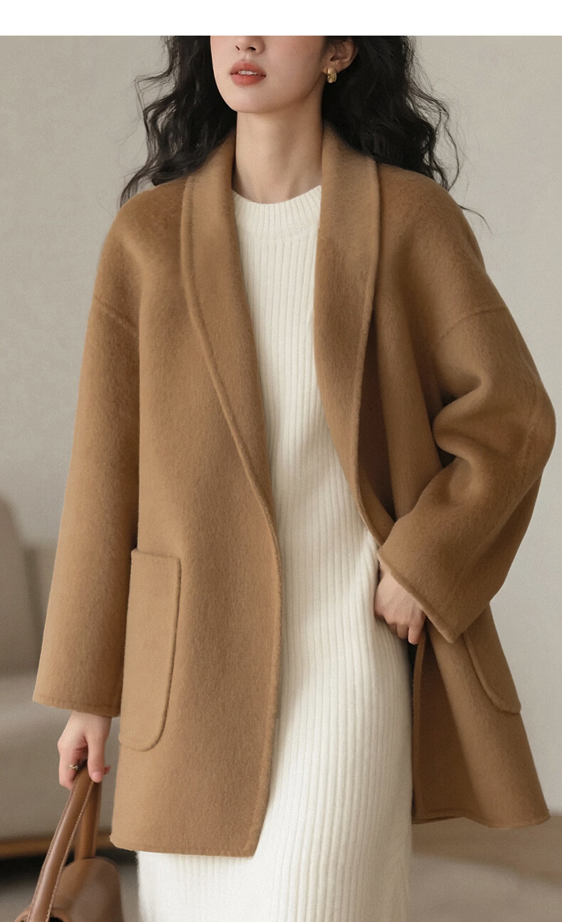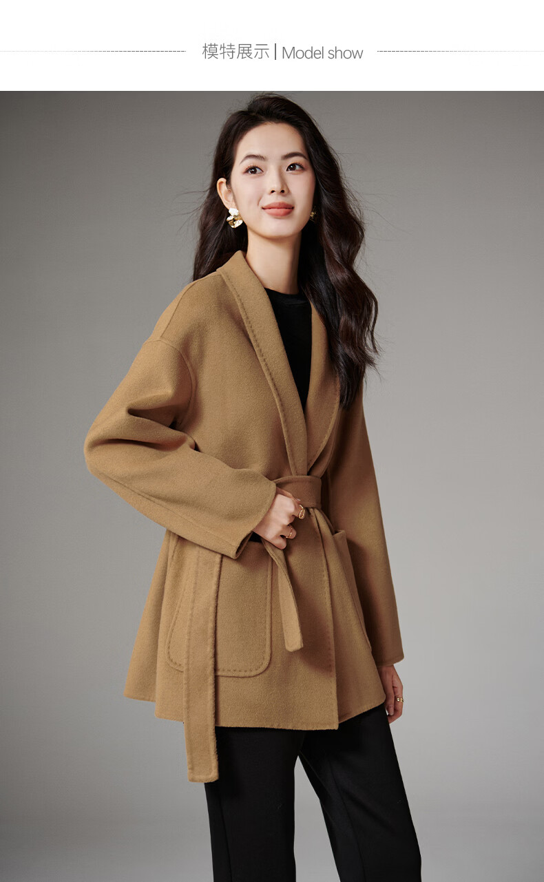 晚白【断码清仓】冬洋气小个子高级感收腰系带法式短款双面呢羊毛大衣 卡其色 XL