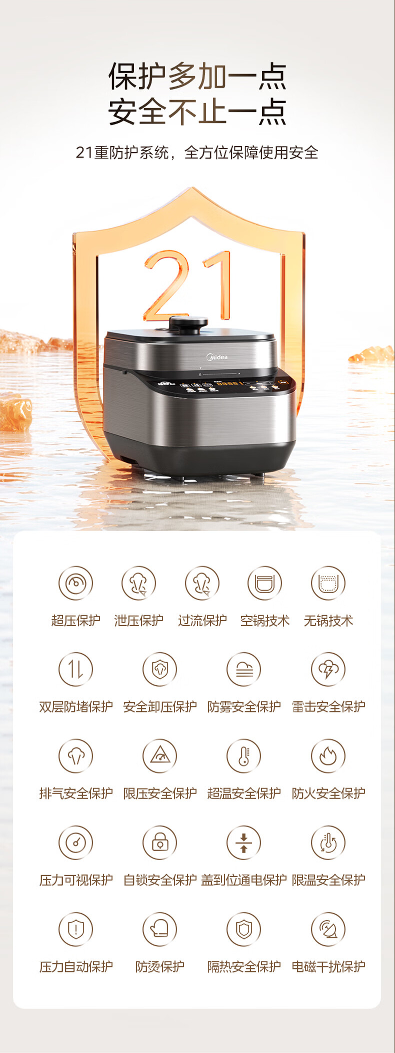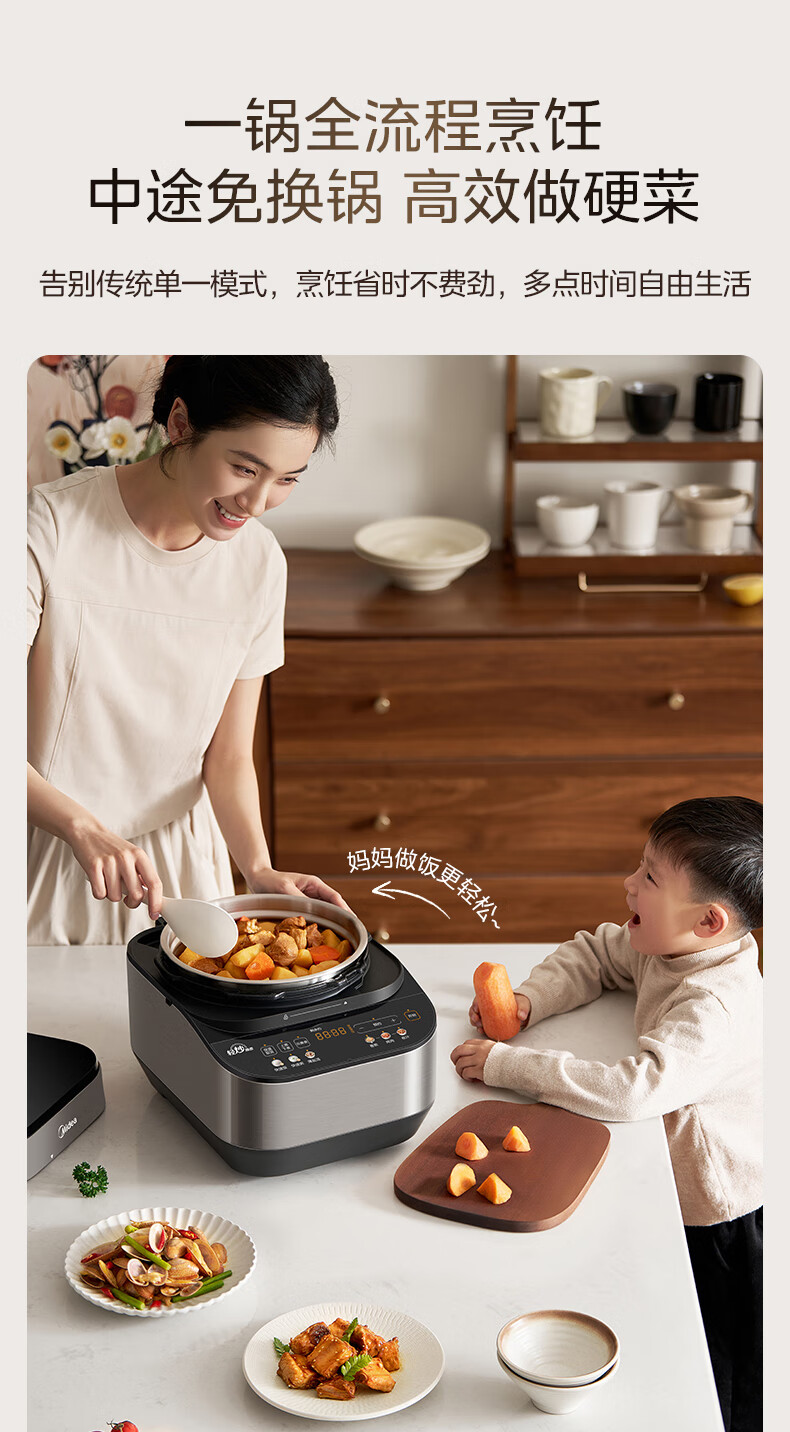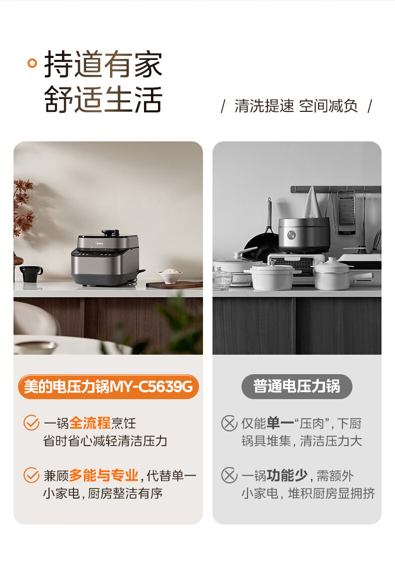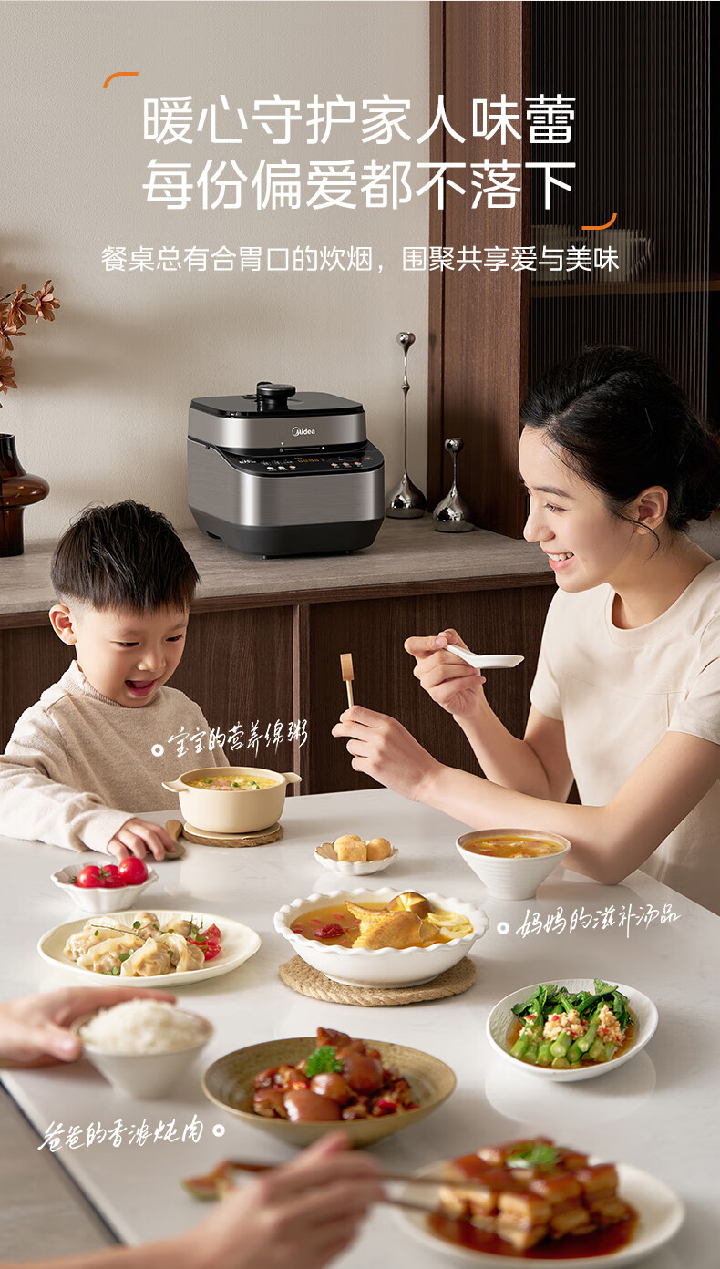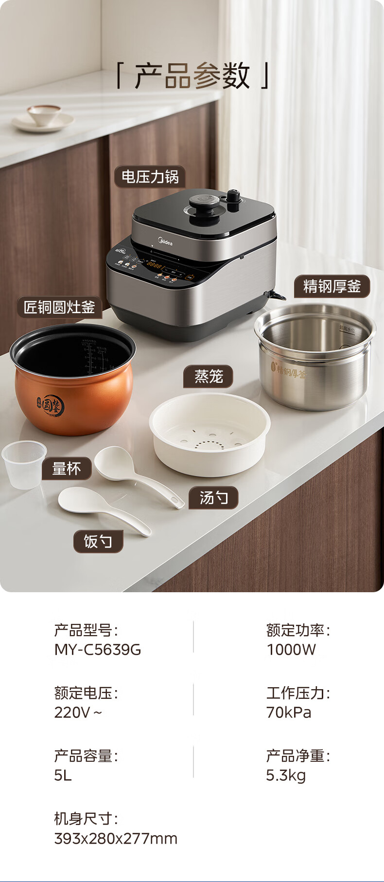 美的(Midea)电压力锅家用0涂层不锈钢精钢双胆多功能排气智能高压锅5L大米煮粥锅电饭煲 MY-C5639G 【0涂层钢胆+圆灶釜】5升 2-9人享 5L