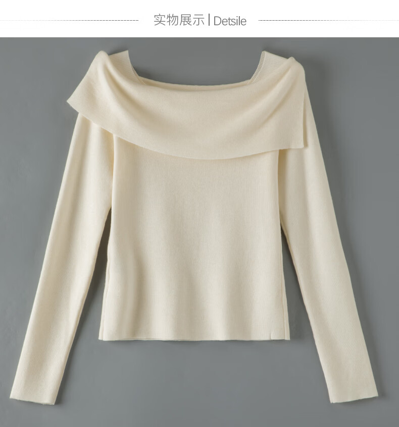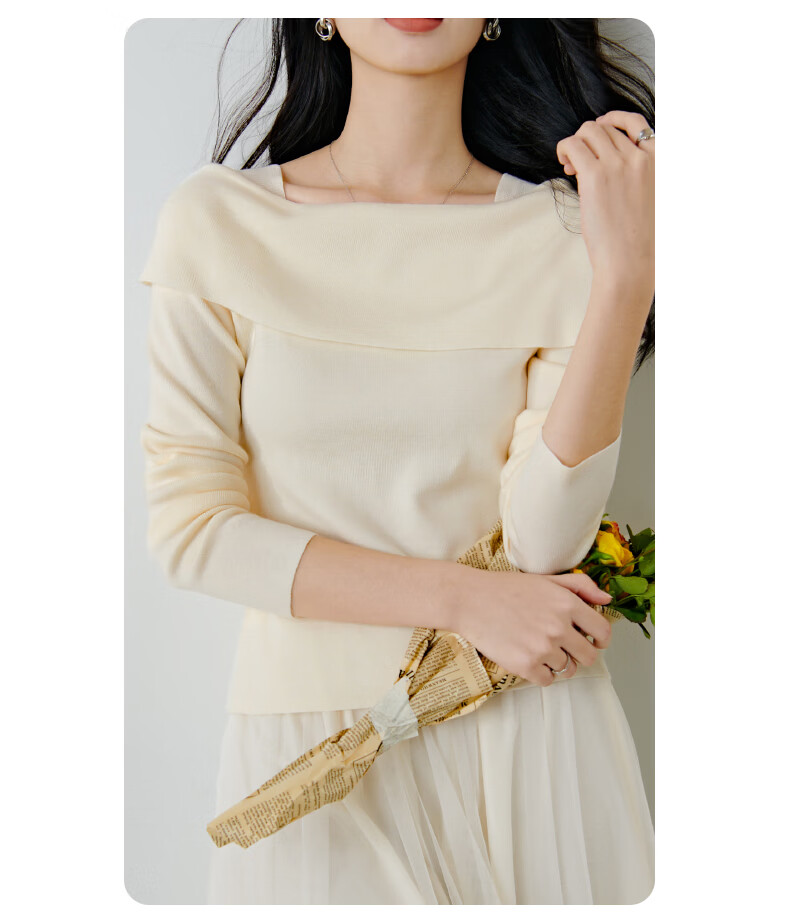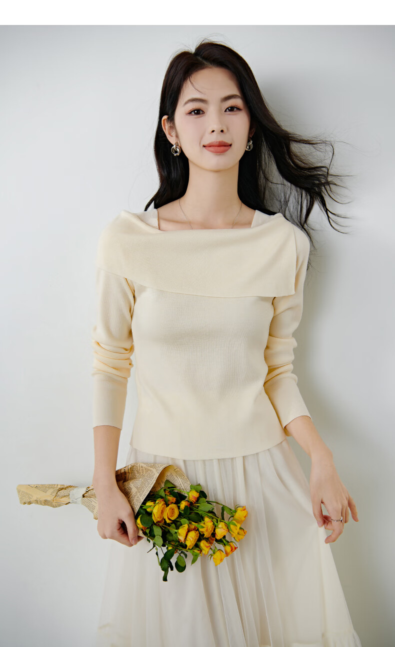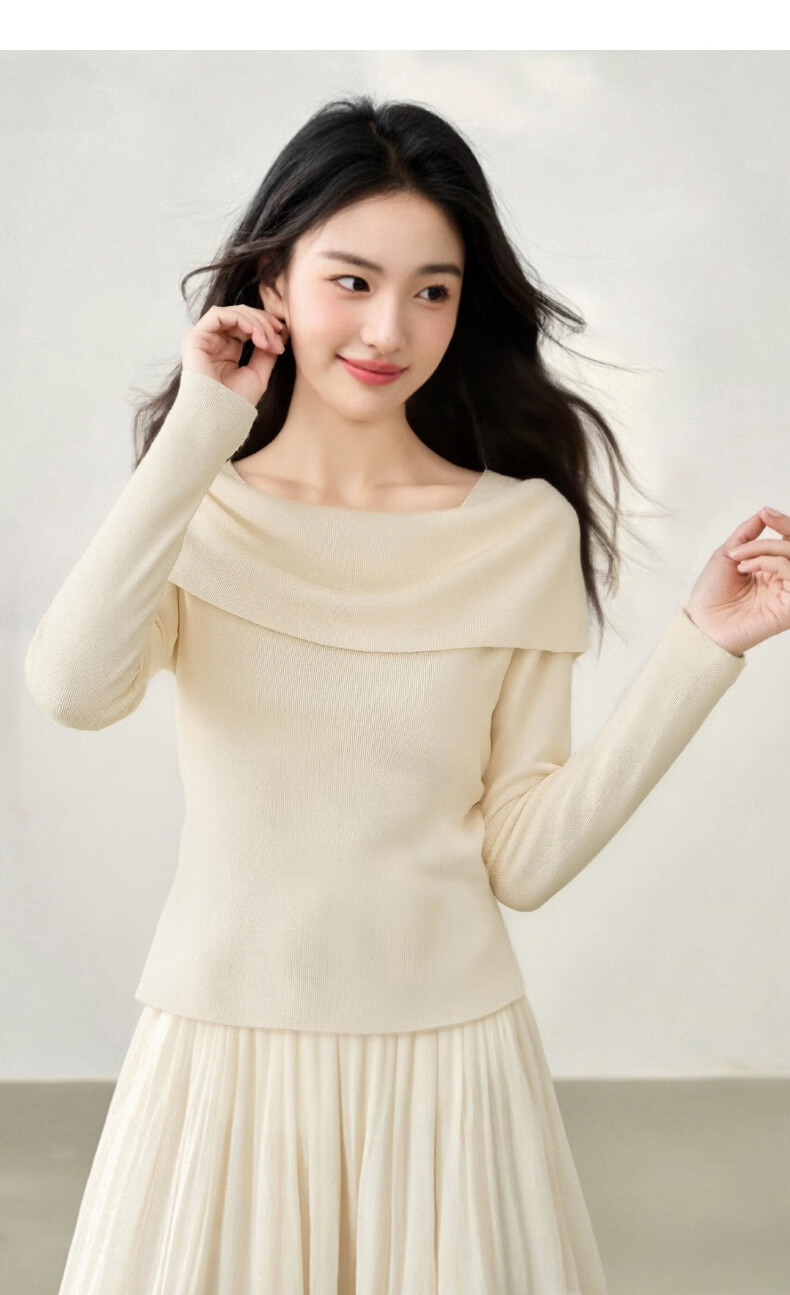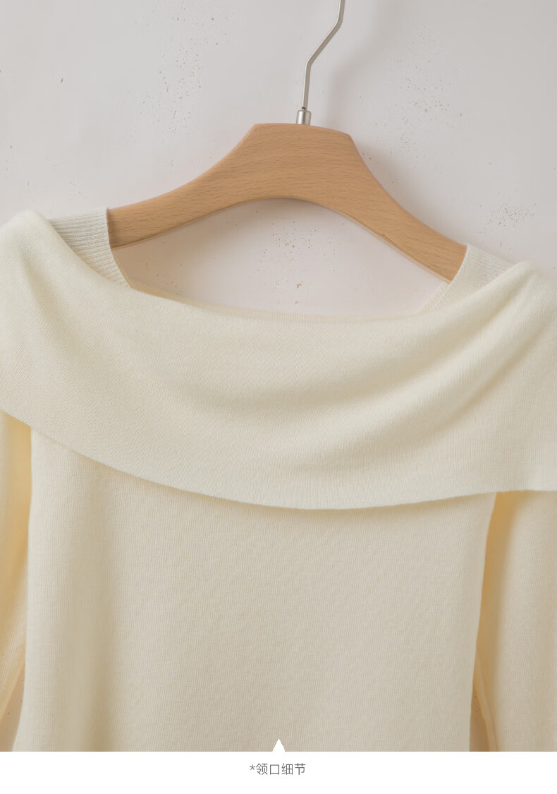 晚白2026春款时尚一字肩大翻领奶油风毛衣减龄显年轻舒适针织衫 米杏色 M