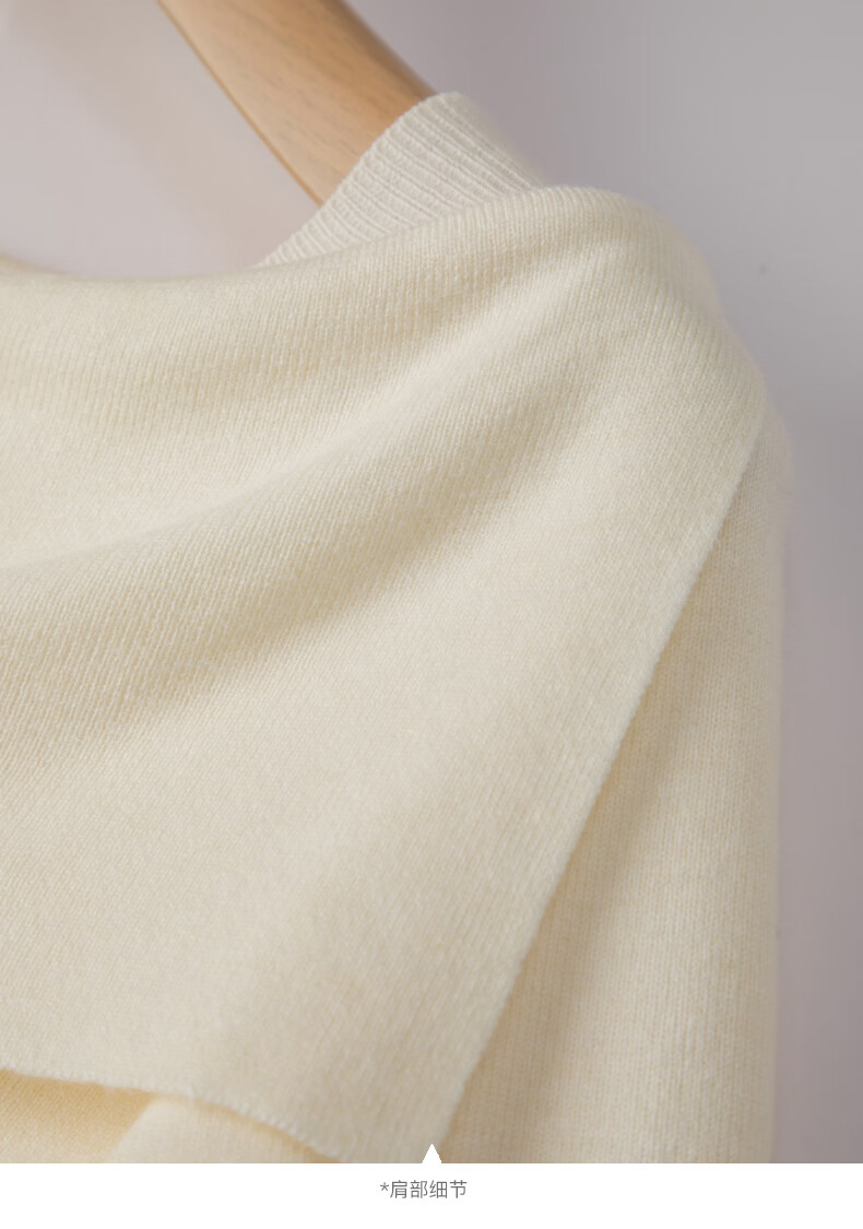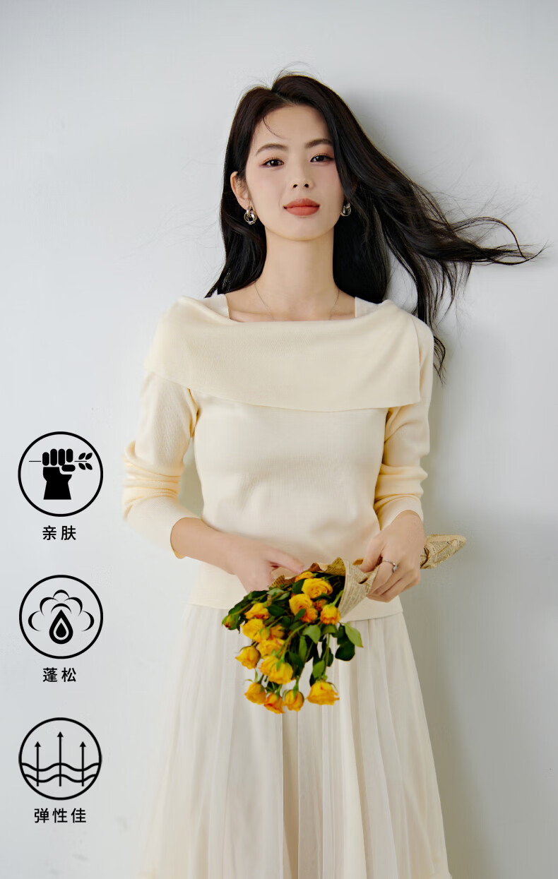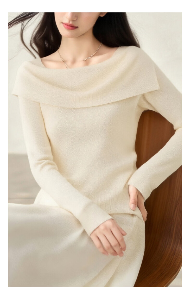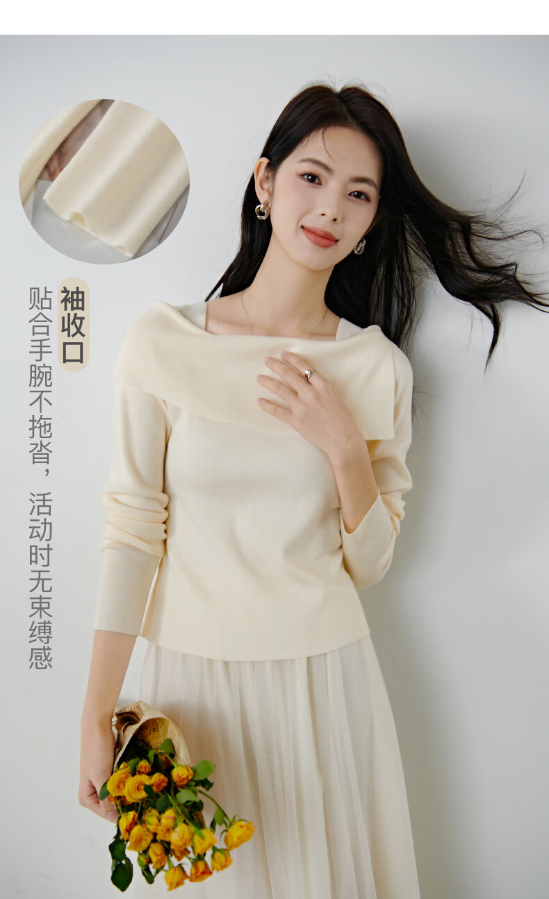 晚白2026春款时尚一字肩大翻领奶油风毛衣减龄显年轻舒适针织衫 米杏色 M