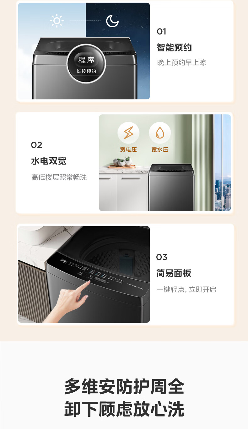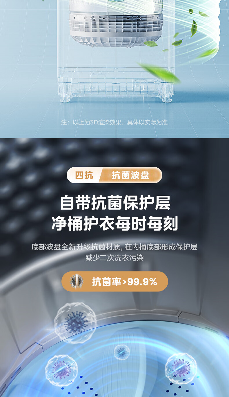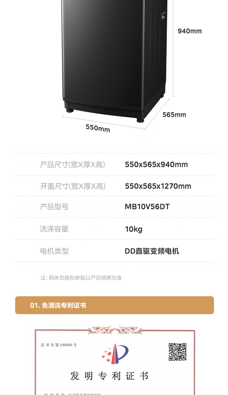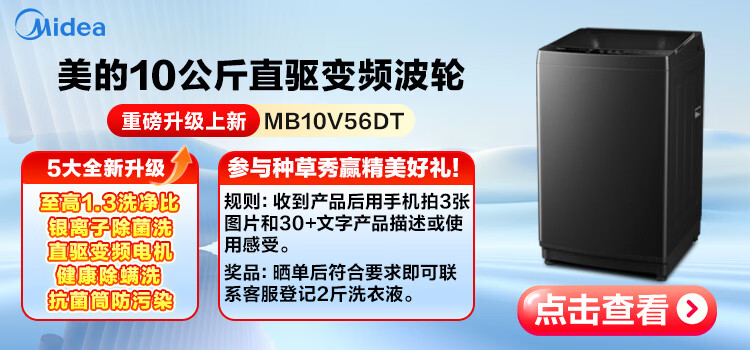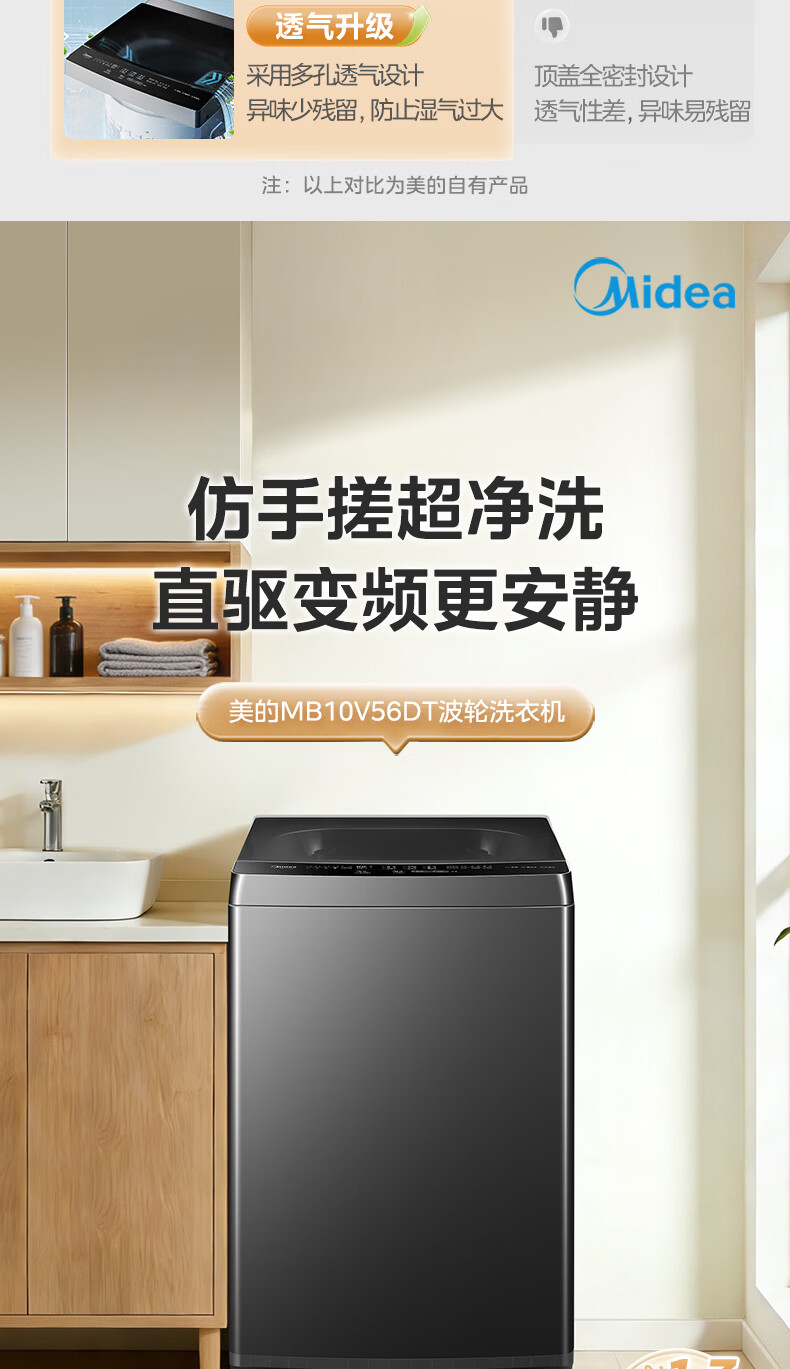 美的(Midea)全自动波轮洗衣机10公斤V36DT直驱变频更节能家用大容量一级能效出租房宿舍必备 除螨家电政府补贴 一级能效 MB100V36DT 波轮 10kg