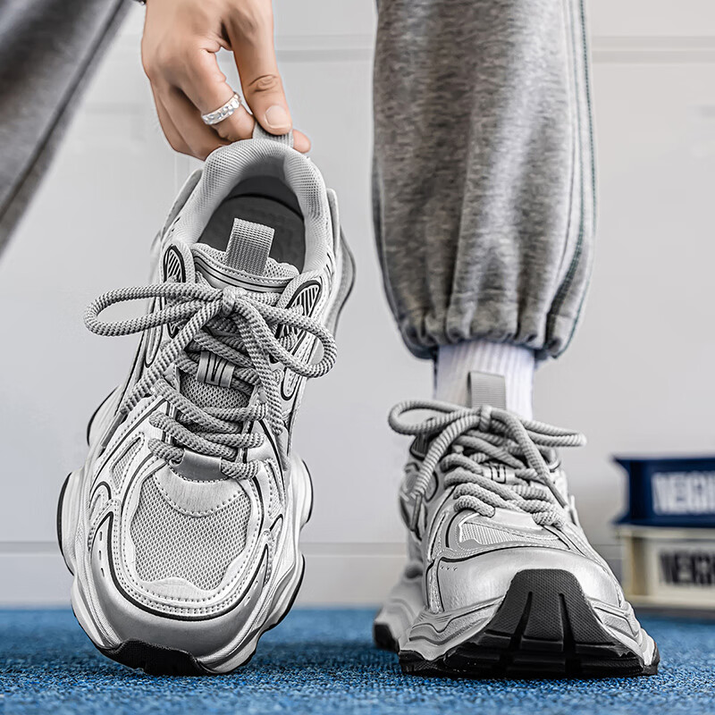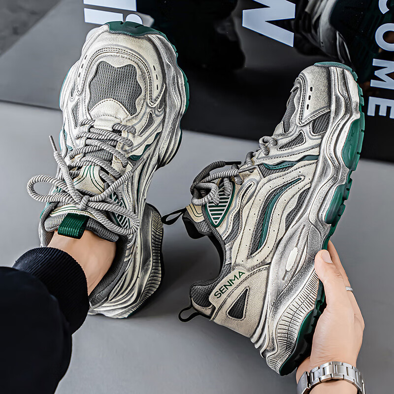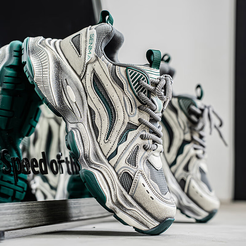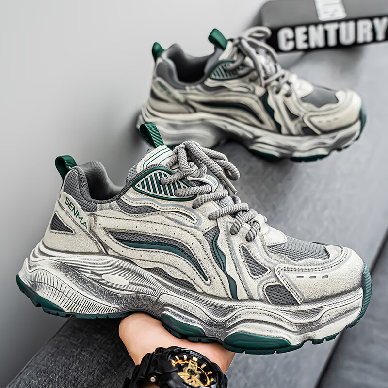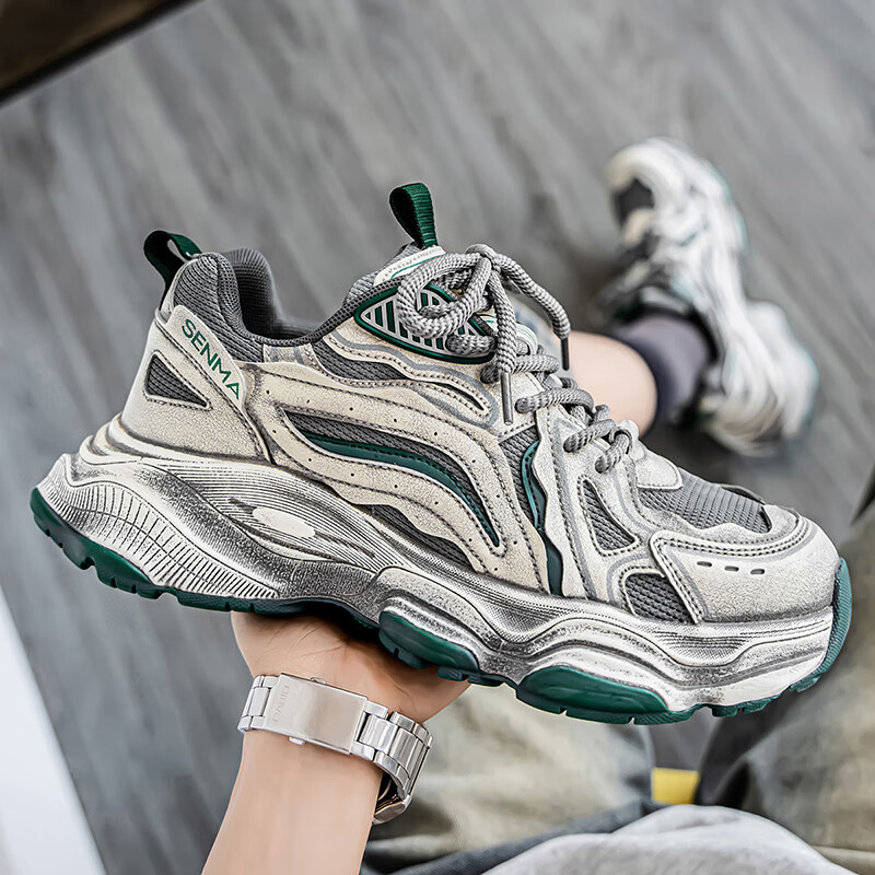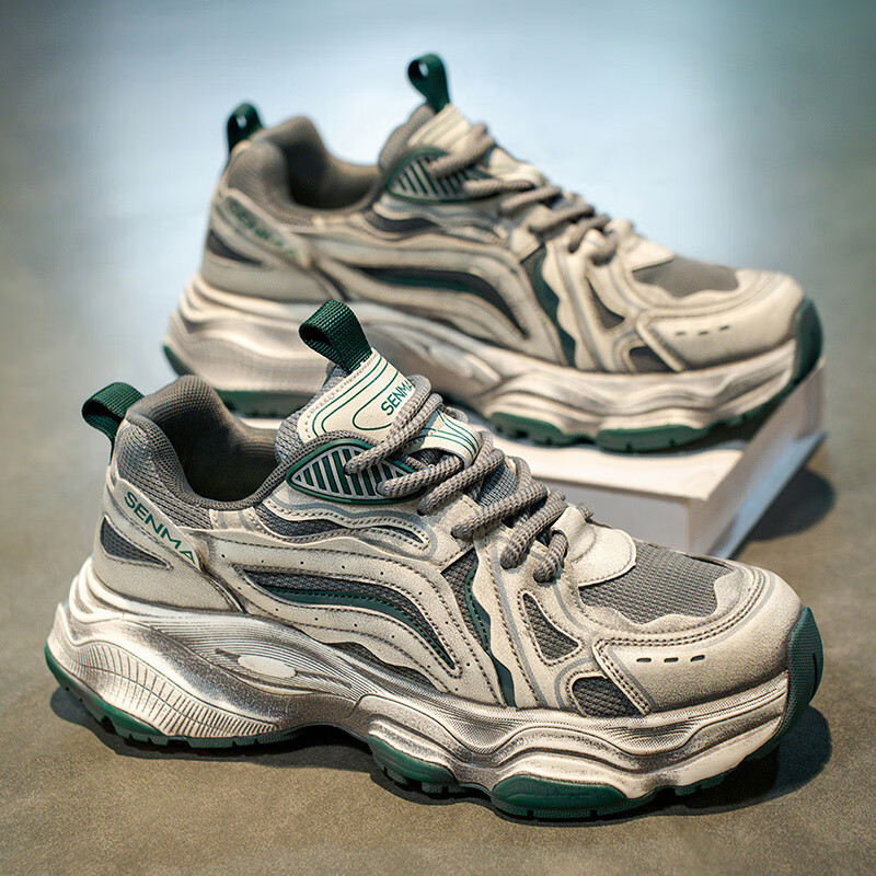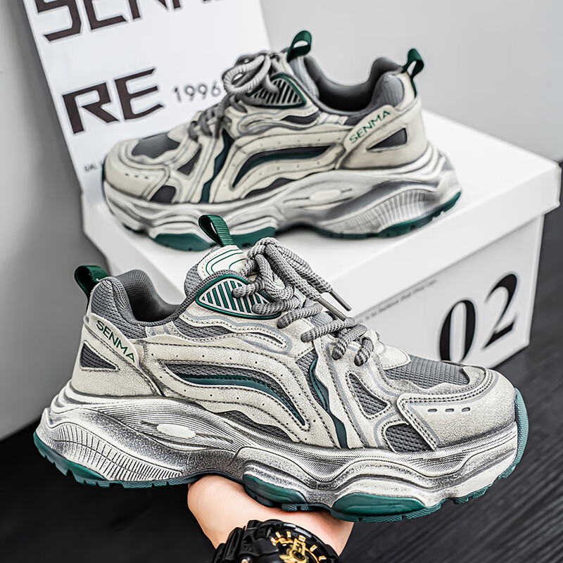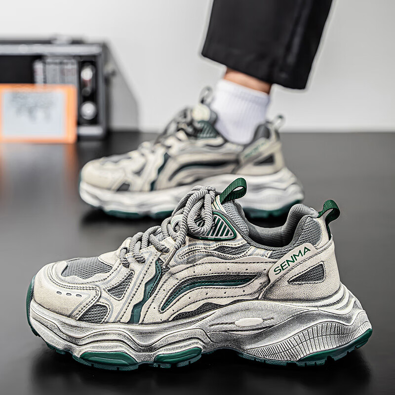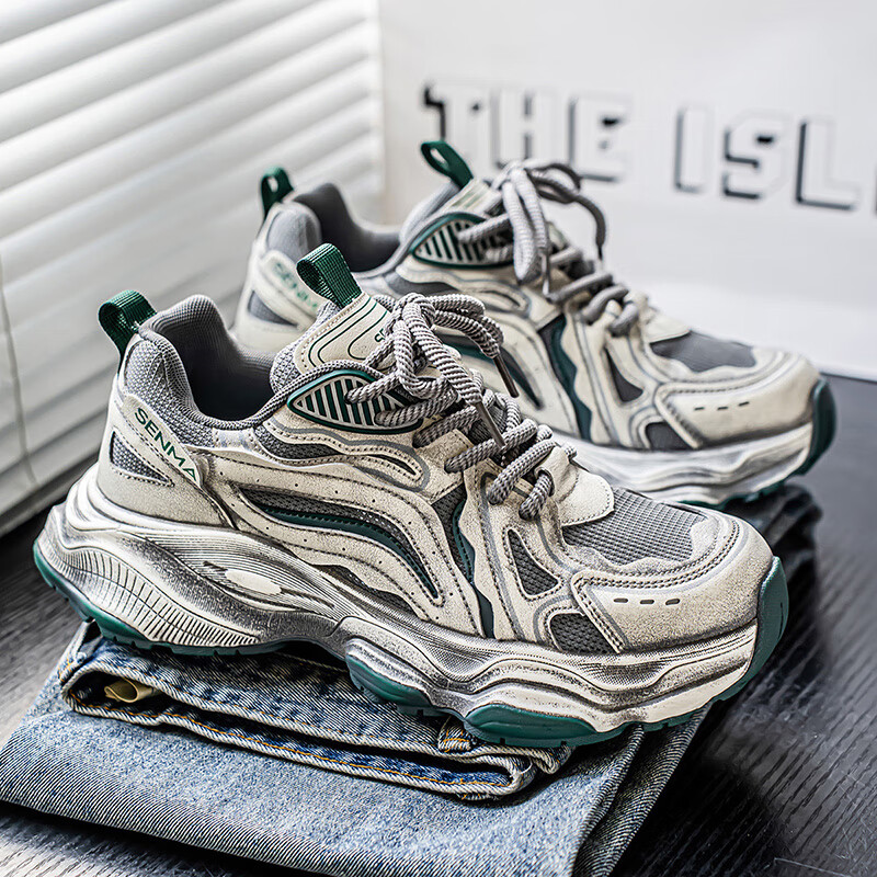 森馬男鞋2026新款夏季网面透气休闲运动跑步鞋男士复古厚底增高老爹鞋 灰绿【升级款】 41 标准码数/现货秒发