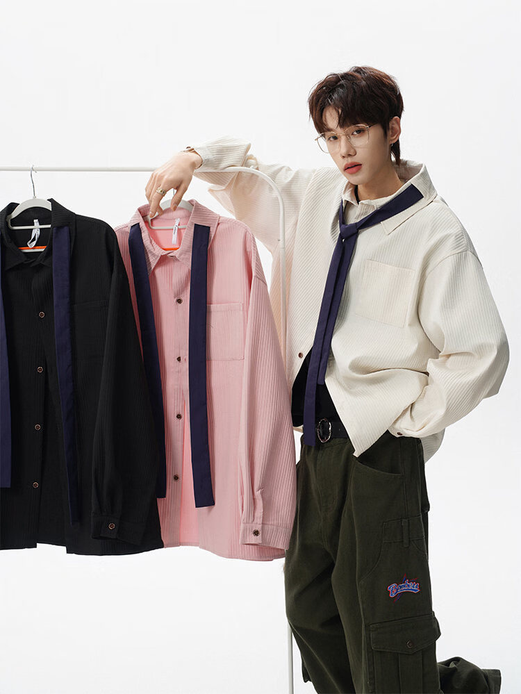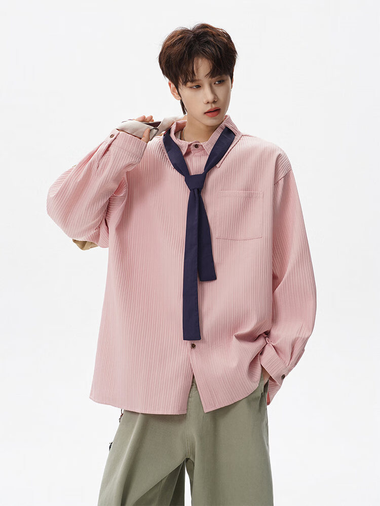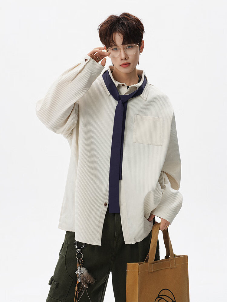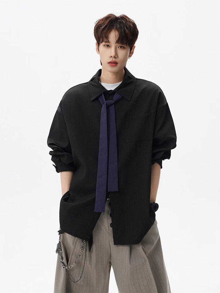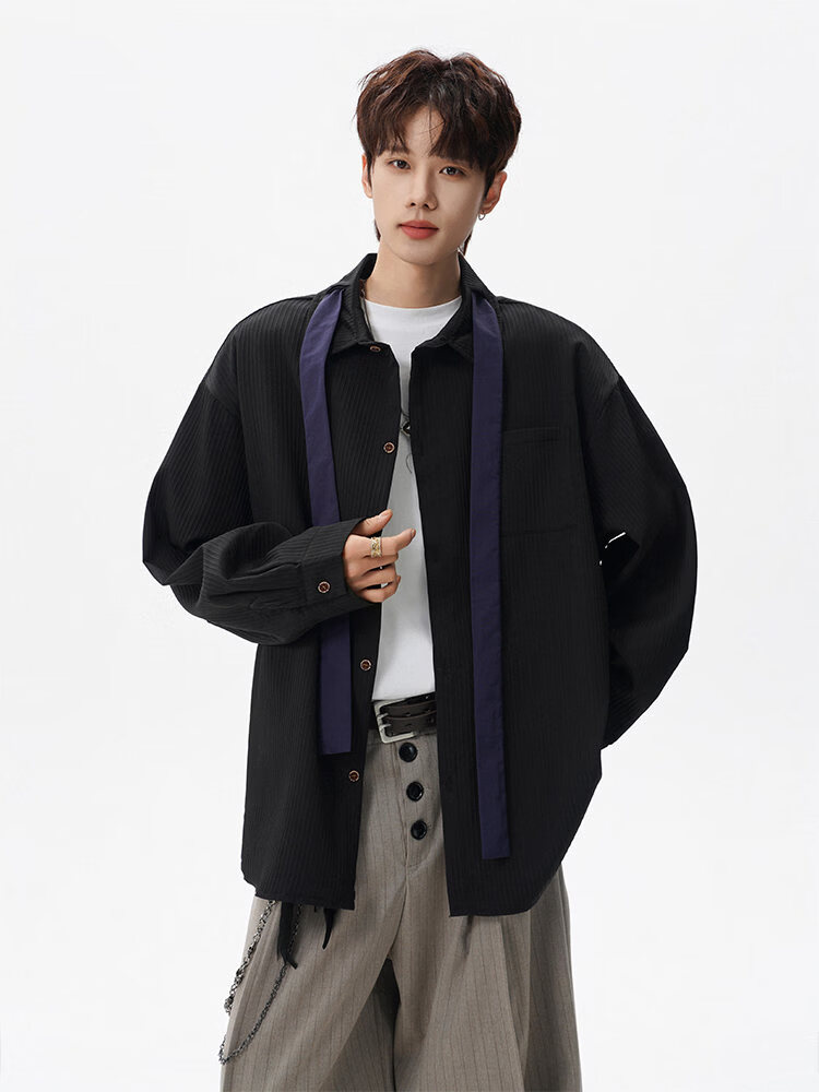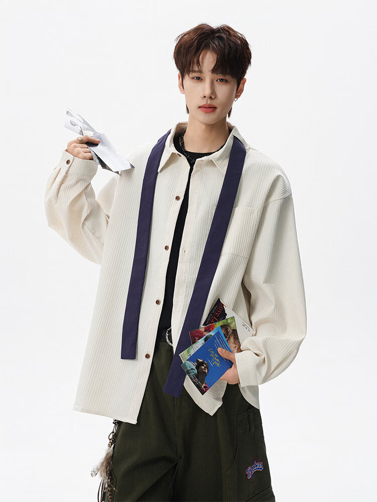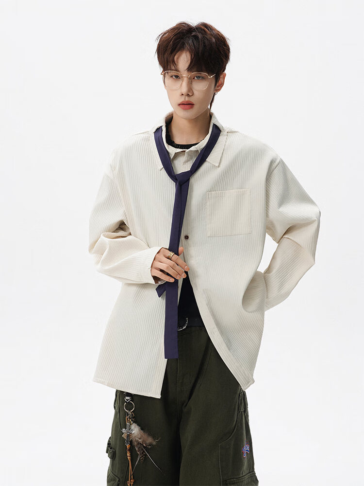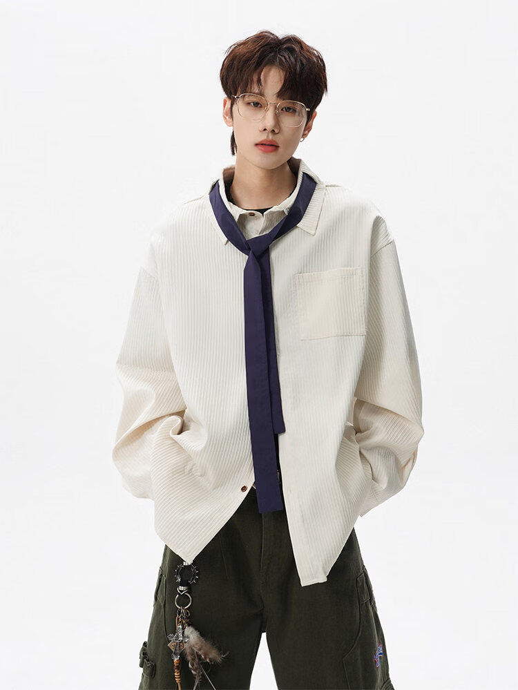 NEW OR MODE肌理感条纹长袖衬衫男春夏季新款复古宽松高级感百搭翻领上衣外套 米白【送领带】 XL 【建议125-145斤】