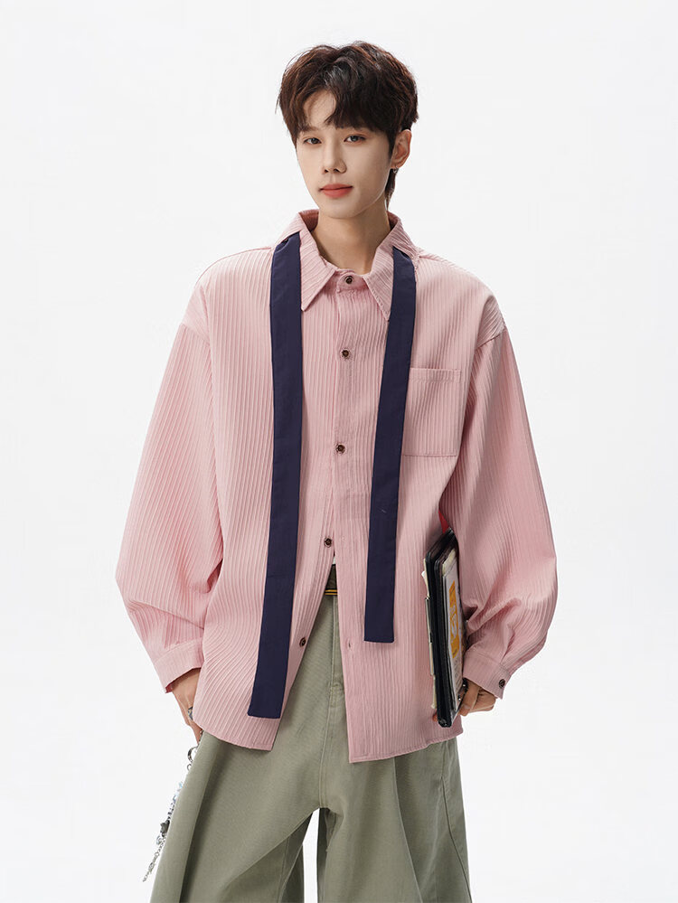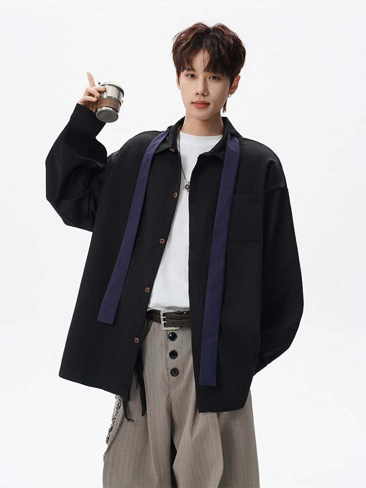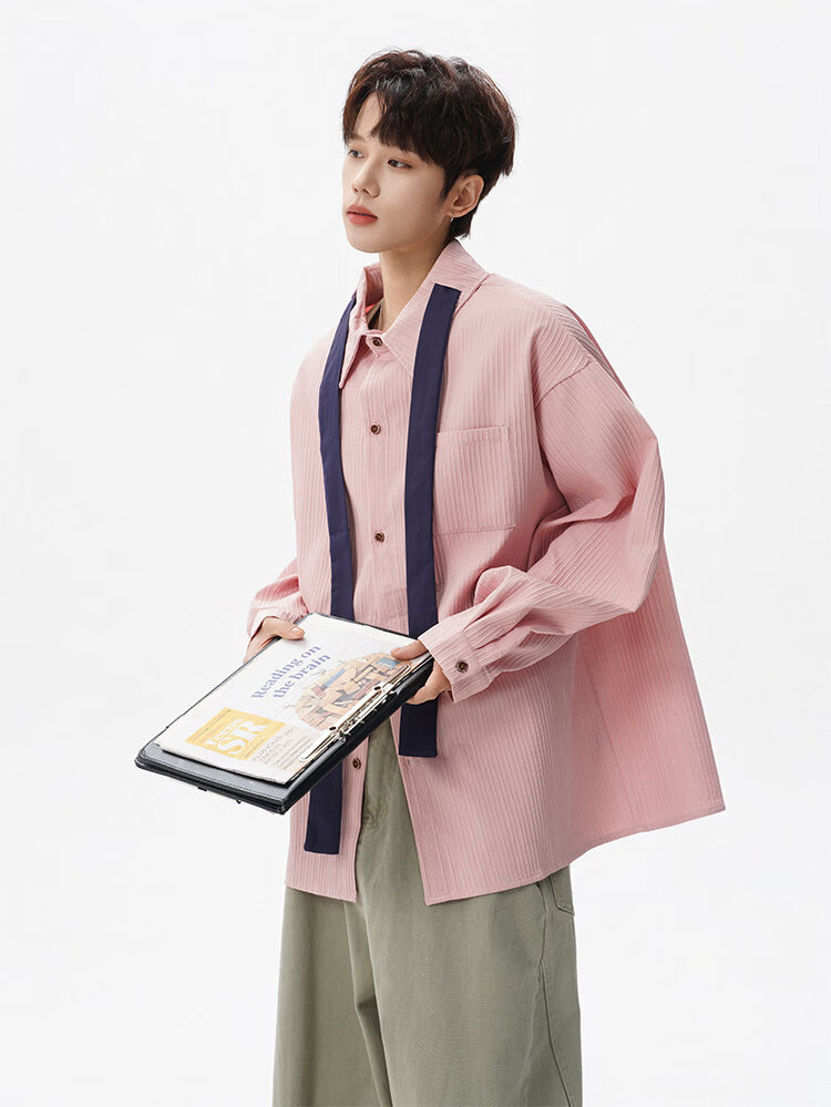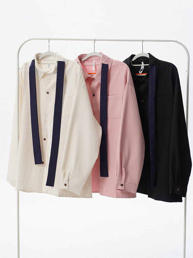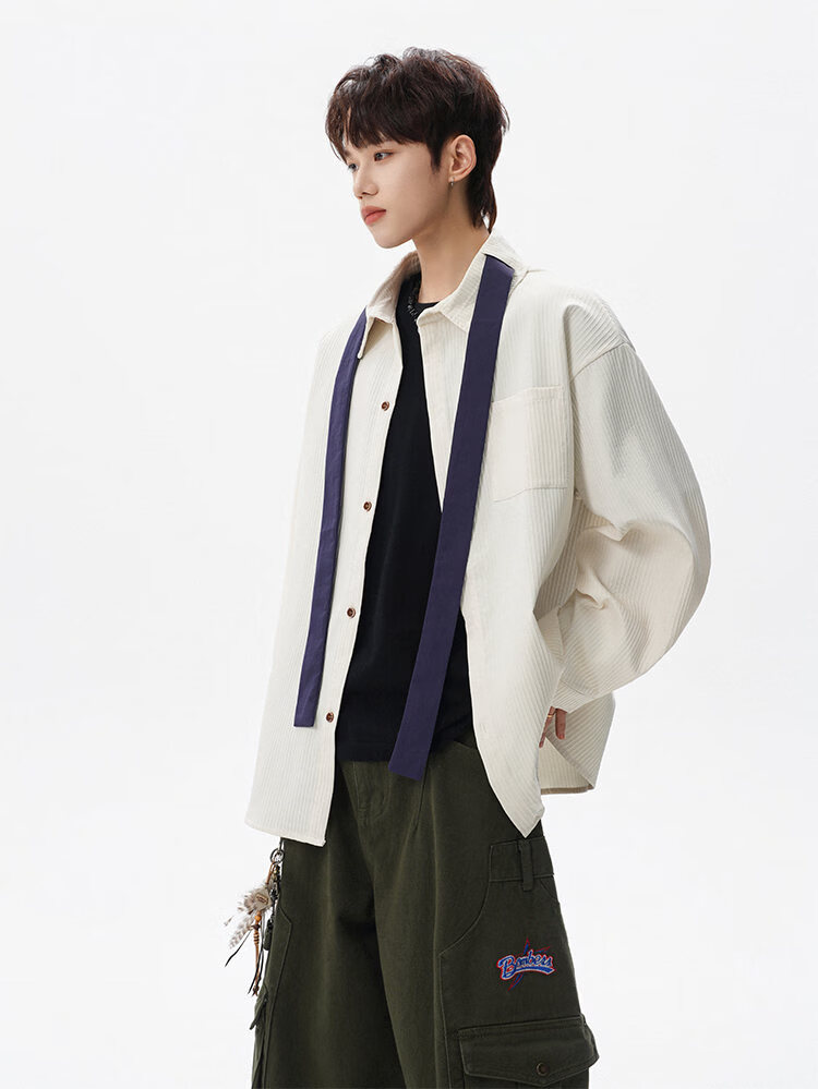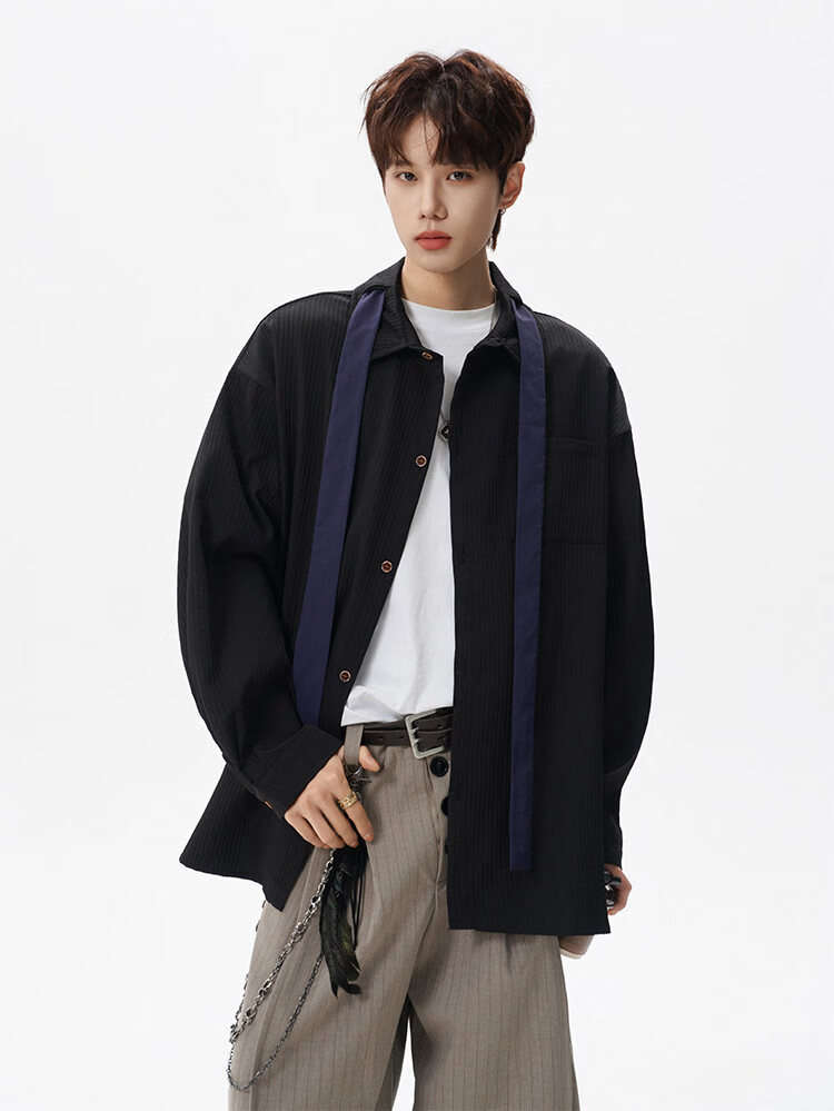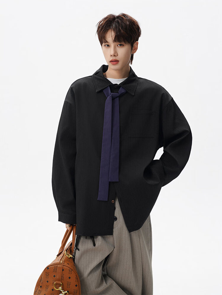 NEW OR MODE肌理感条纹长袖衬衫男春夏季新款复古宽松高级感百搭翻领上衣外套 米白【送领带】 XL 【建议125-145斤】