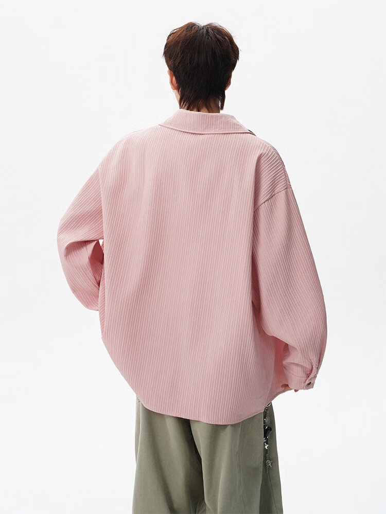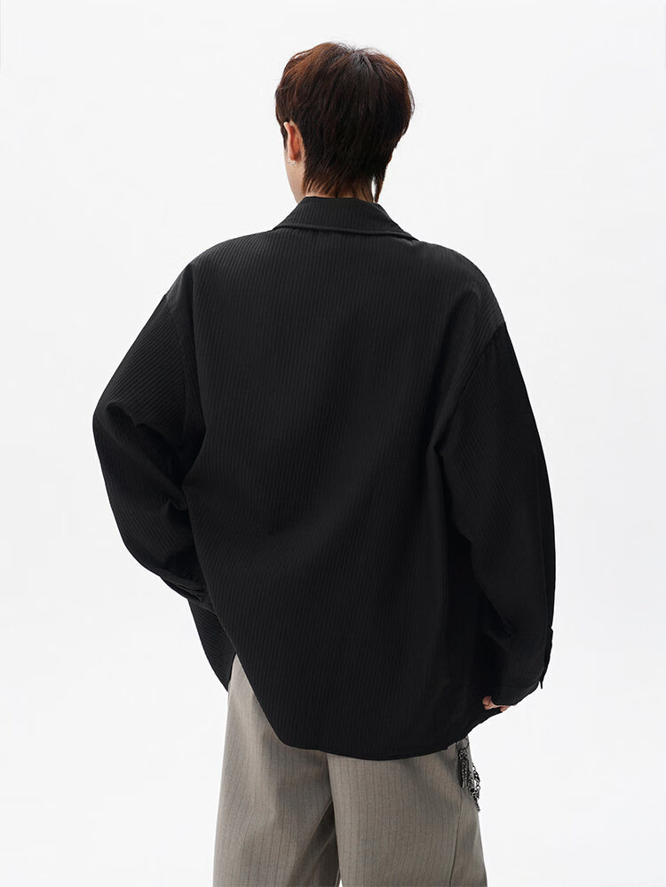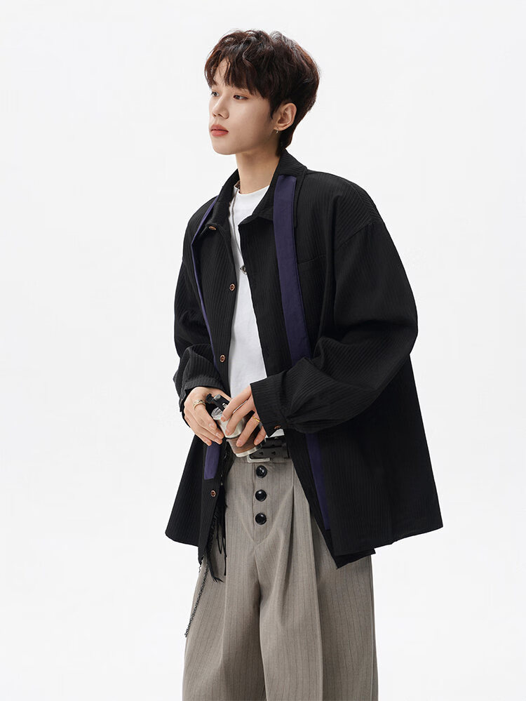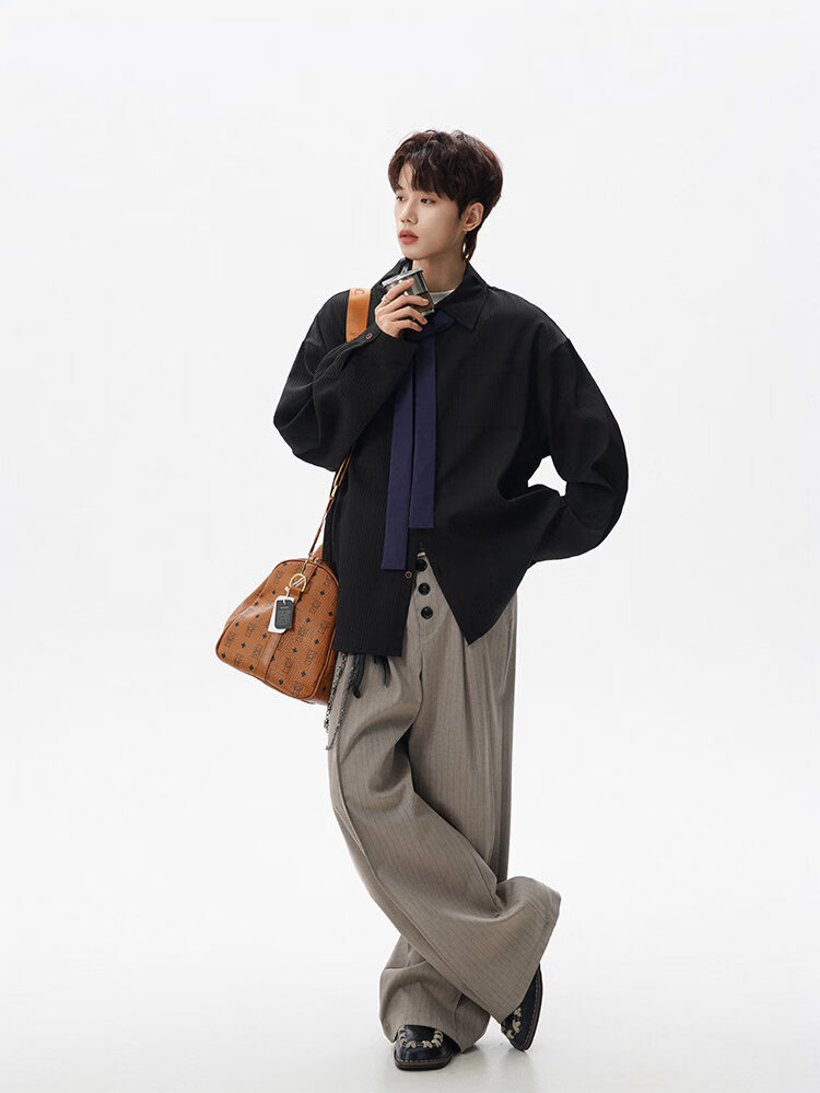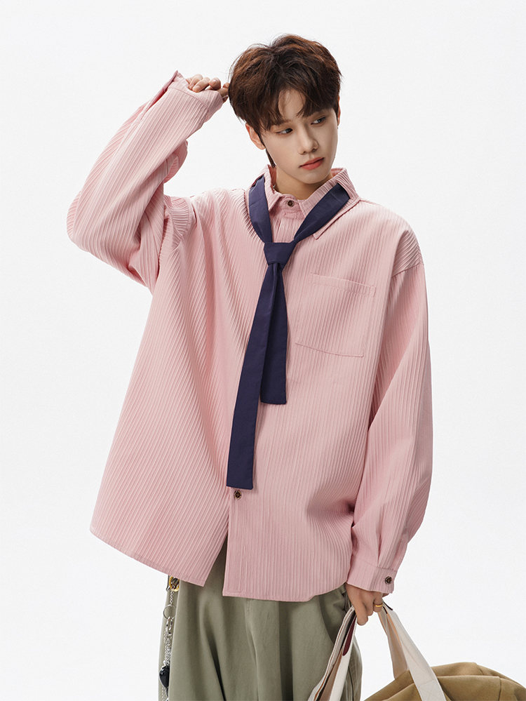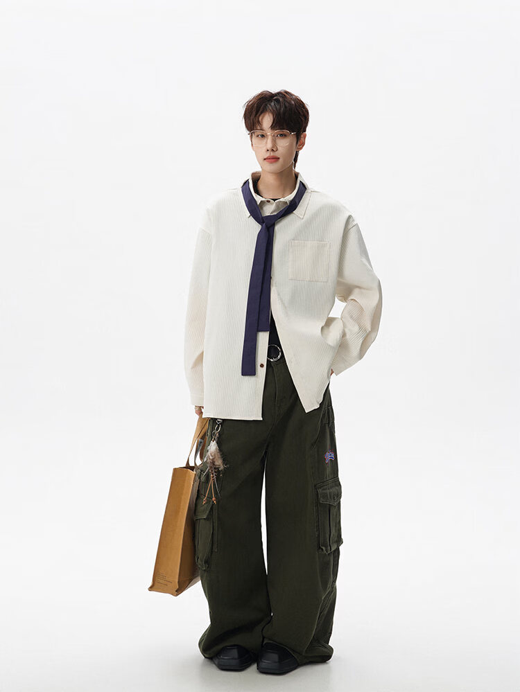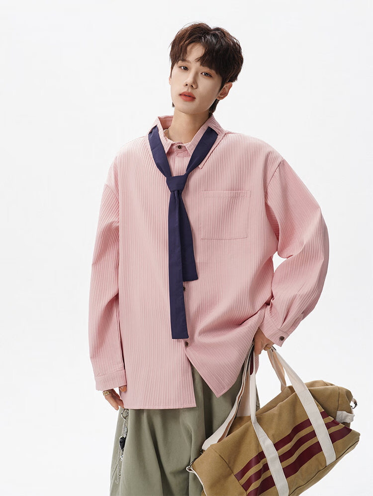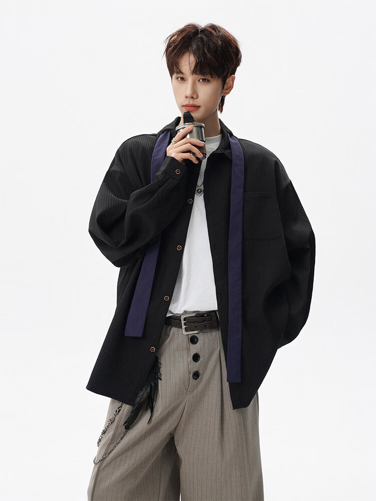 NEW OR MODE肌理感条纹长袖衬衫男春夏季新款复古宽松高级感百搭翻领上衣外套 米白【送领带】 XL 【建议125-145斤】