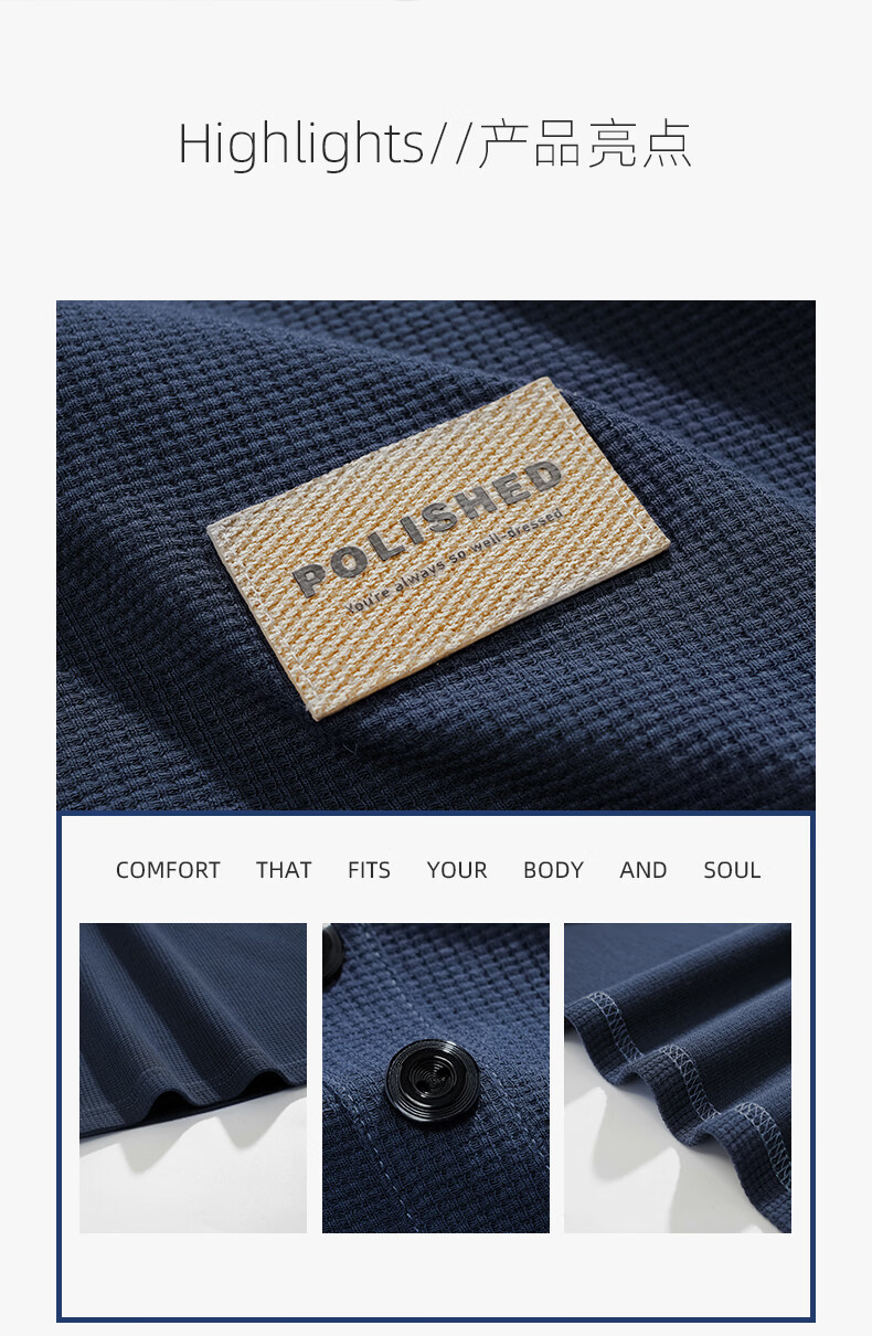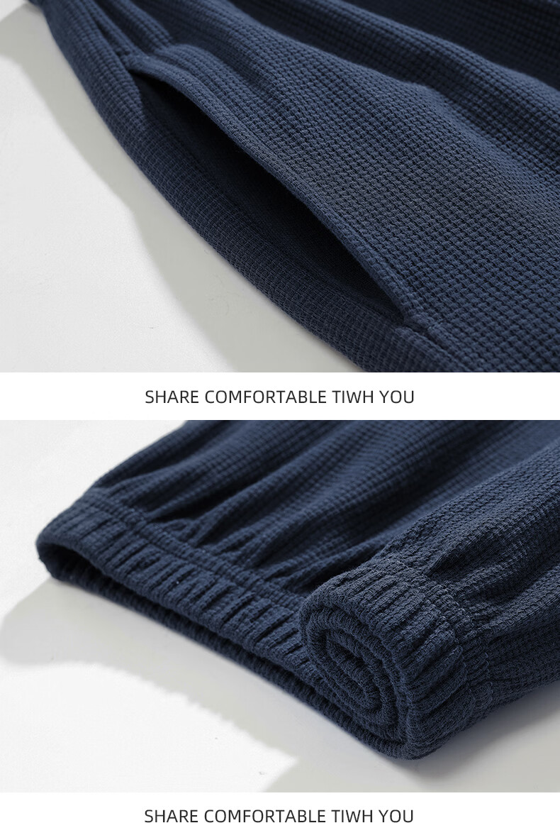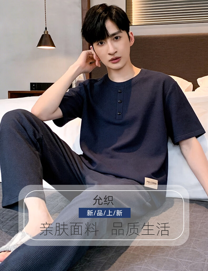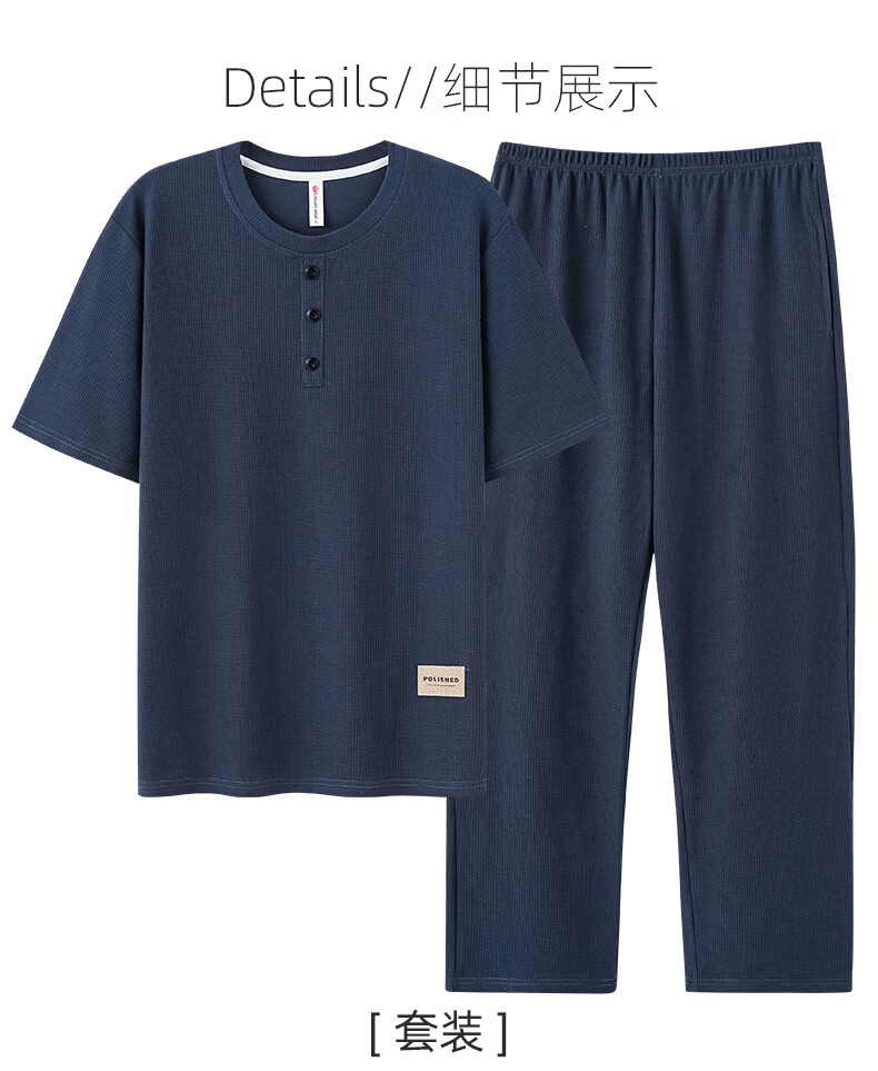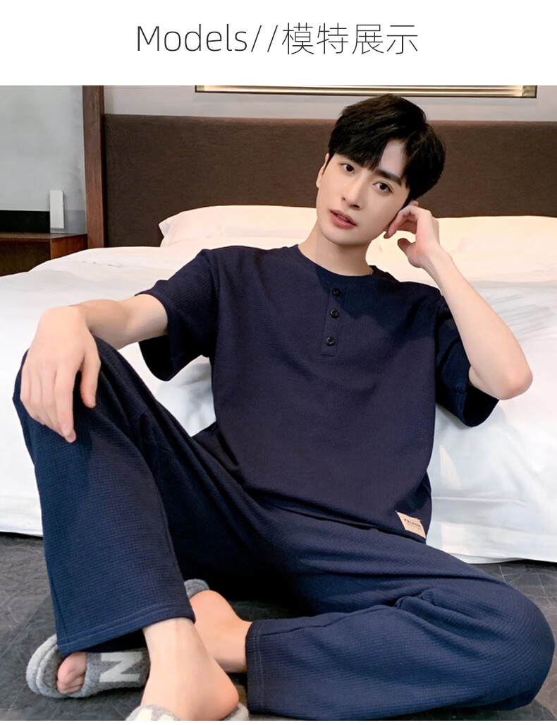 允织华夫格纯棉睡衣男士夏季短袖长裤宽松大码夏天薄款男款家居服套装 2401-深蓝 L (170) :建议110-140斤穿着