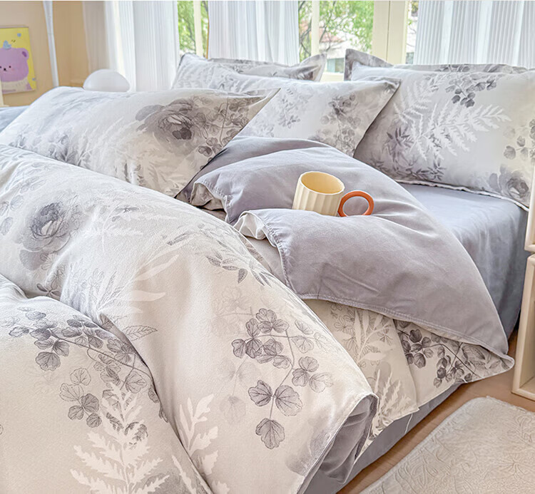 VJEA类高克重牛奶绒四件套雕花双拼角加绒加厚床单被套公主风床上用 蝶花园-香芋紫 四件套1.5m 床单款 (被套200*230cm)