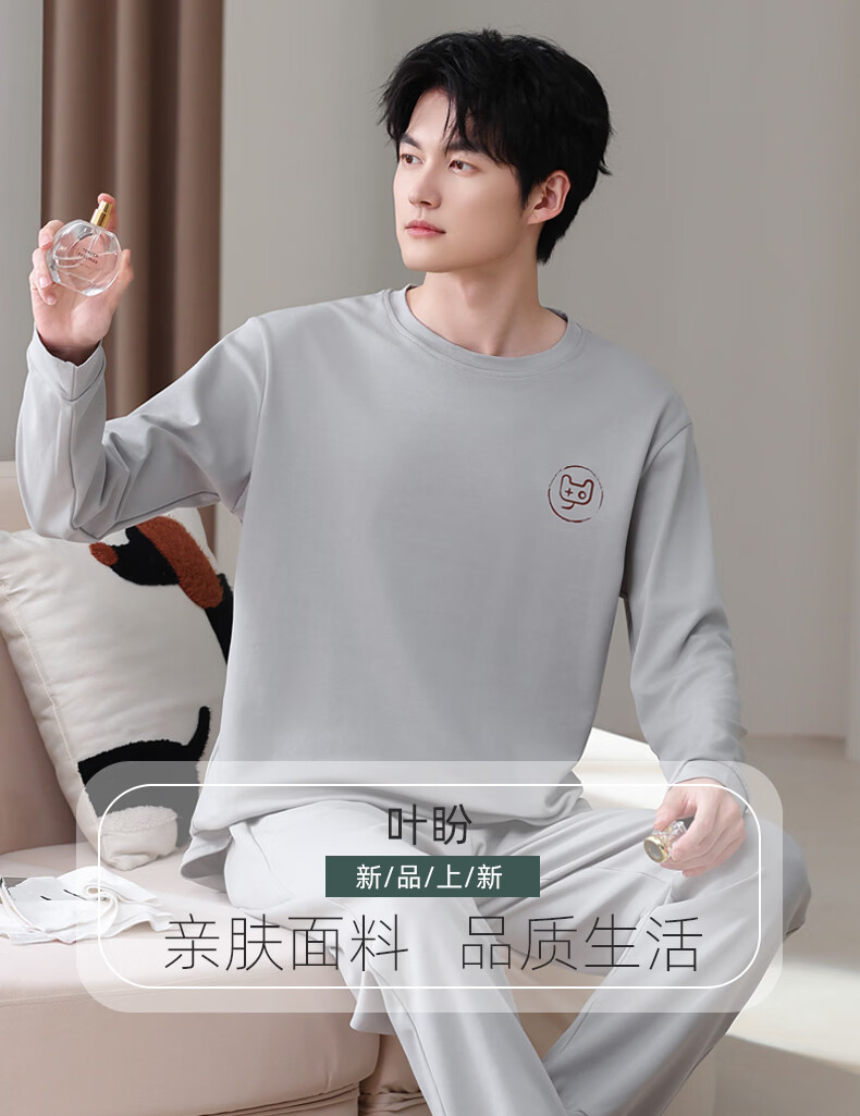 叶盼(yepan)【柔软】莱卡纯棉睡衣男士春秋长袖宽松大码高级感男款家居服套装 8609-浅灰 L (170) :建议100-135斤穿着