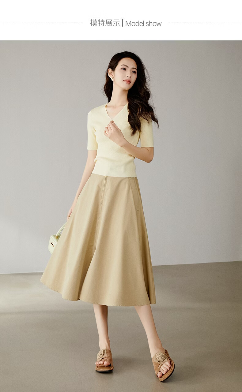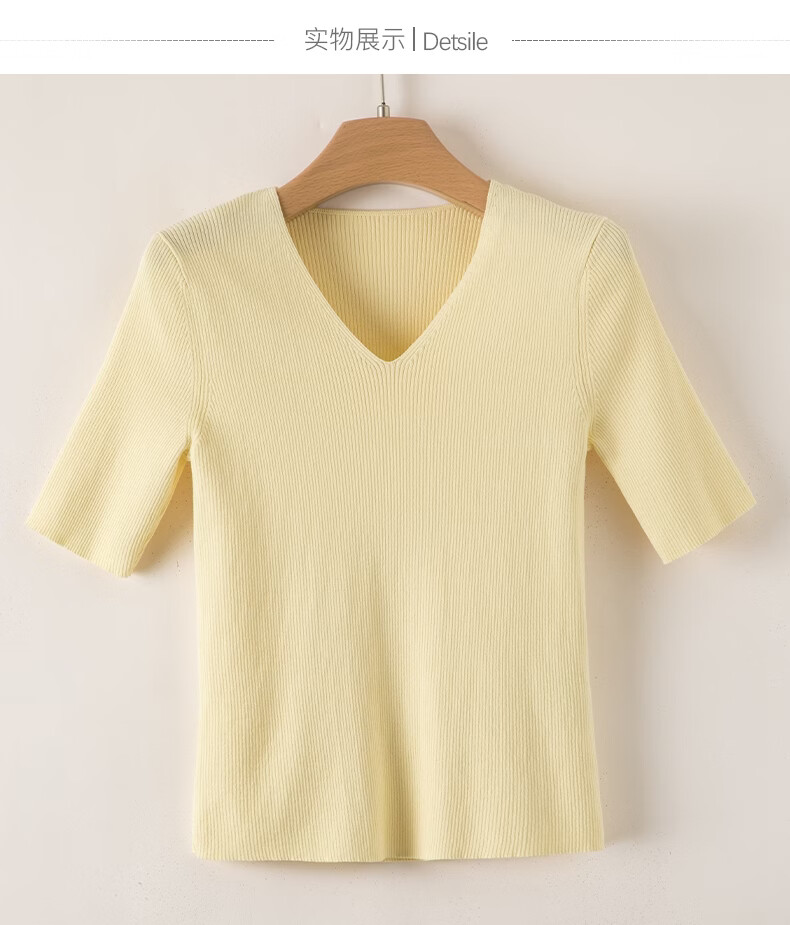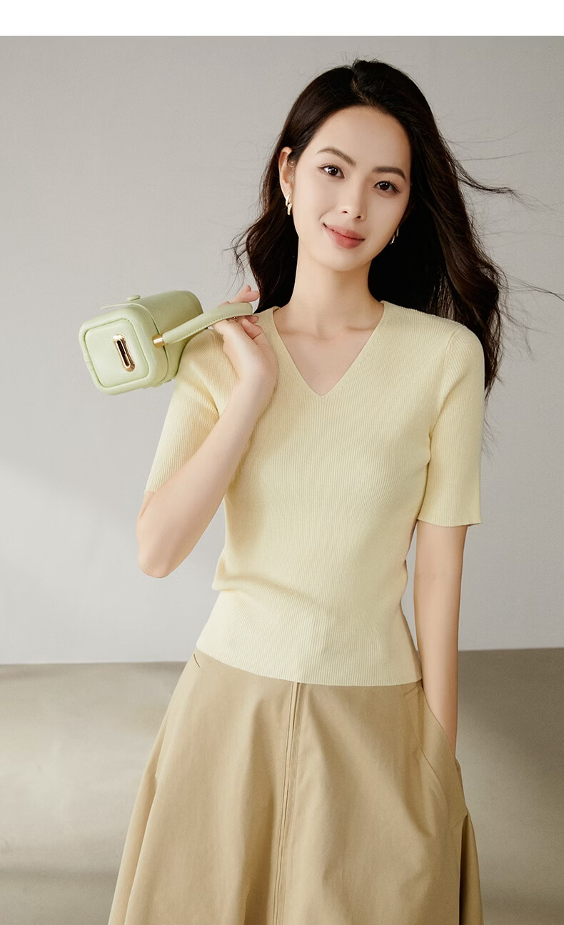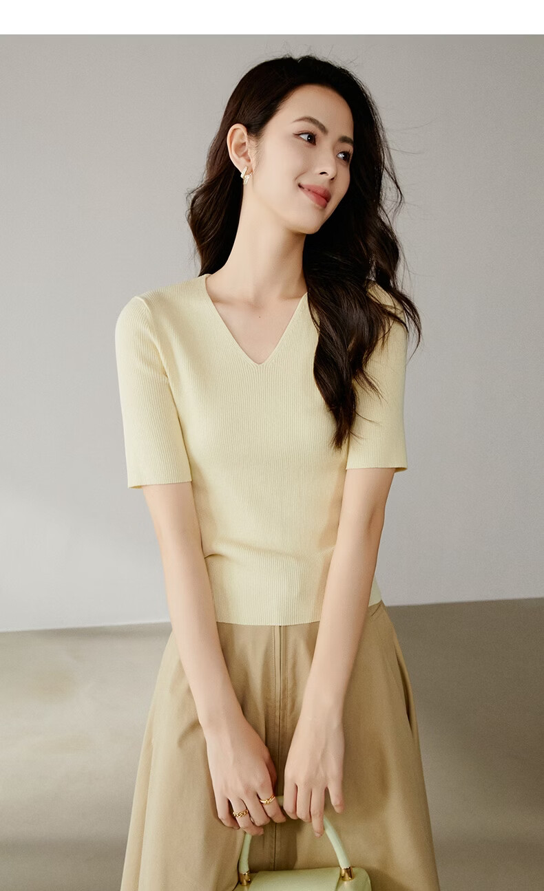 晚白【新品】2026年春款时尚V领短袖正肩显瘦修身弹力针织衫女 米黄色 L