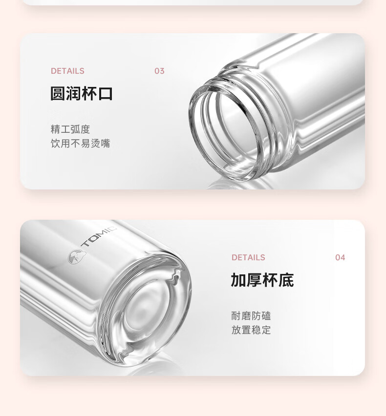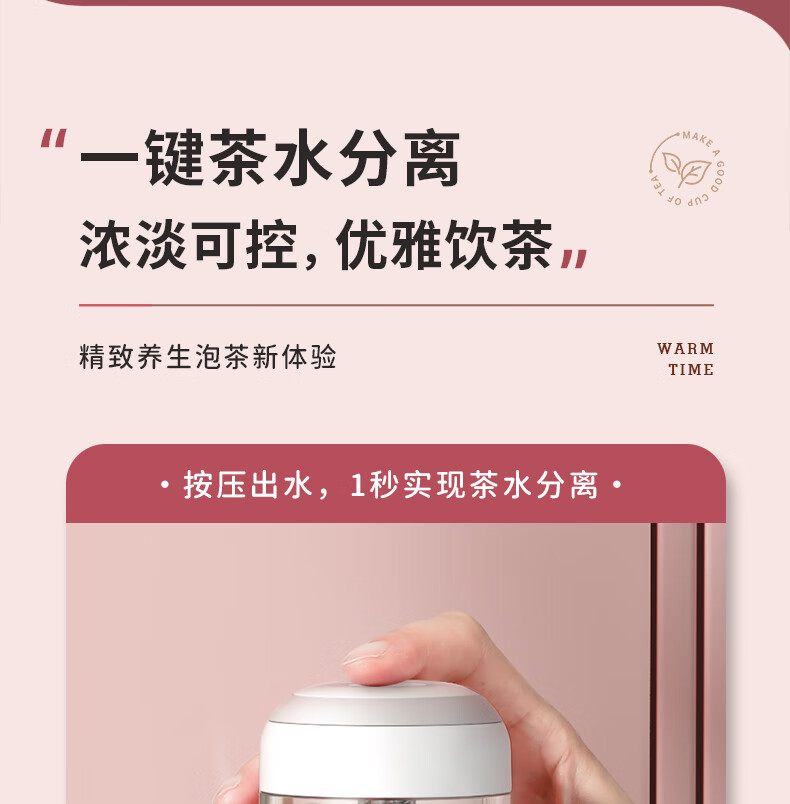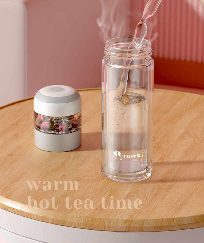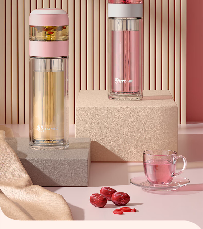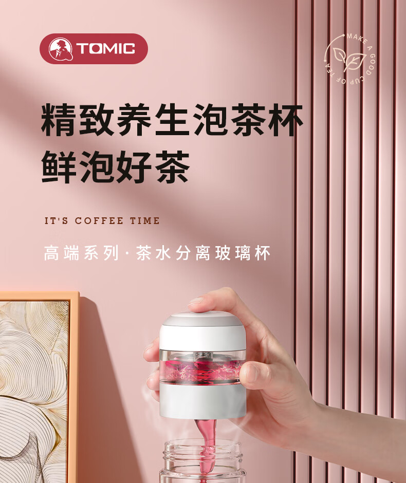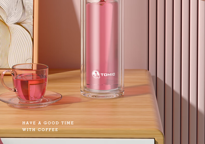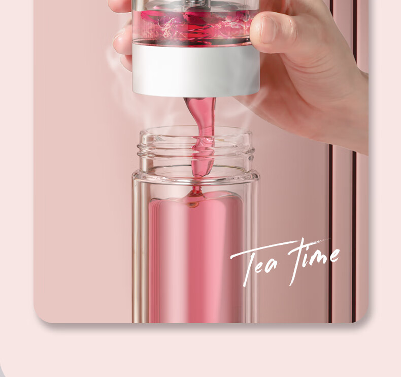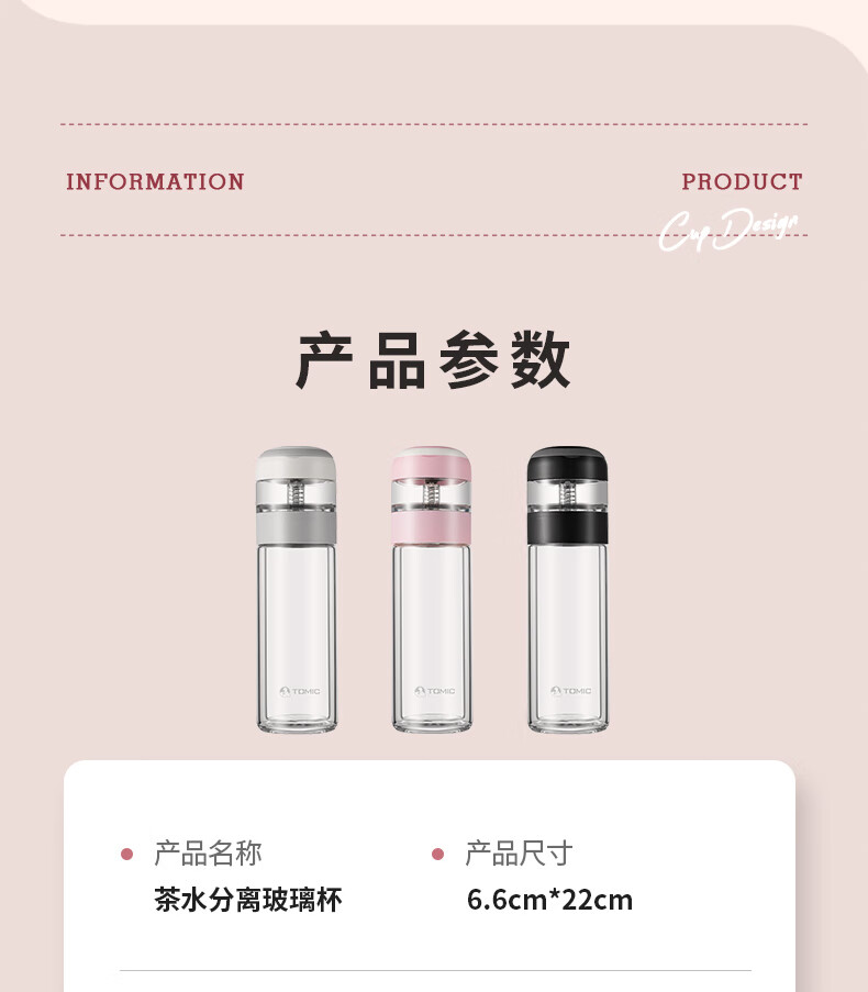 特美刻(TOMIC)双层加厚玻璃杯高硼硅玻璃水杯女士高颜值茶水分离泡茶 千禧粉260ml