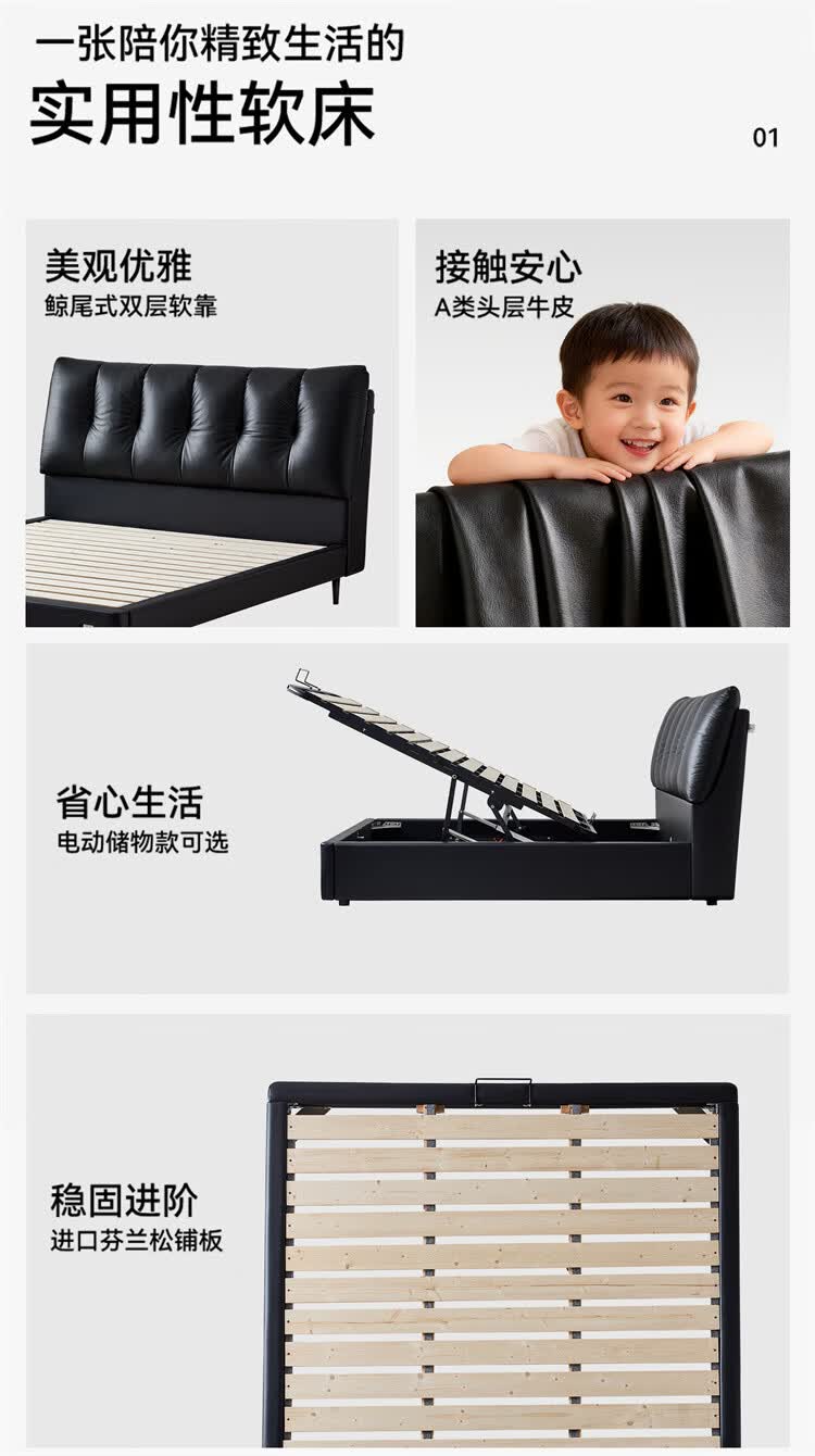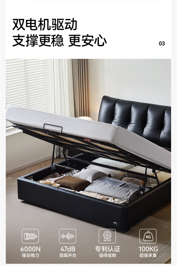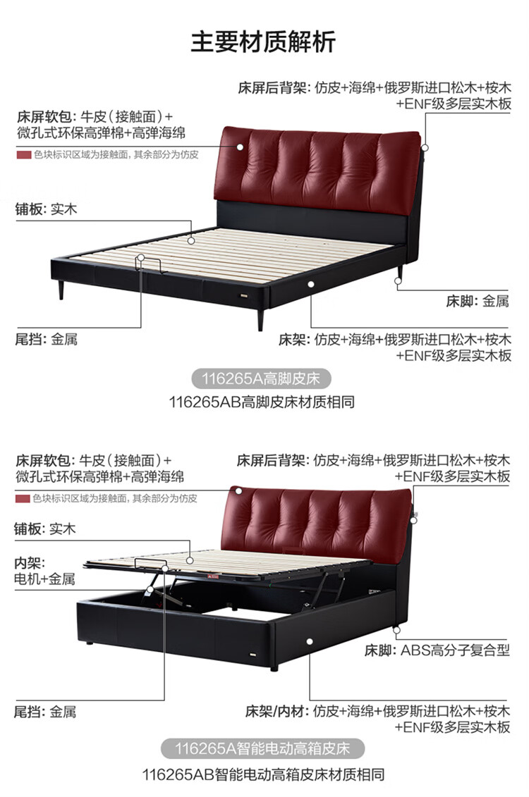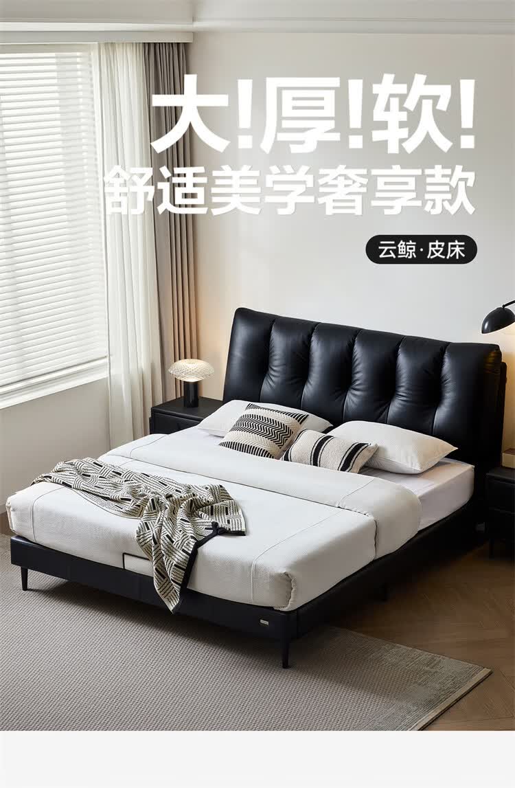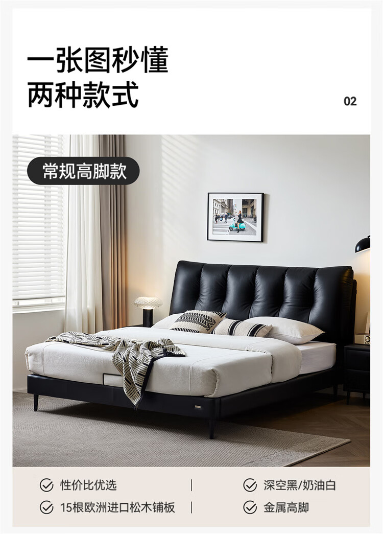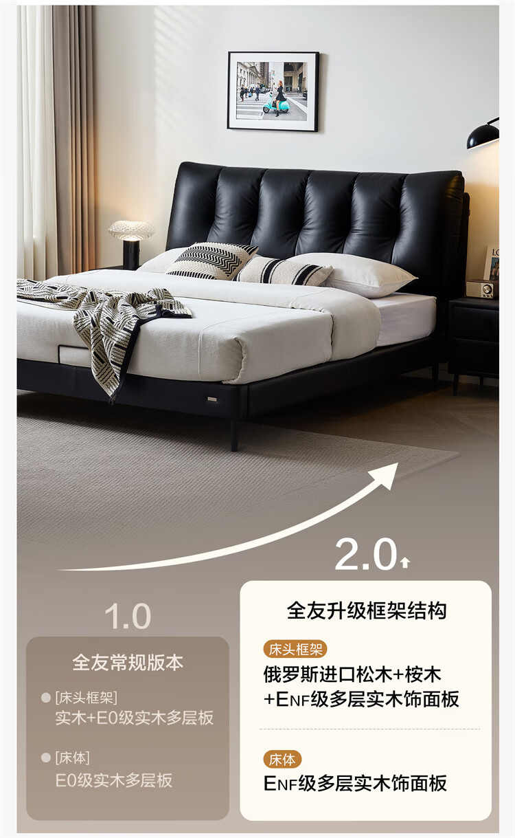 全友家居现代简约皮艺床家用卧室轻奢高级感2026新款床加床垫一套组合 【母婴级牛皮 | 深空黑 | 高脚床】 1.8米x2米 单床
