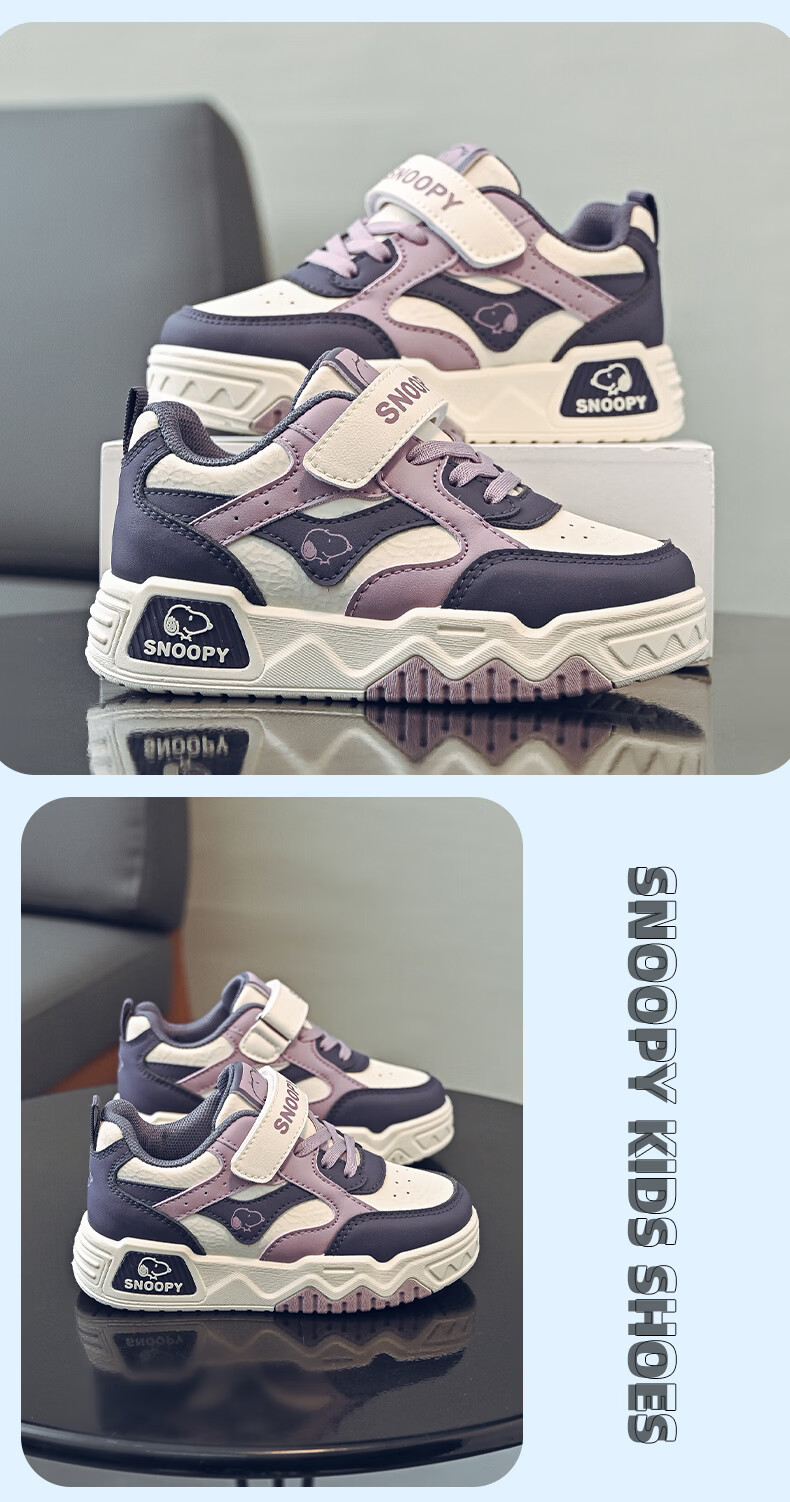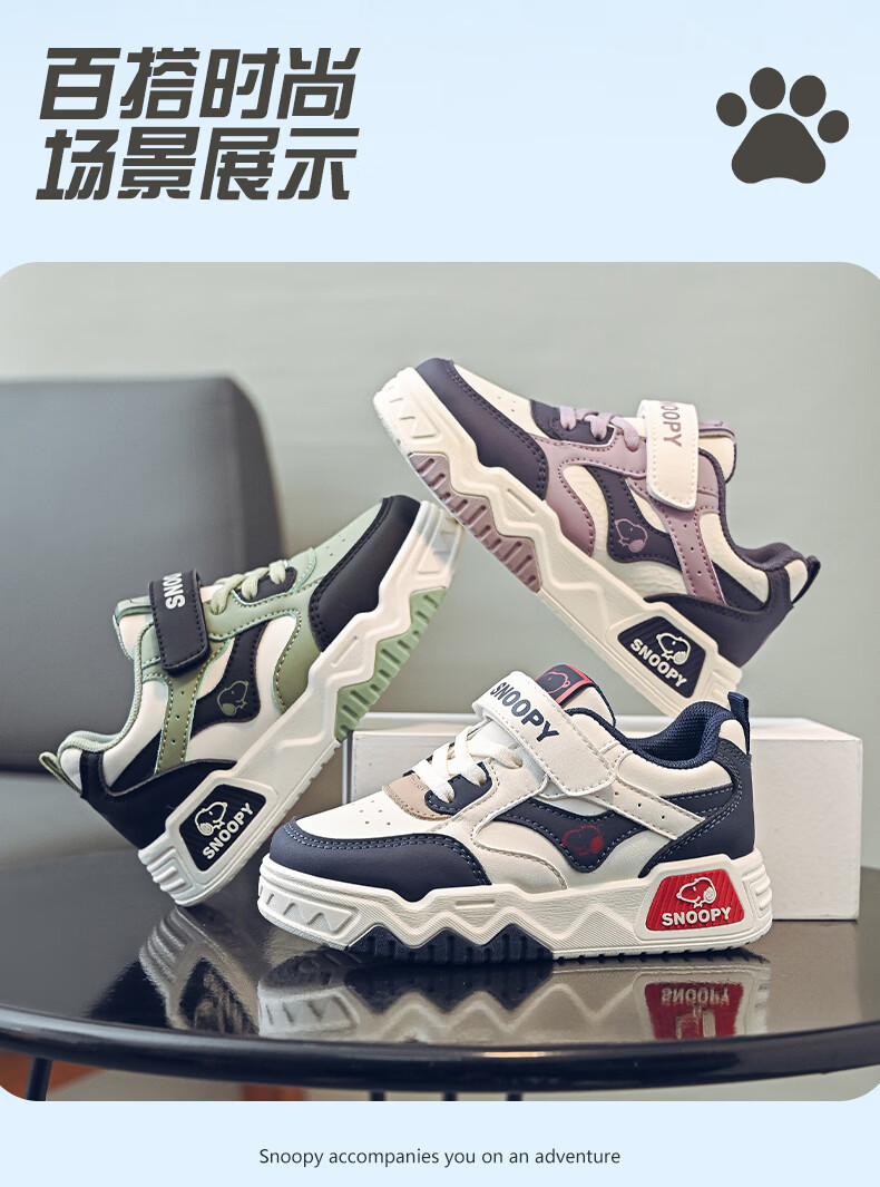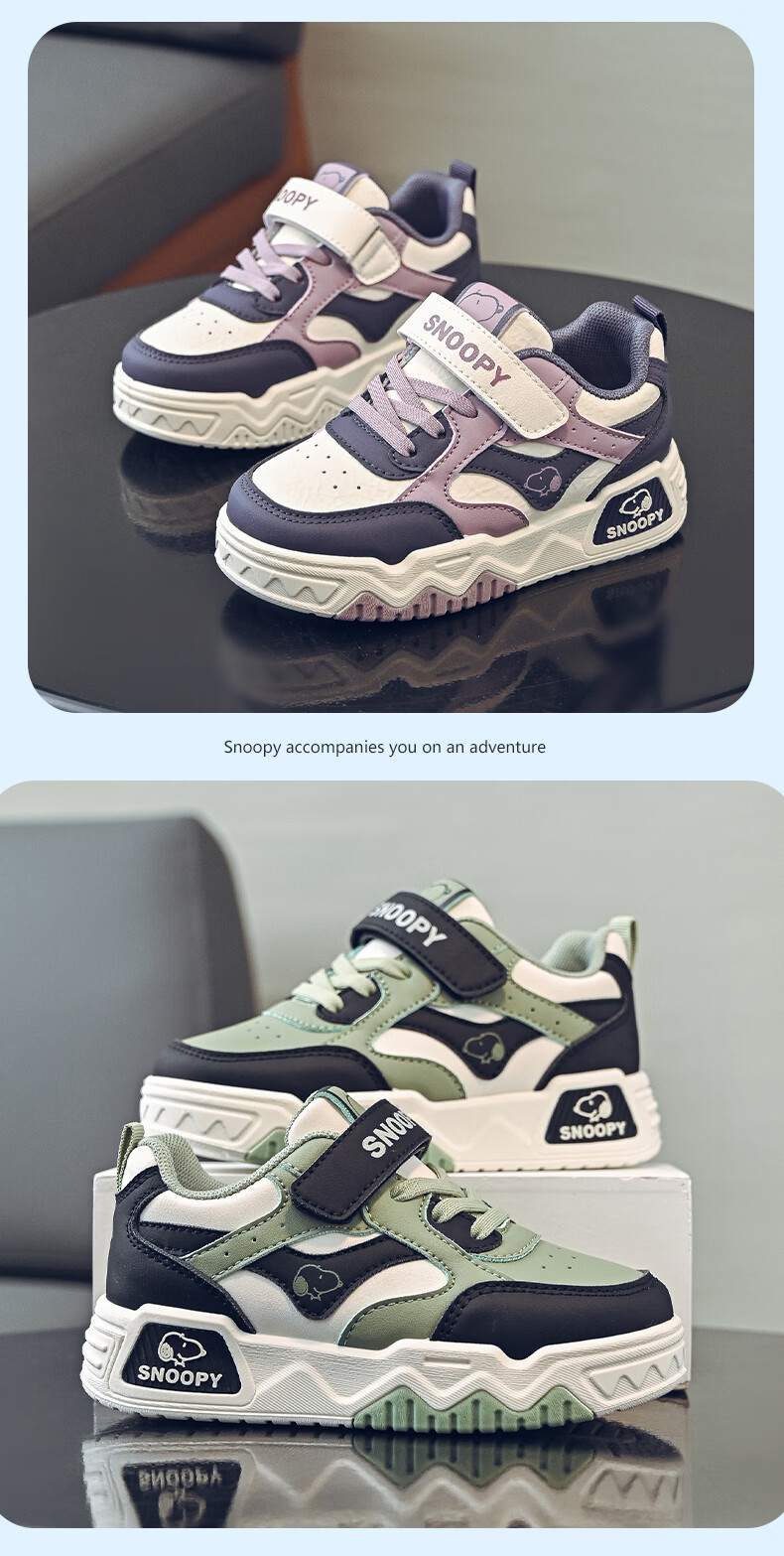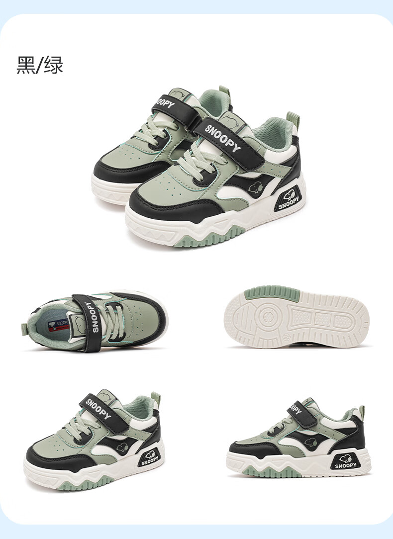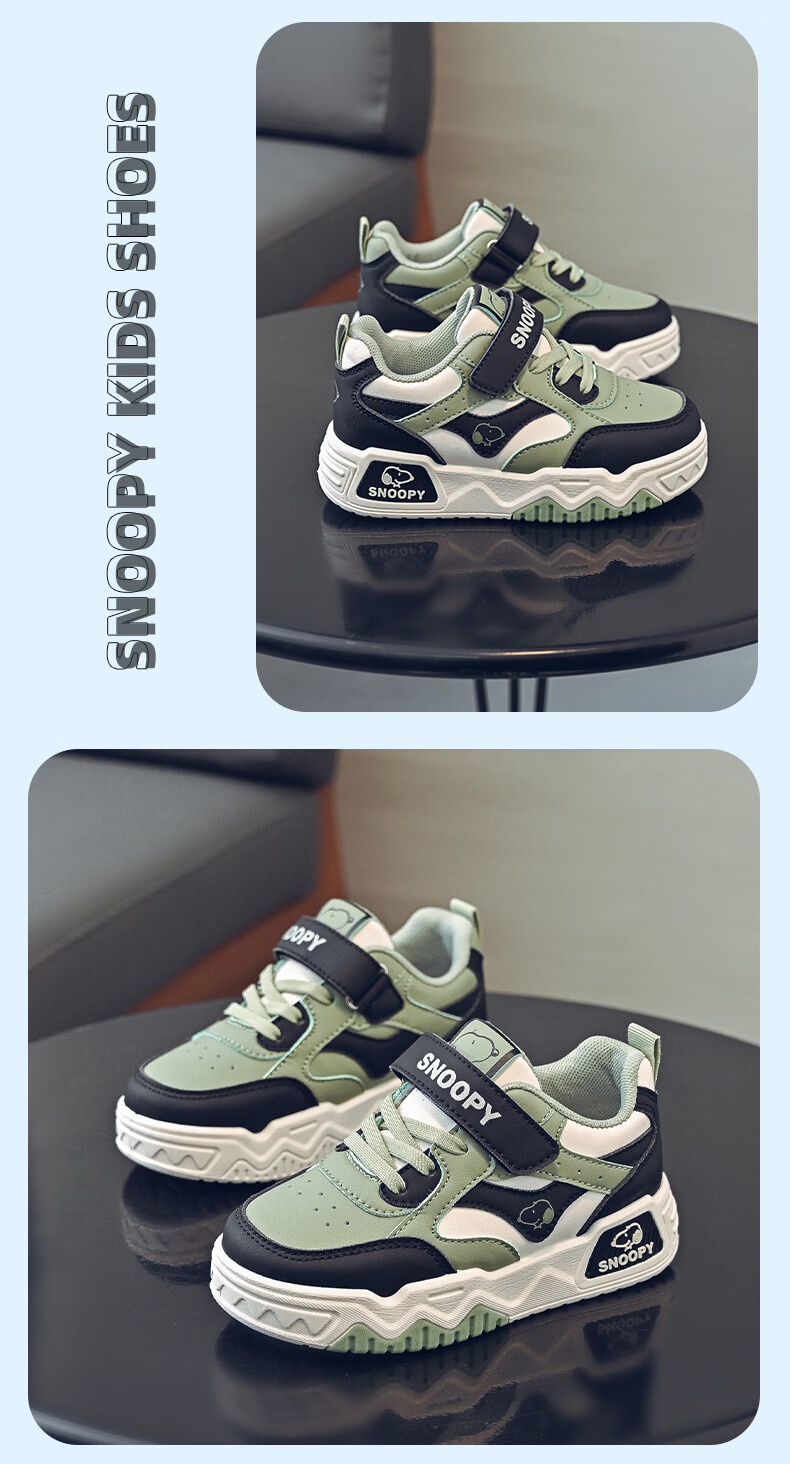 史努比童鞋女童板鞋低帮高颜值皮面防水2026春季新款休闲百搭儿童运动鞋 黑/绿 38 内长24.3/脚长23.3