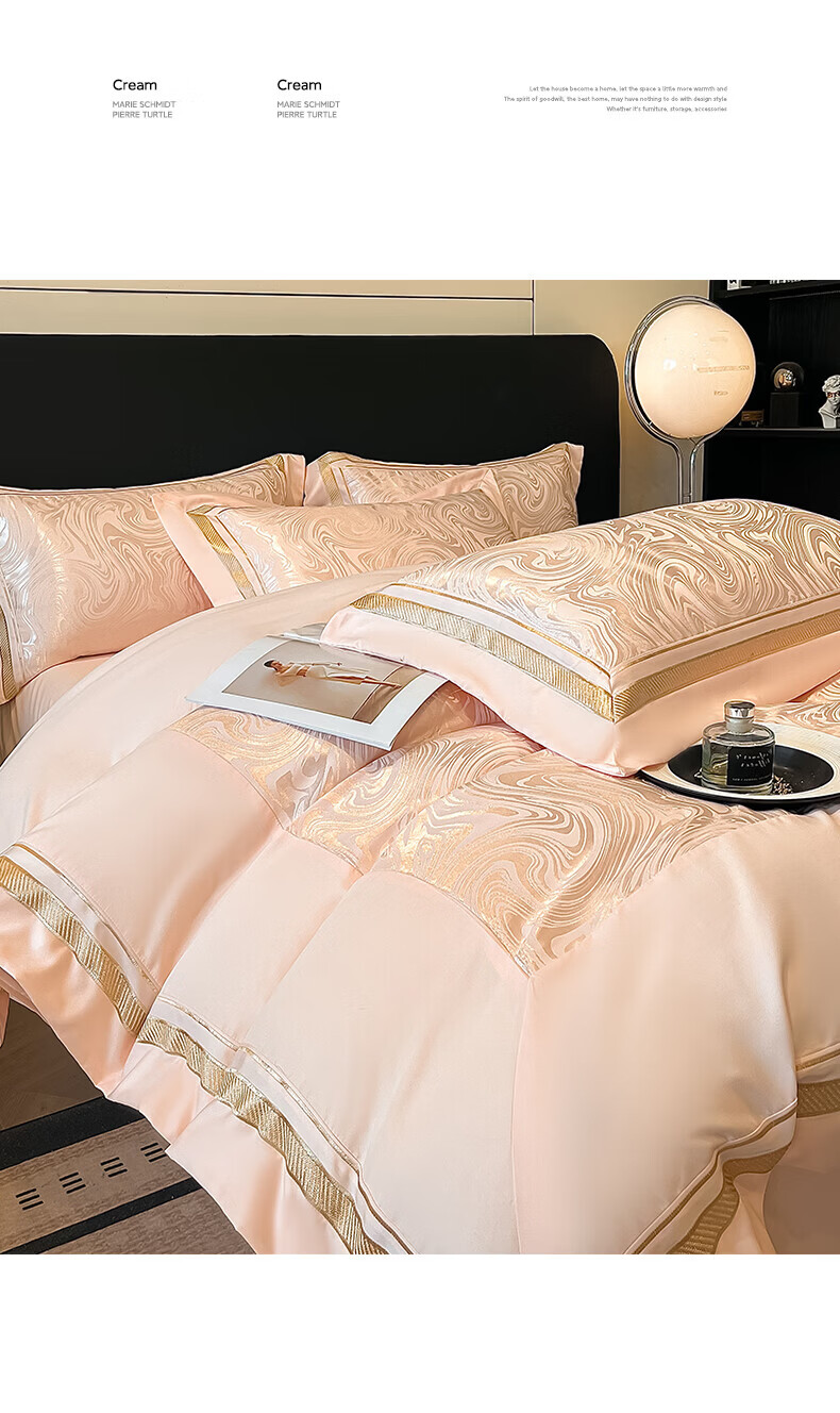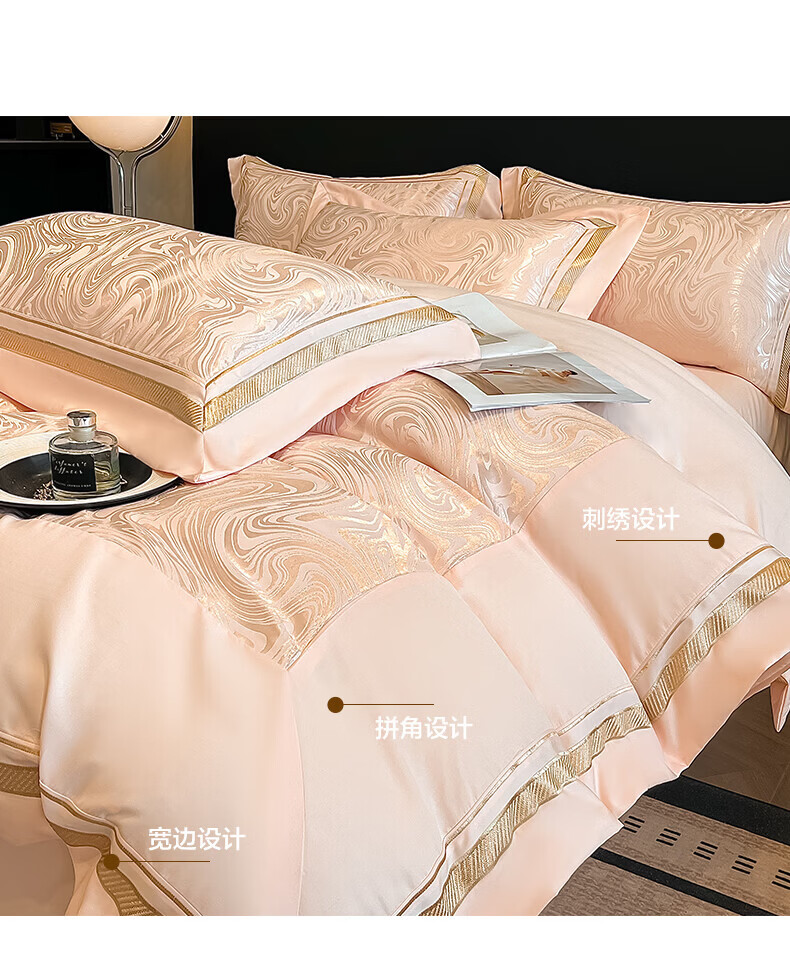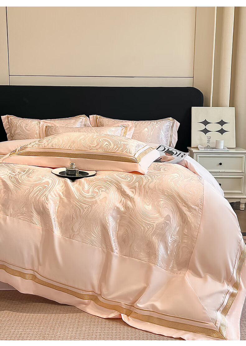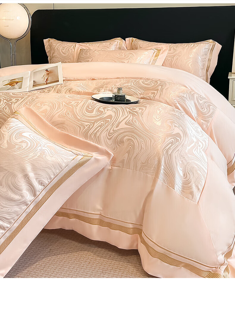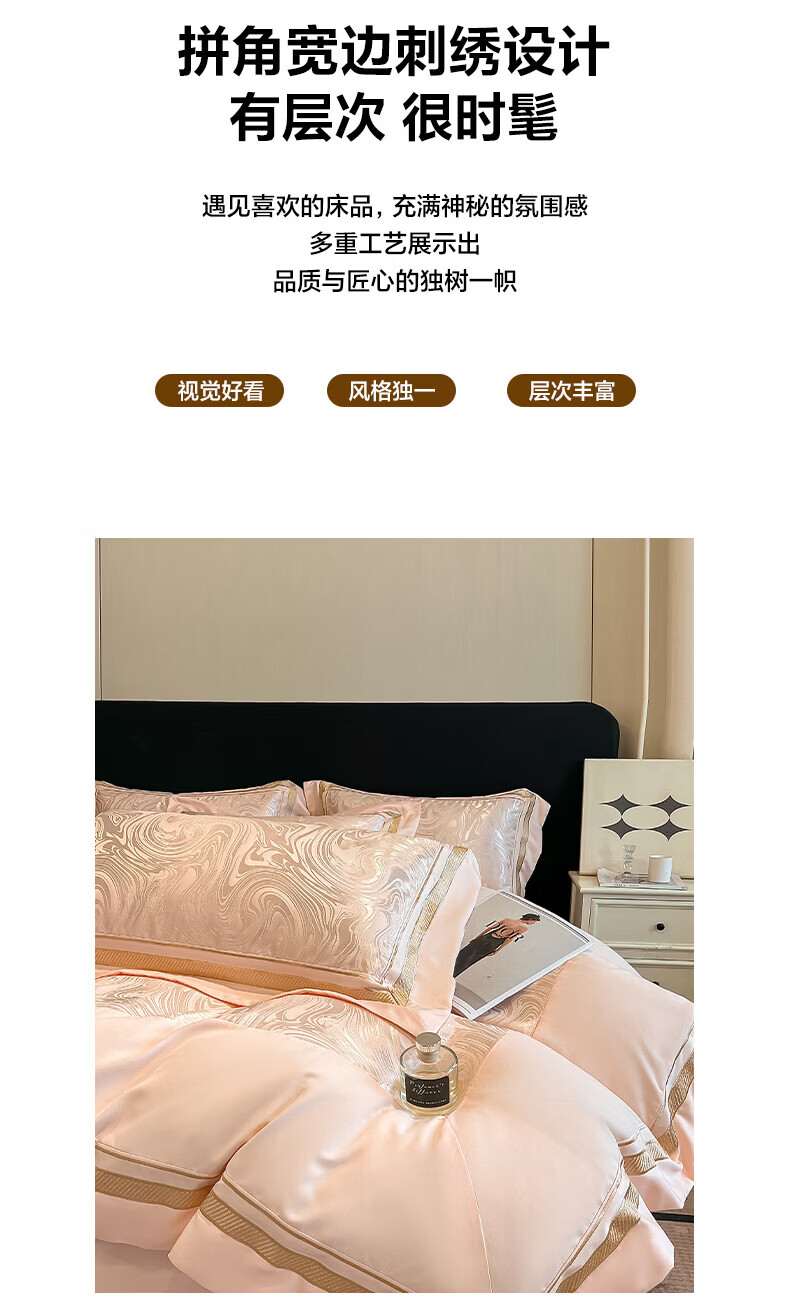 水星家纺100支床上四件套纯棉轻奢贡缎提花全棉床单纯棉被套床品 海韵-香槟 床笠款 2.0四件套-被套220x240