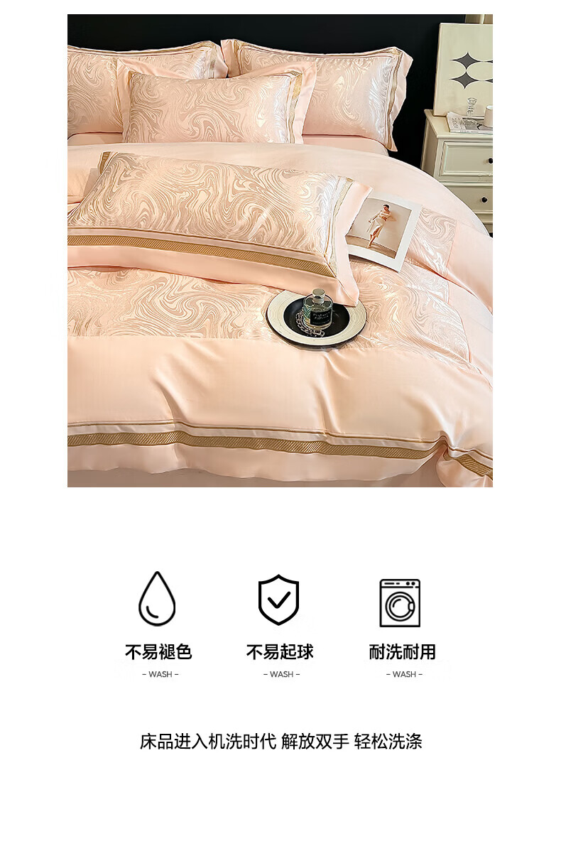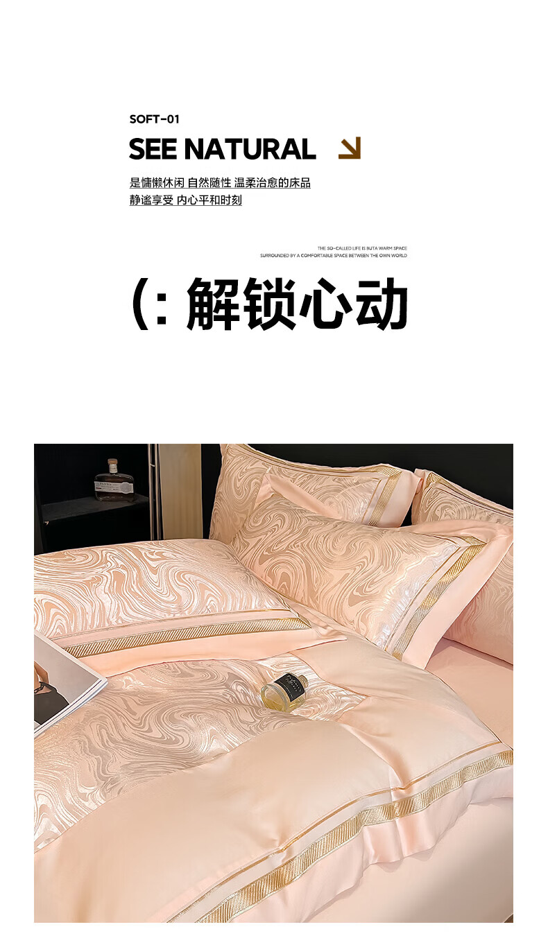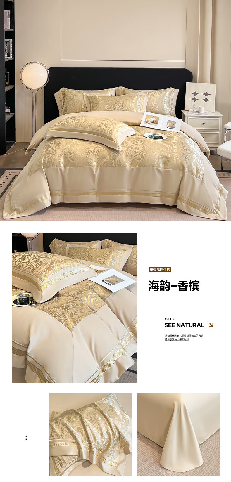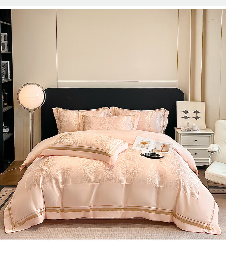 水星家纺100支床上四件套纯棉轻奢贡缎提花全棉床单纯棉被套床品 海韵-香槟 床笠款 2.0四件套-被套220x240