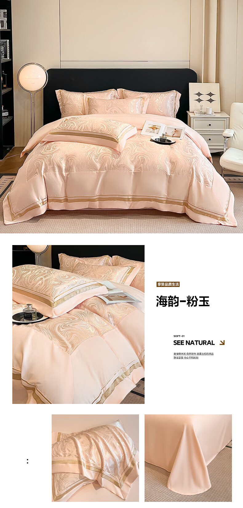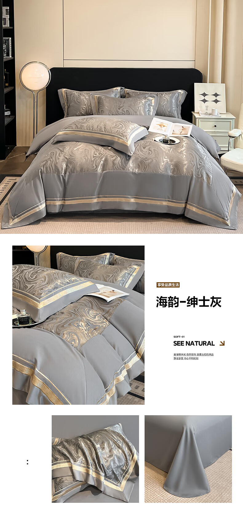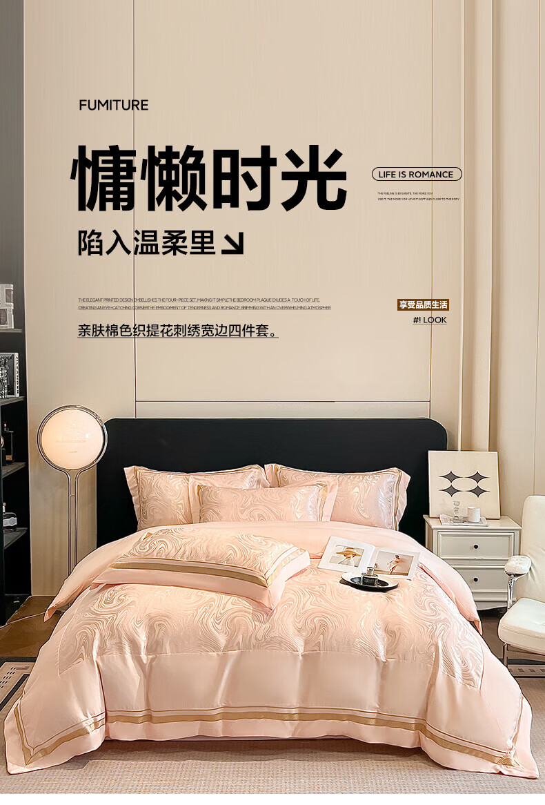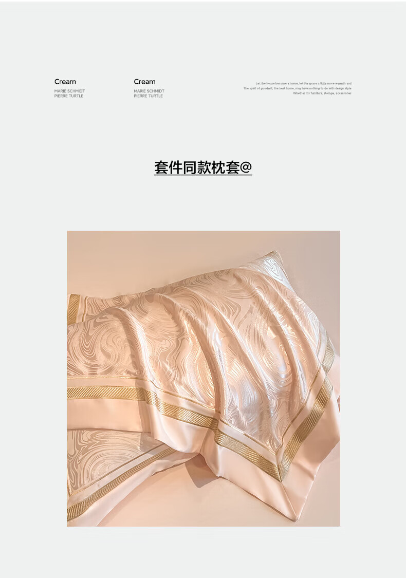 水星家纺100支床上四件套纯棉轻奢贡缎提花全棉床单纯棉被套床品 海韵-香槟 床笠款 2.0四件套-被套220x240