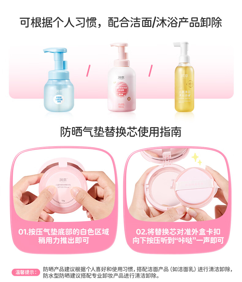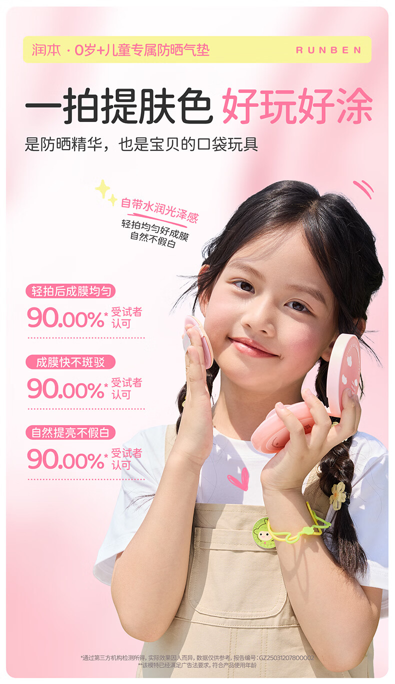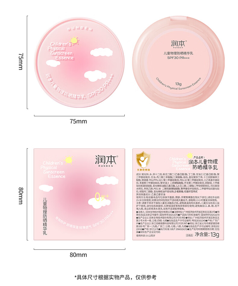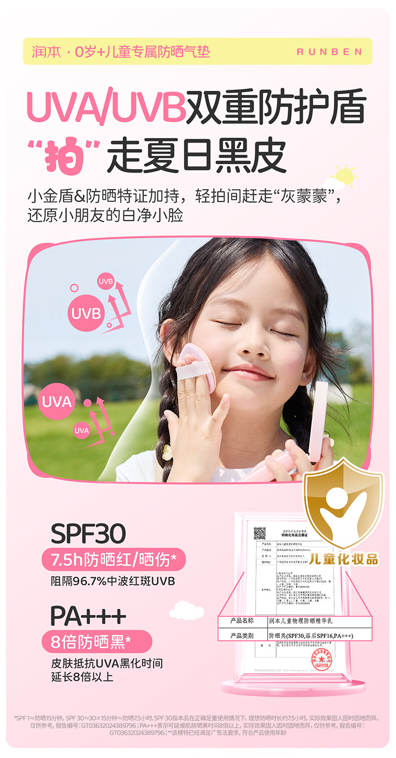 润本儿童物理防晒精华乳防晒气垫轻巧出行防晒SPF30 PA+++ 13g 1瓶 【不假白 快成膜】防晒气垫正装