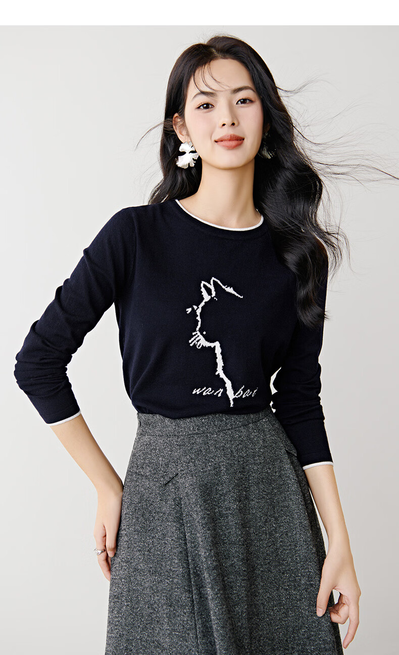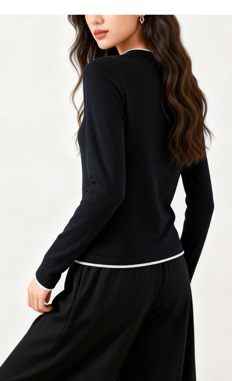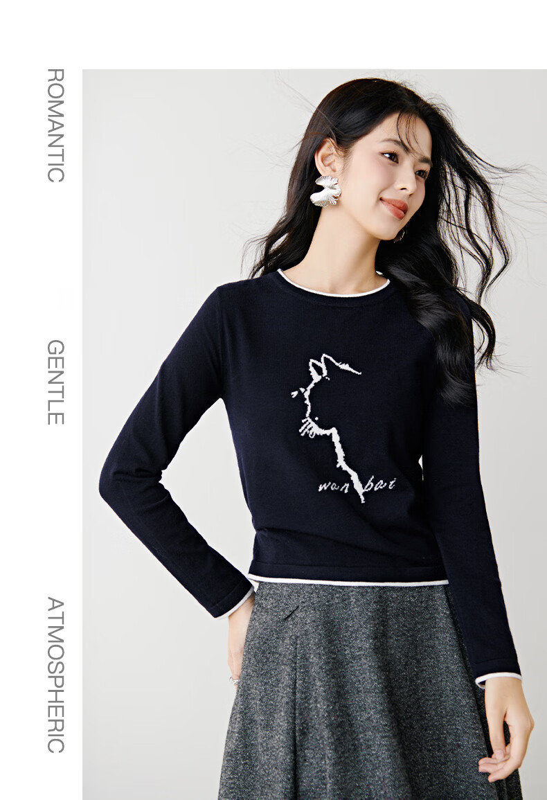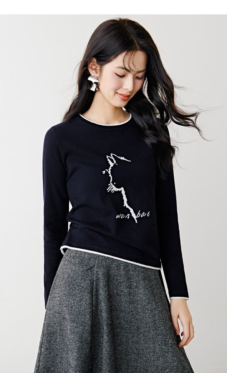 晚白【新品】2026春款时尚撞色圆领毛衣柔软舒适百搭针织衫女 藏青色 L