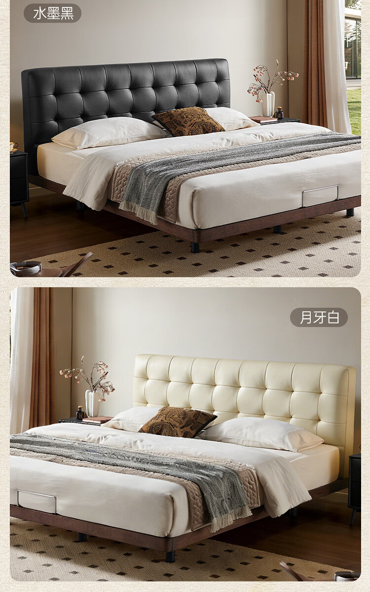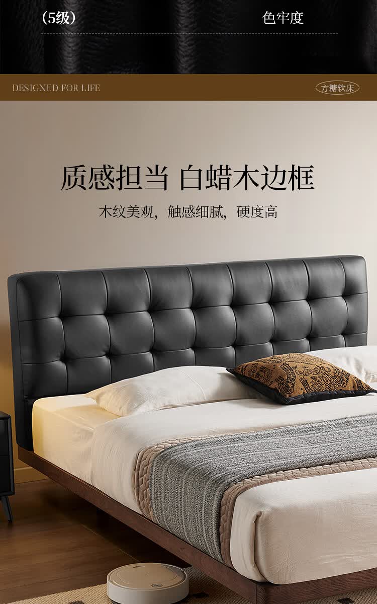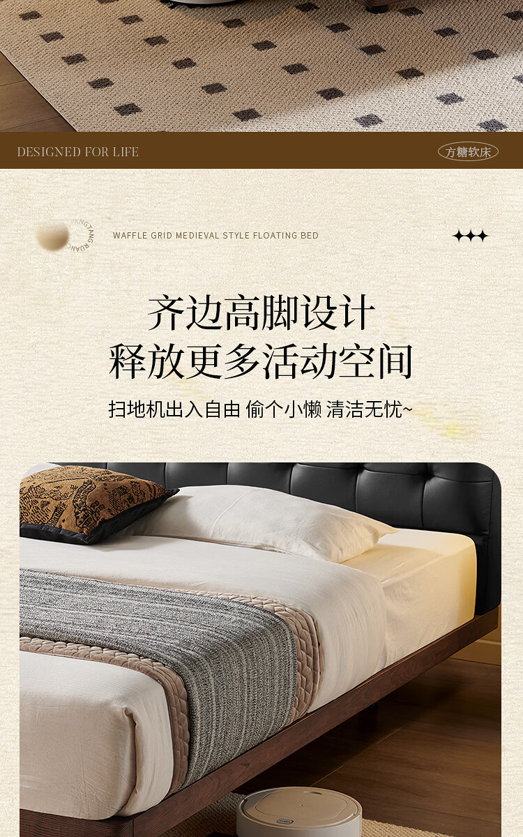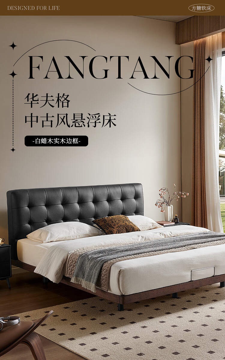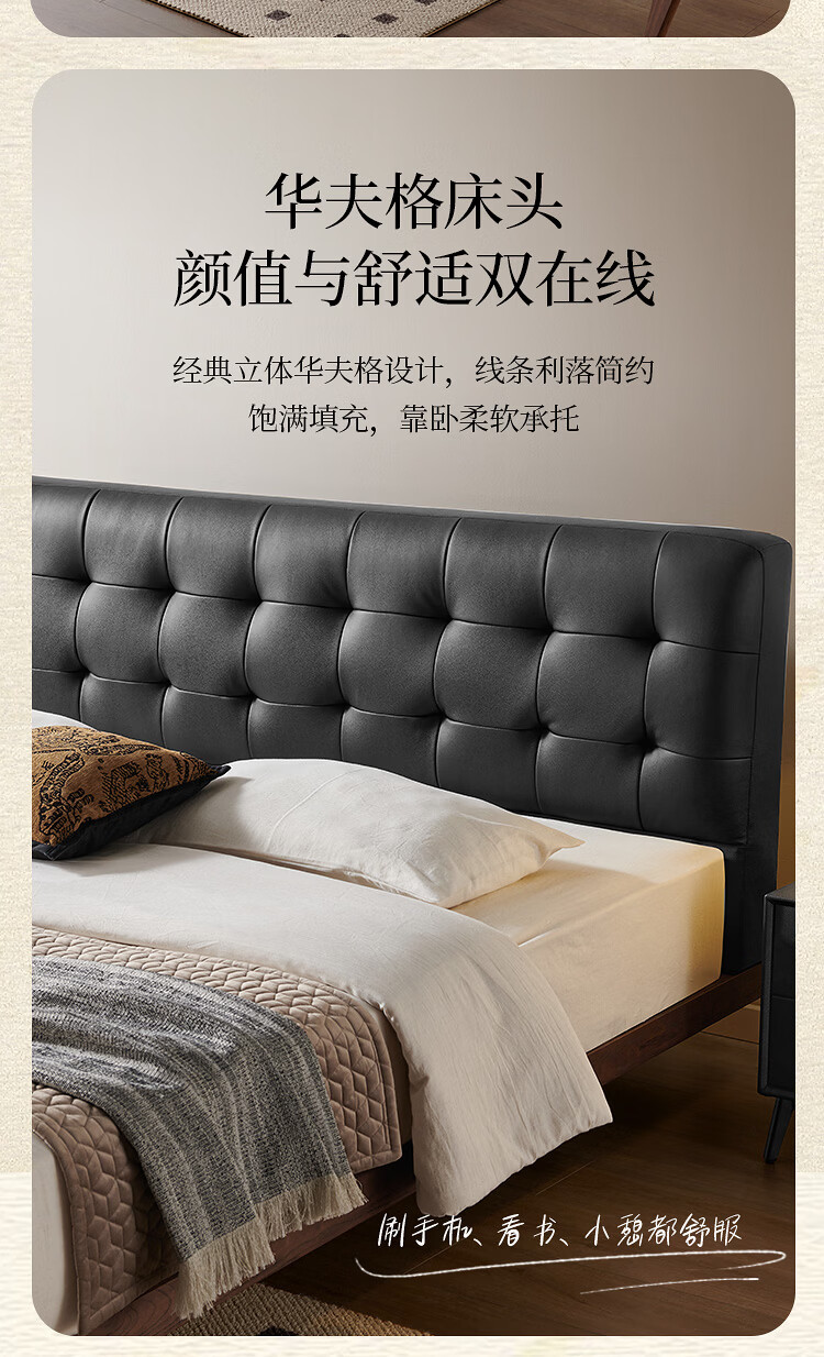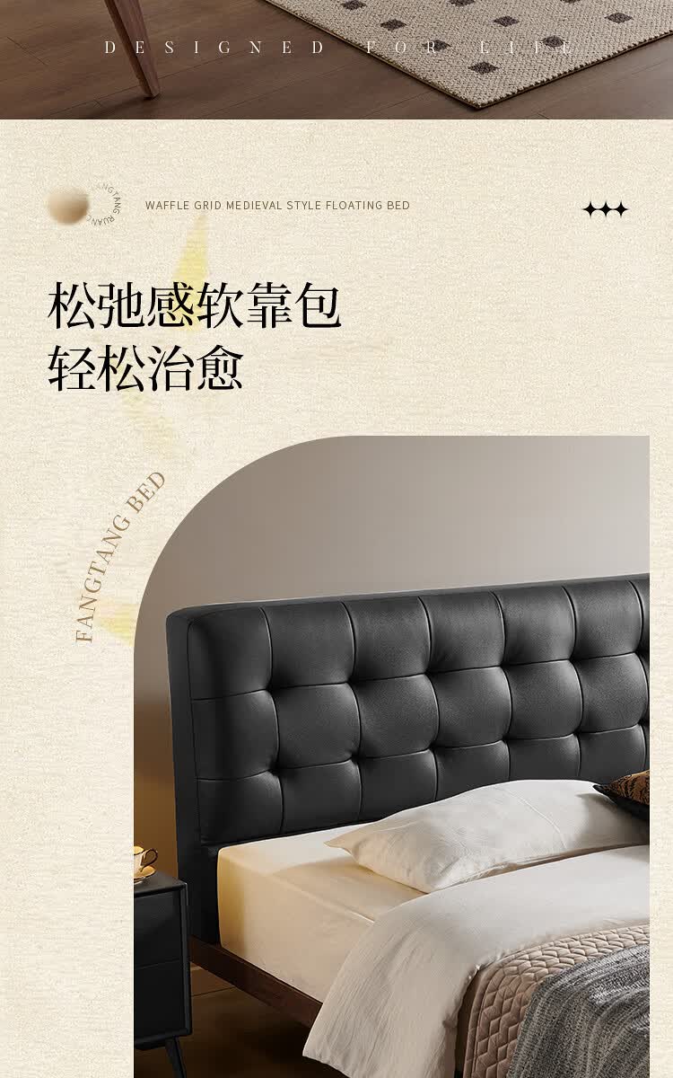 CBD家居华夫格真皮床复古风悬浮床实木软包薄床头双人皮艺床方糖 水墨黑单床 1800*2000