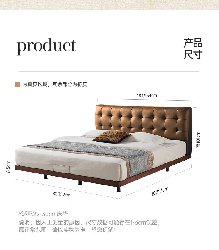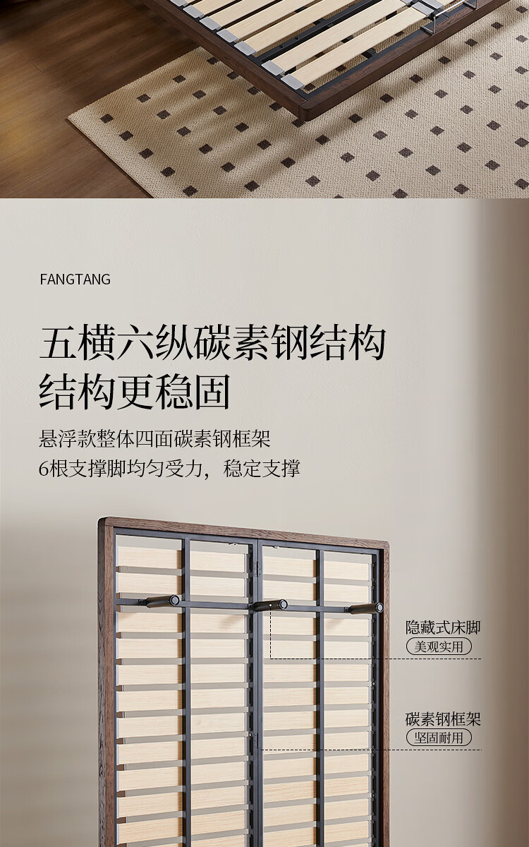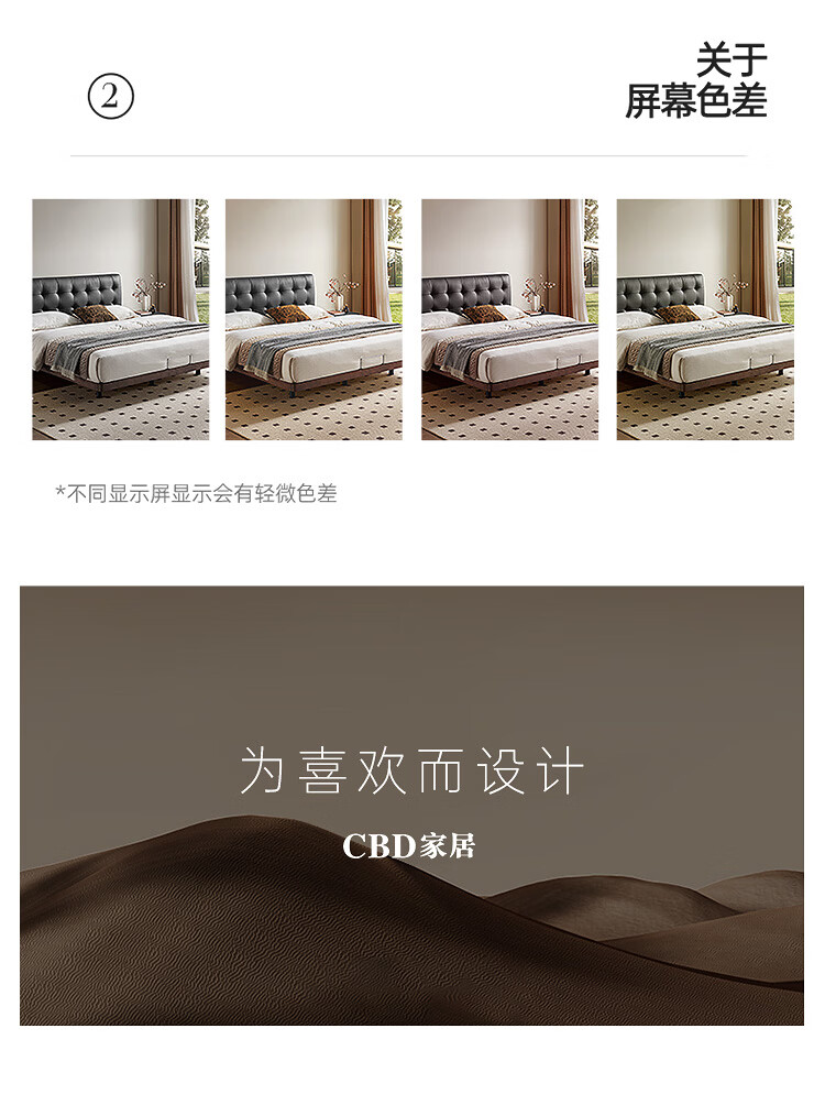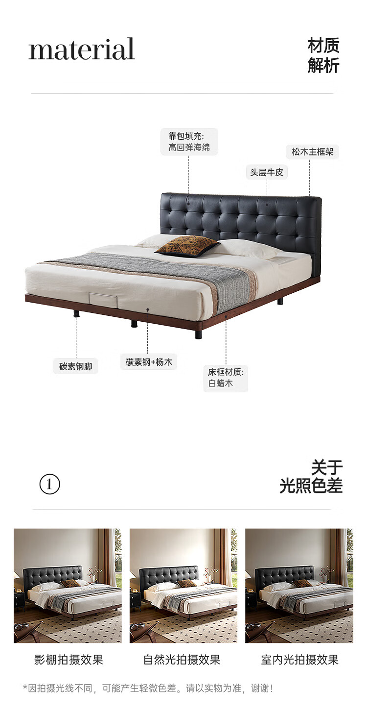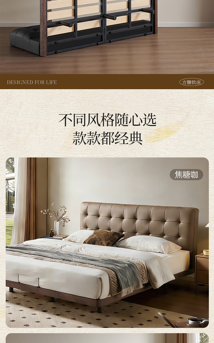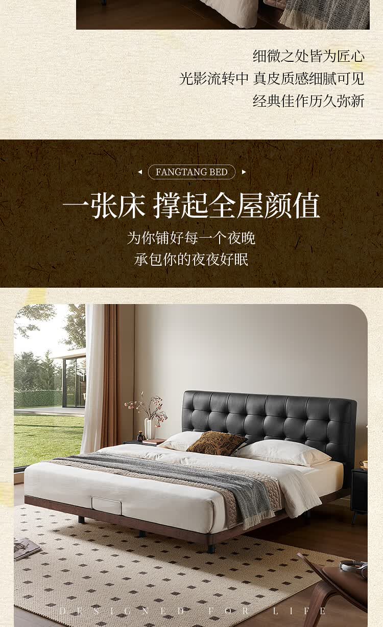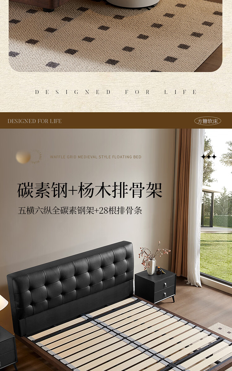 CBD家居华夫格真皮床复古风悬浮床实木软包薄床头双人皮艺床方糖 水墨黑单床 1800*2000