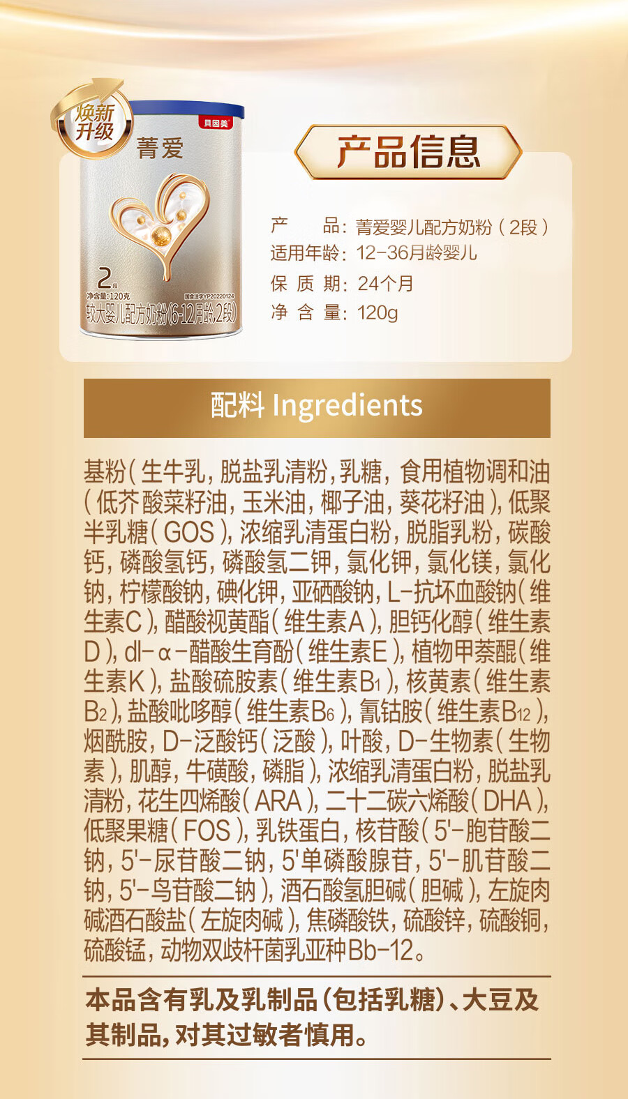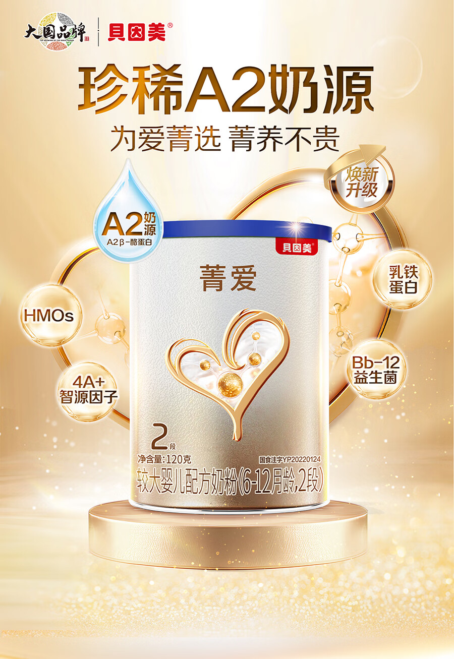 贝因美【焕新】菁爱A2奶源婴儿配方奶粉小罐2段120g含A2-β酪蛋白