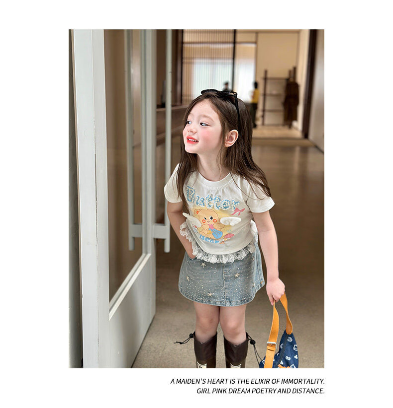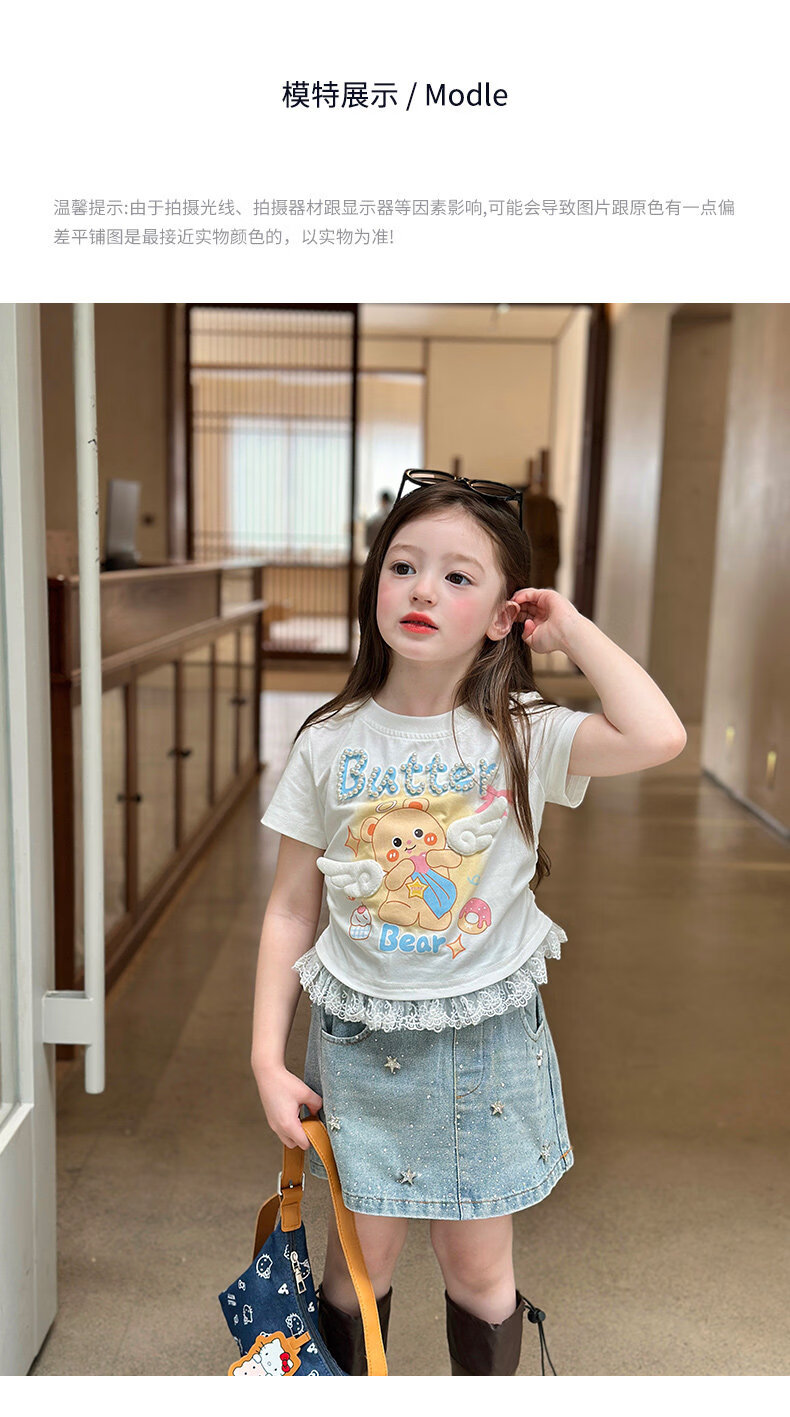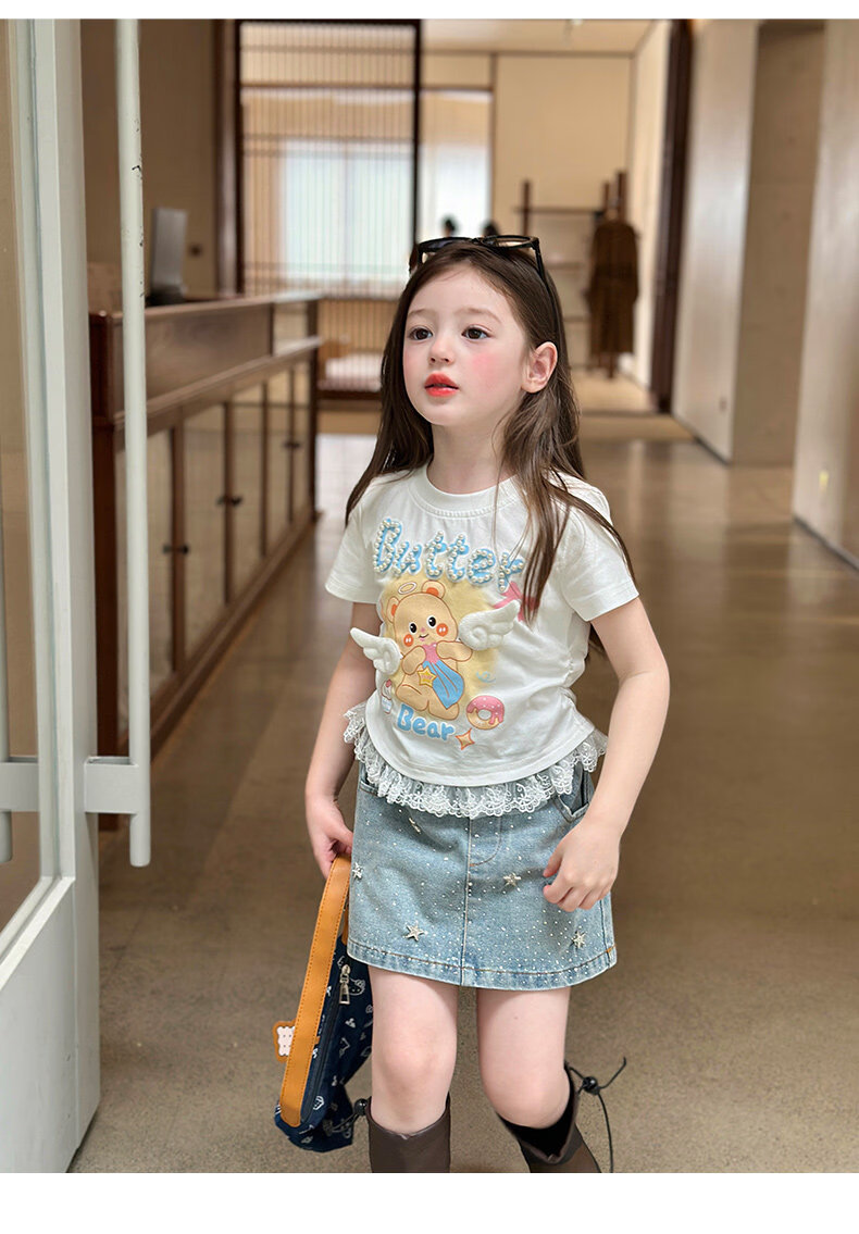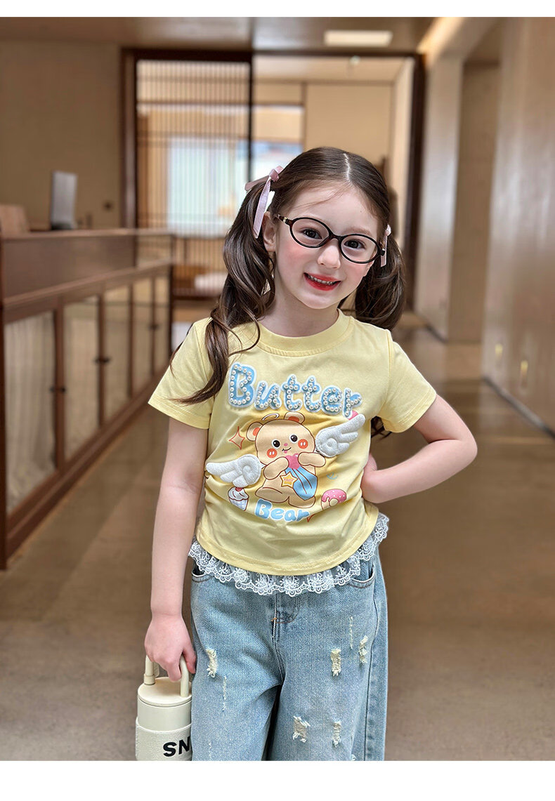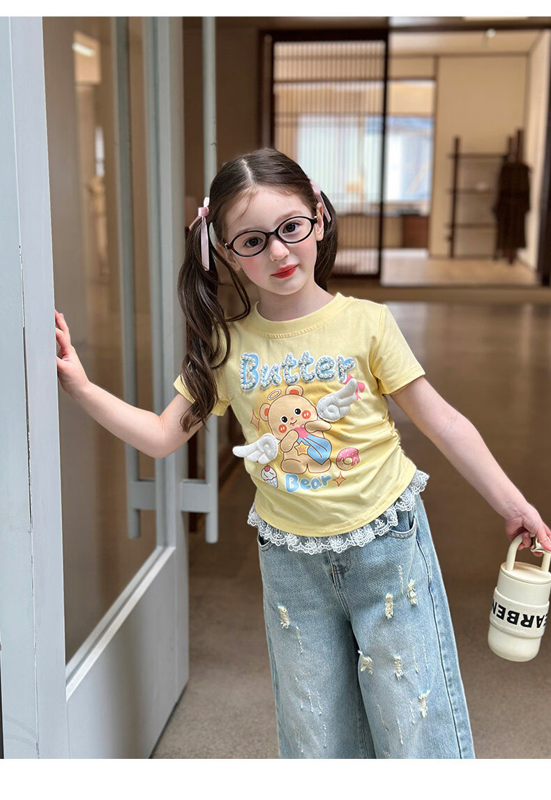 栀了成长记童装女童可爱卡通短款上衣2026春季儿童蕾丝边短袖T恤 蓝色牛仔裤 100 cm