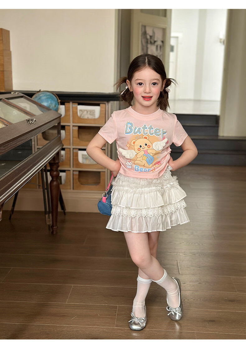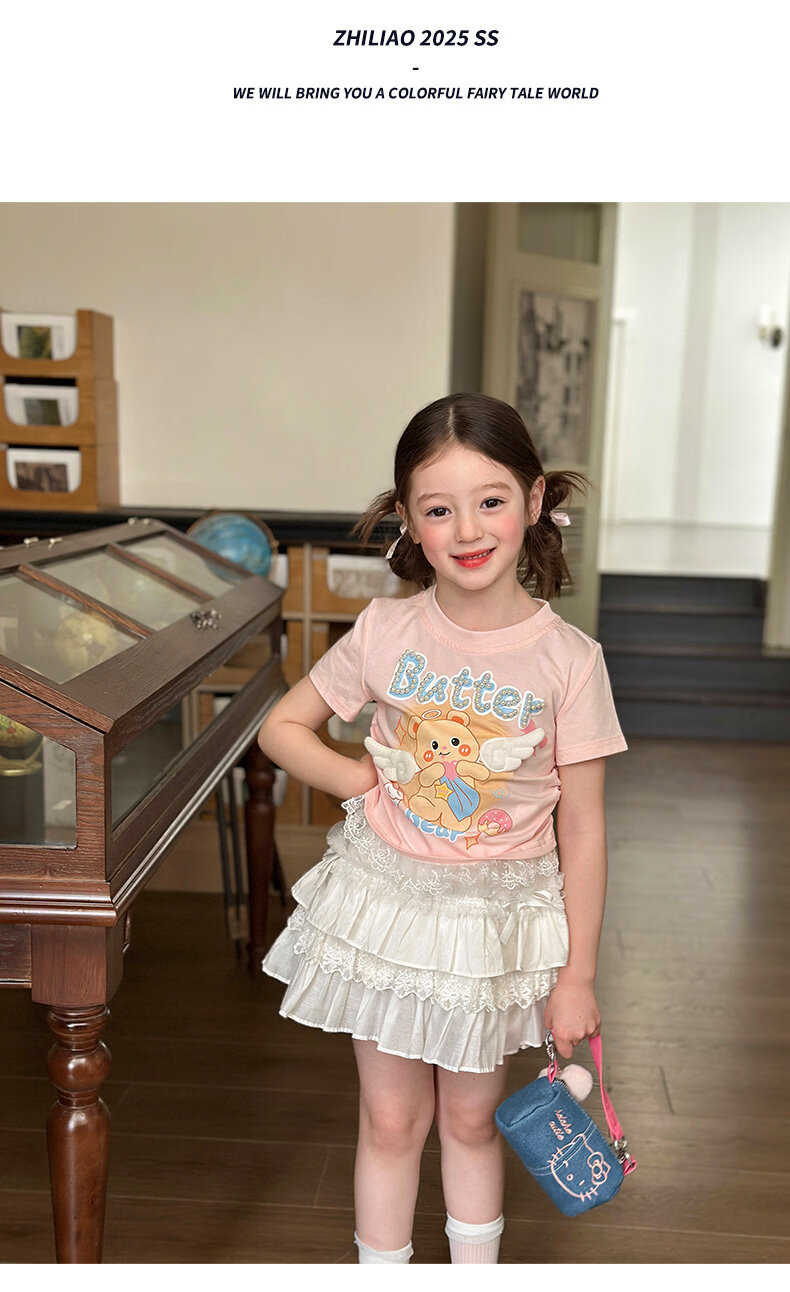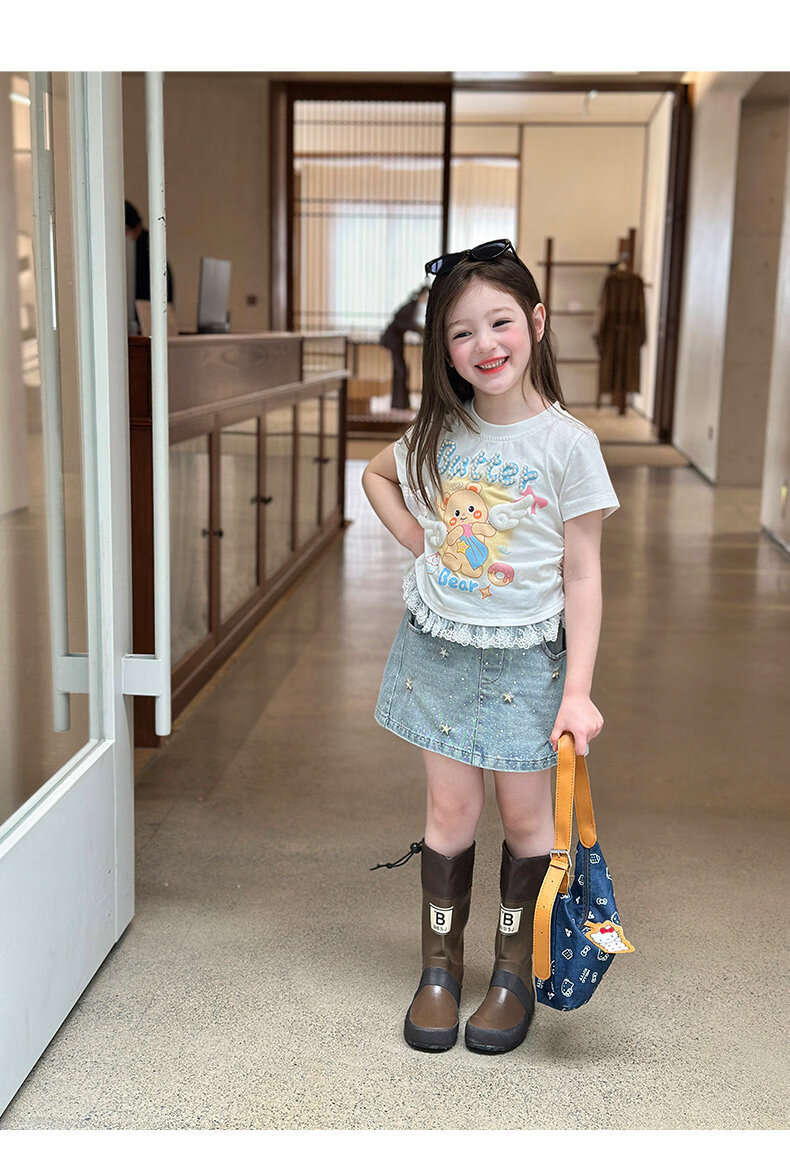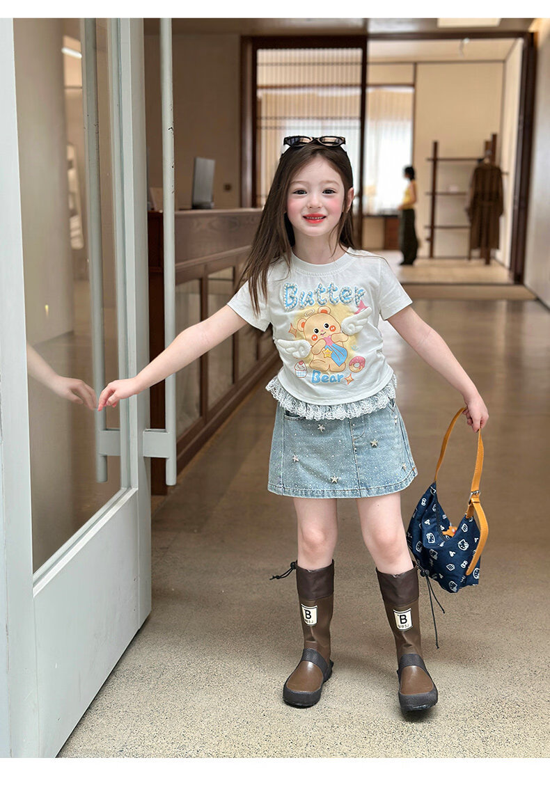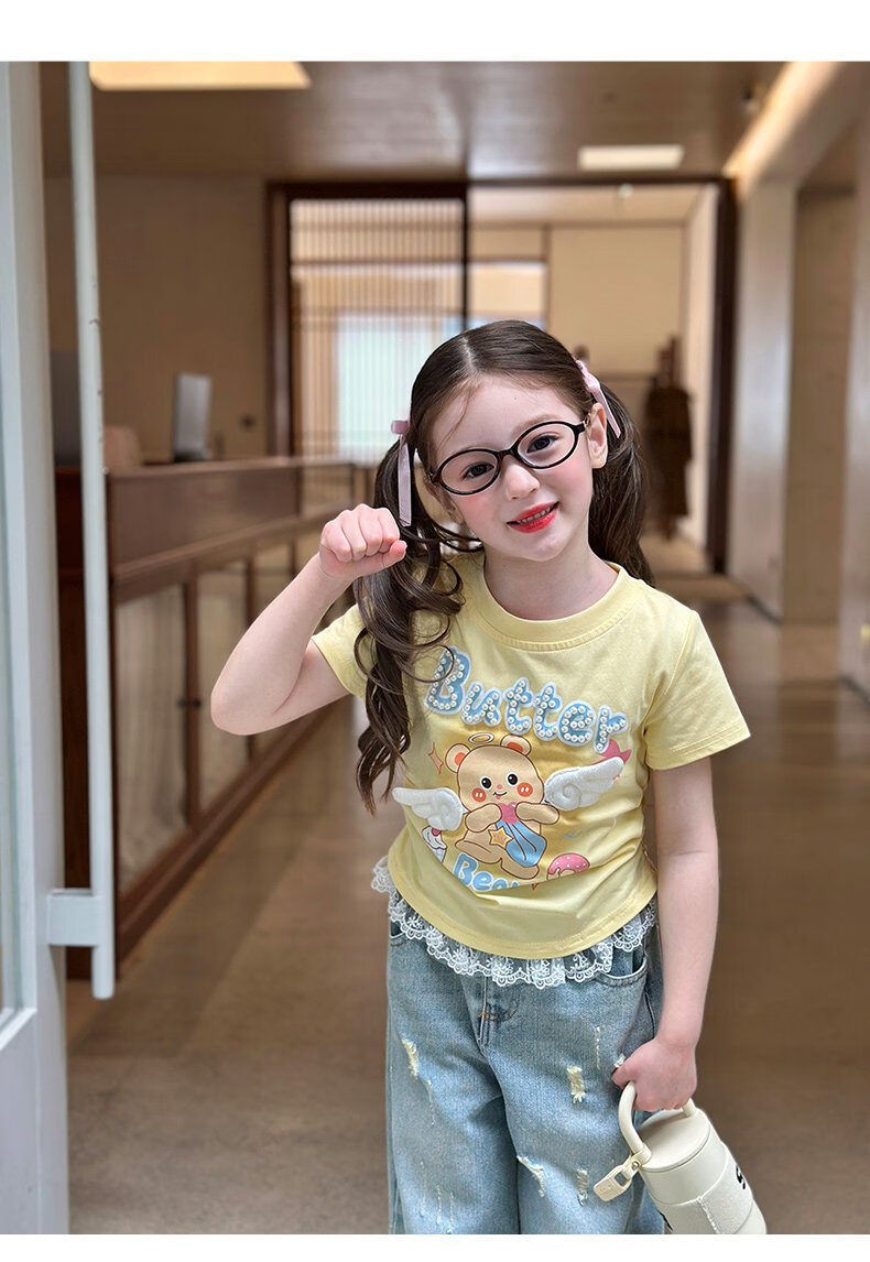 栀了成长记童装女童可爱卡通短款上衣2026春季儿童蕾丝边短袖T恤 蓝色牛仔裤 100 cm