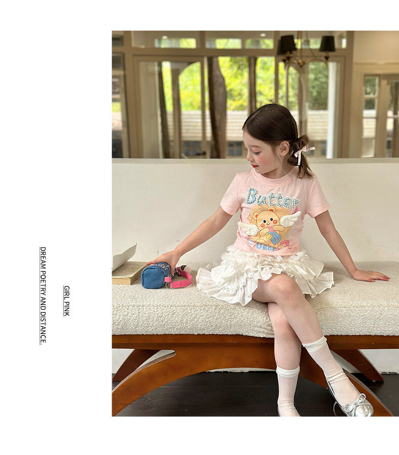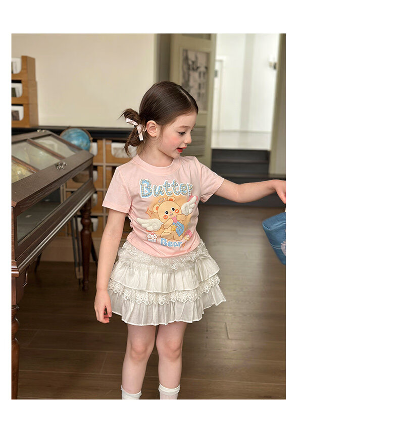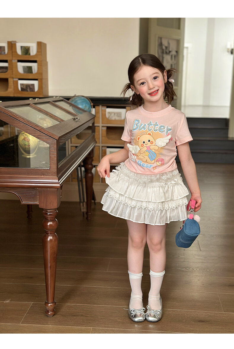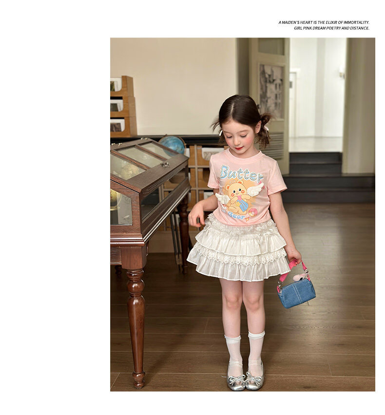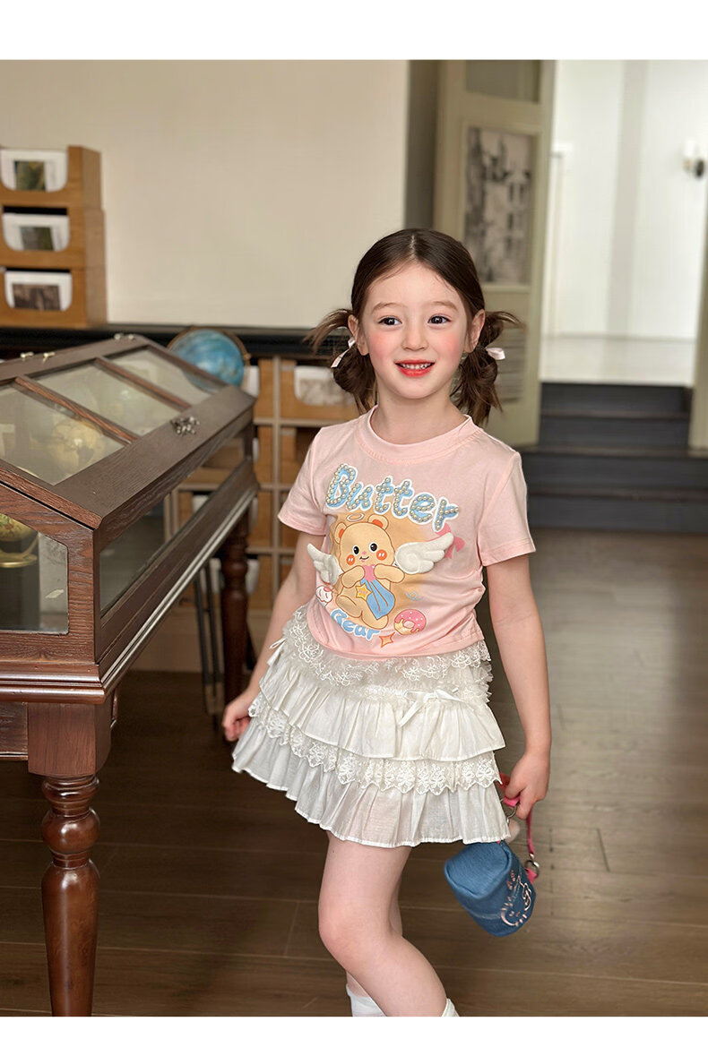 栀了成长记童装女童可爱卡通短款上衣2026春季儿童蕾丝边短袖T恤 蓝色牛仔裤 100 cm
