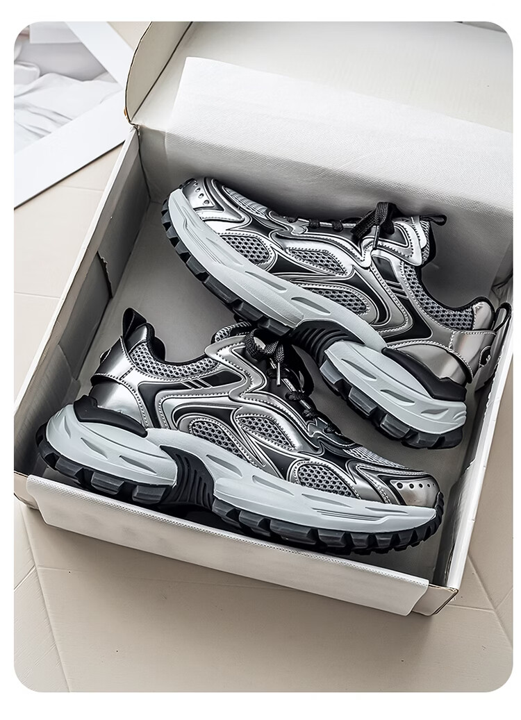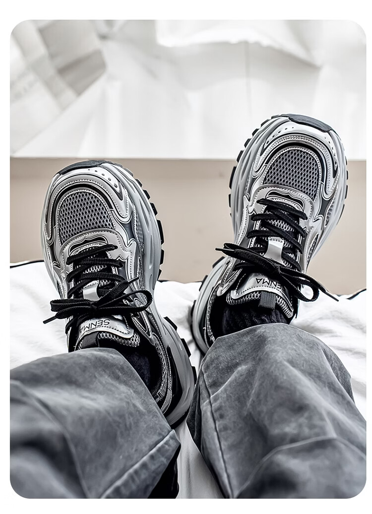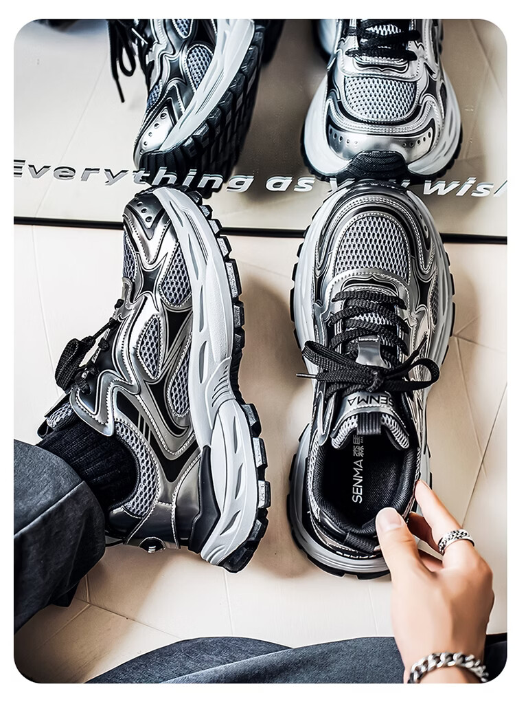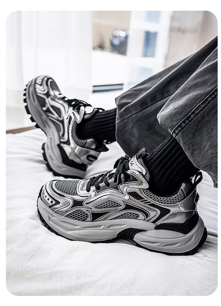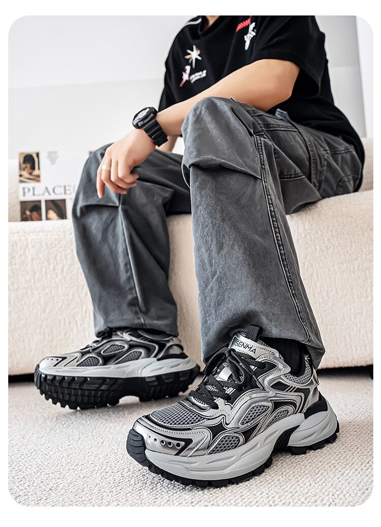 森馬男鞋2026新款春季潮牌高级感休闲百搭老爹鞋男士厚底防滑运动潮鞋 银色【基础款】 39 标准码数/现货秒发