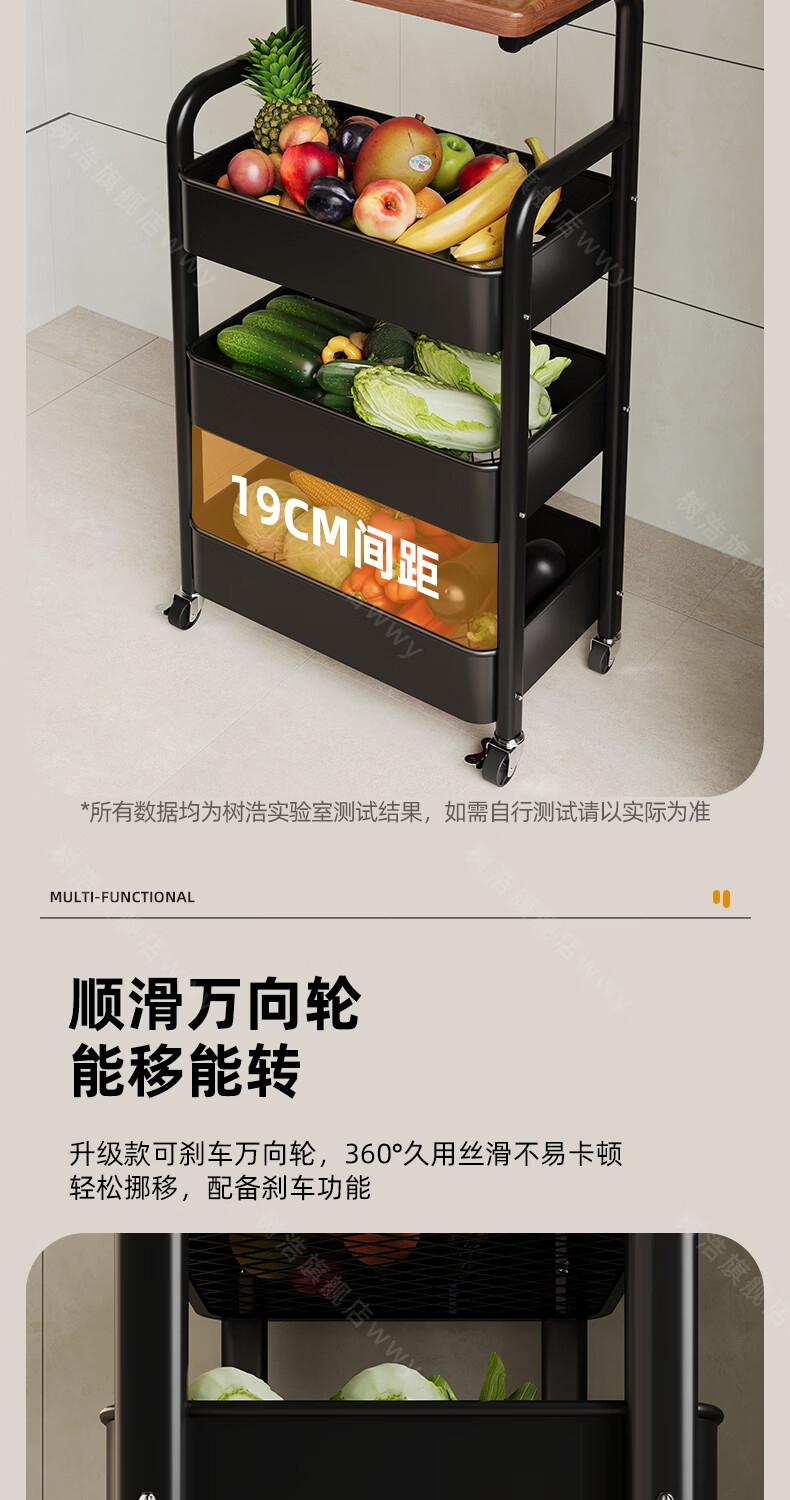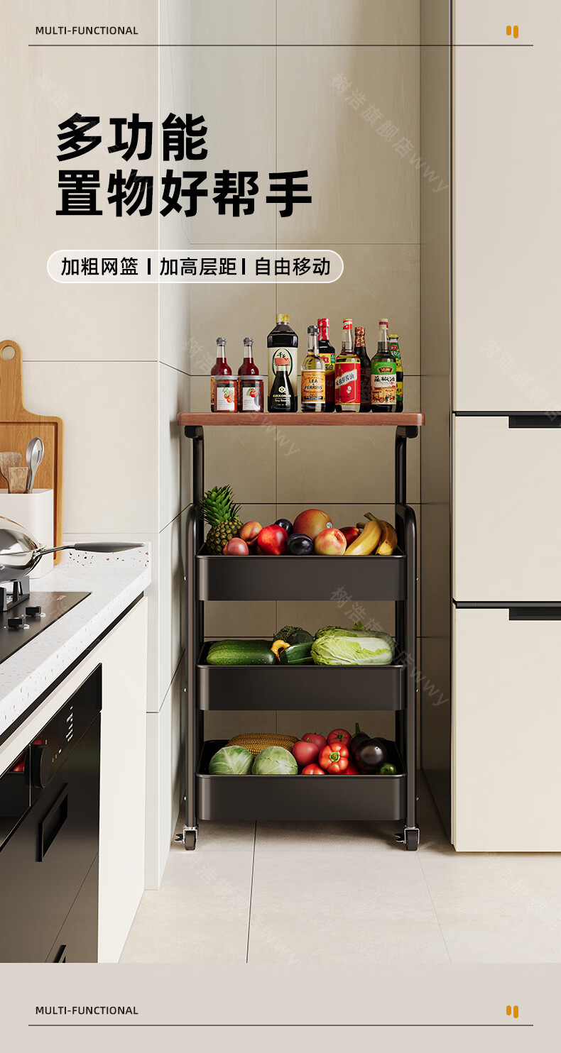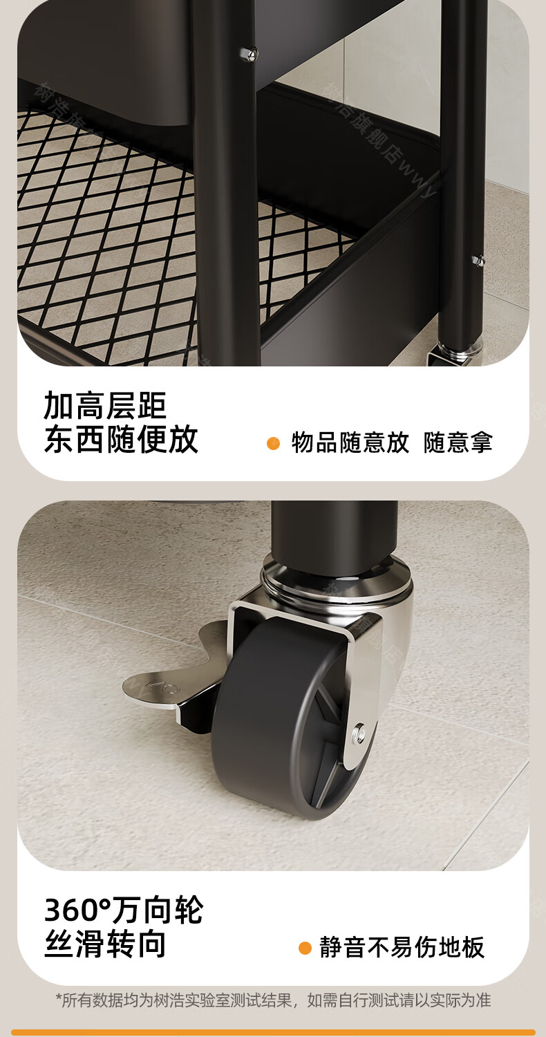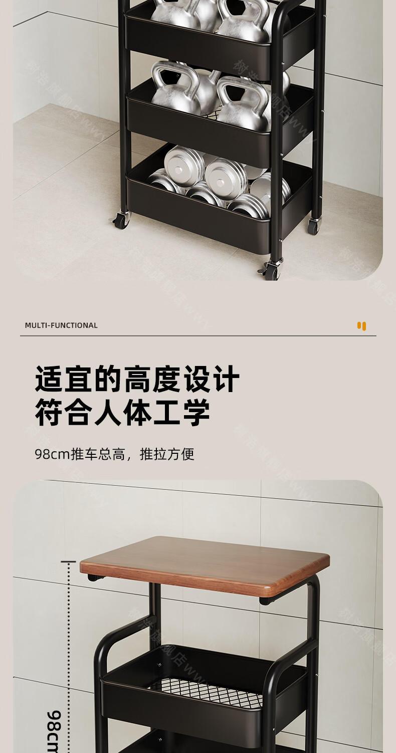 树浩移动置物架客厅多功能储物架厨房落地收纳手推车家用多层整理架子 双层【加厚升级款】碳钢置物篮-中古黑-刹车万向轮