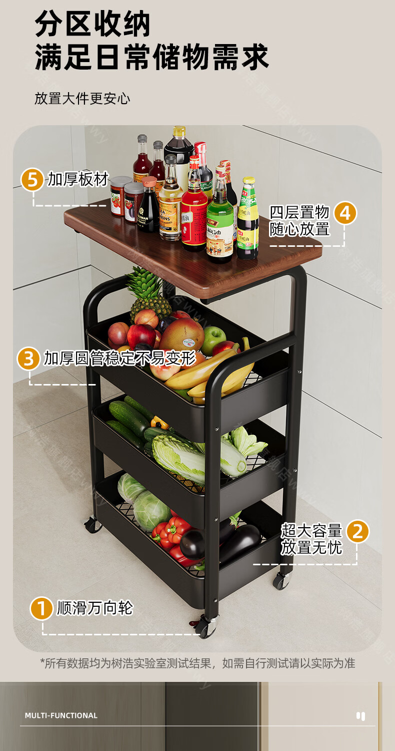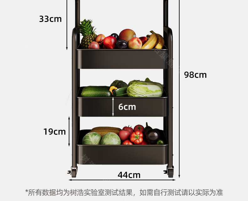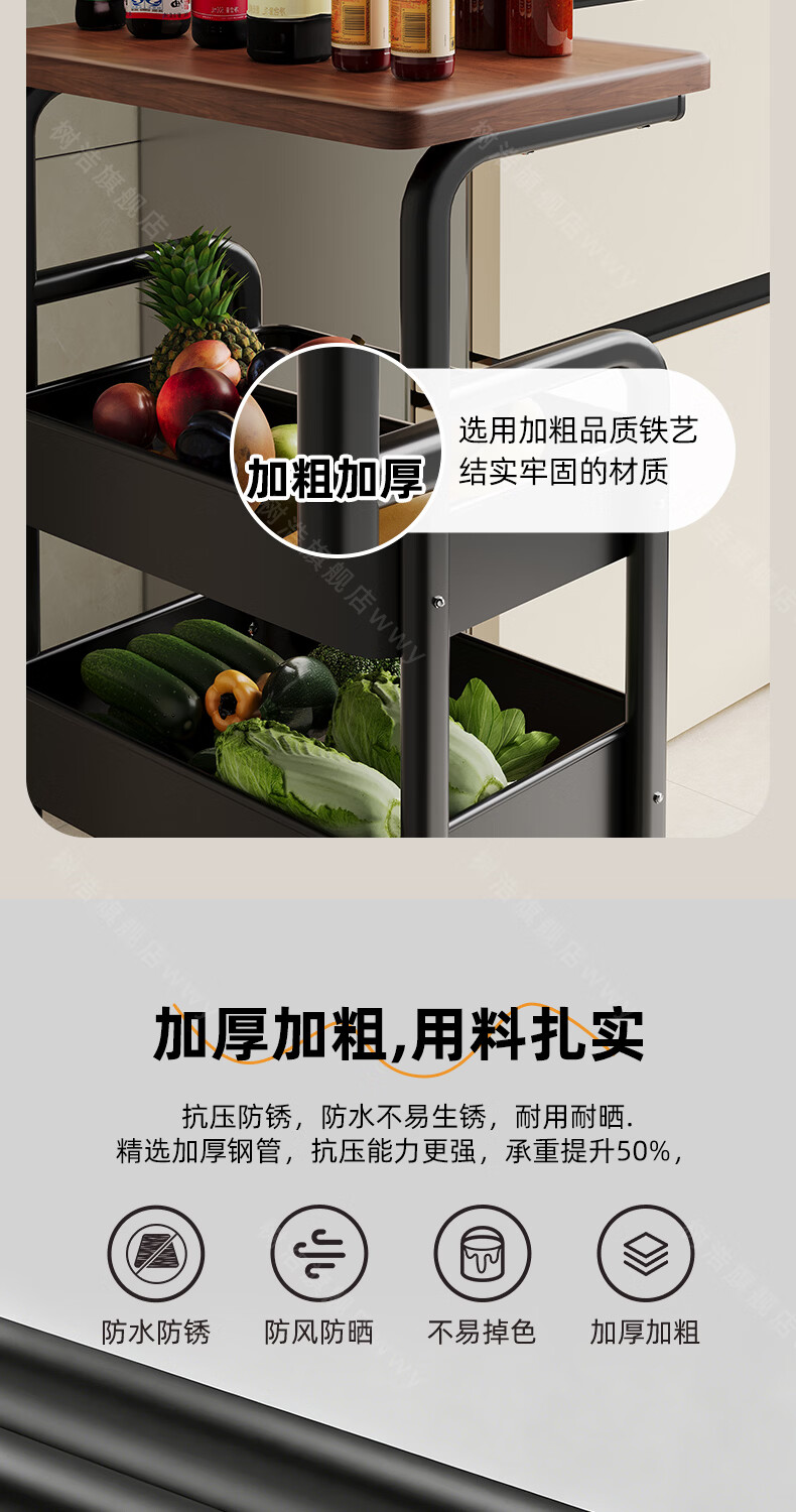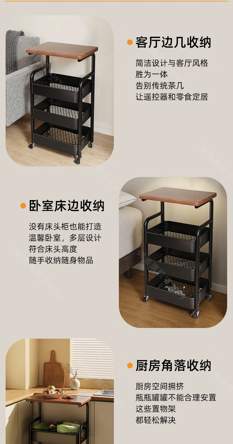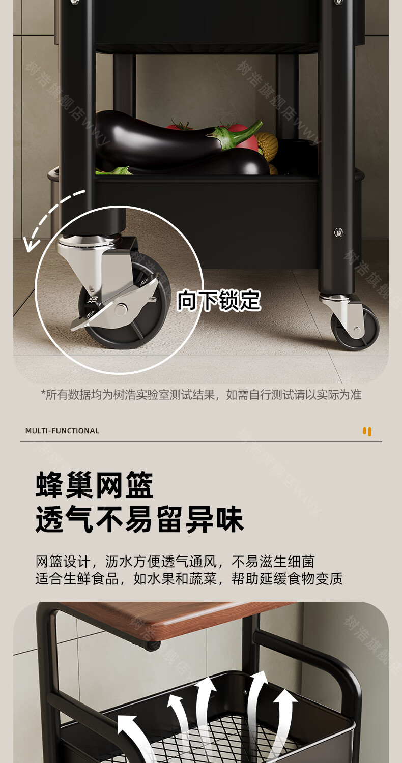 树浩移动置物架客厅多功能储物架厨房落地收纳手推车家用多层整理架子 双层【加厚升级款】碳钢置物篮-中古黑-刹车万向轮